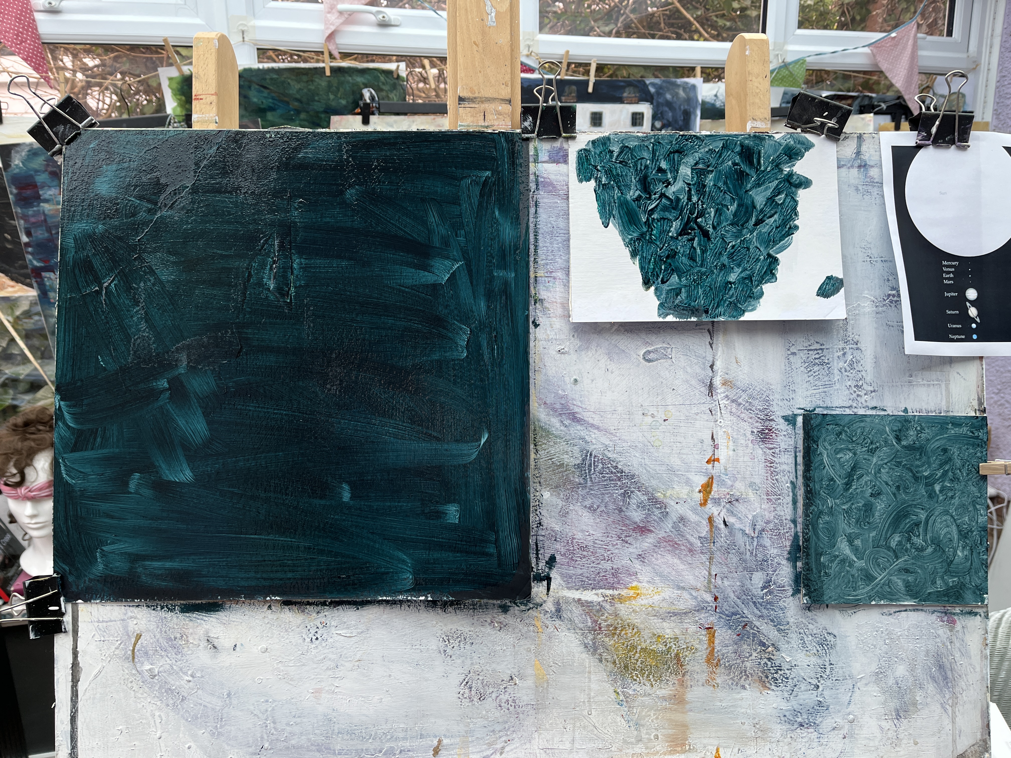 Meanwhile, I’ve cut the other half of that piece of card into three pieces to see what I can do in refleciton, perhaps from a distance, with this story. And, in an effort to make my own black without the proper ingredients, I’ve covered them with a shade of dark green. Again, these can stew a little while I mull them over, but I’m thinking about postcards – what would the solar system send as a postcard just before it was absorbed by the sun?