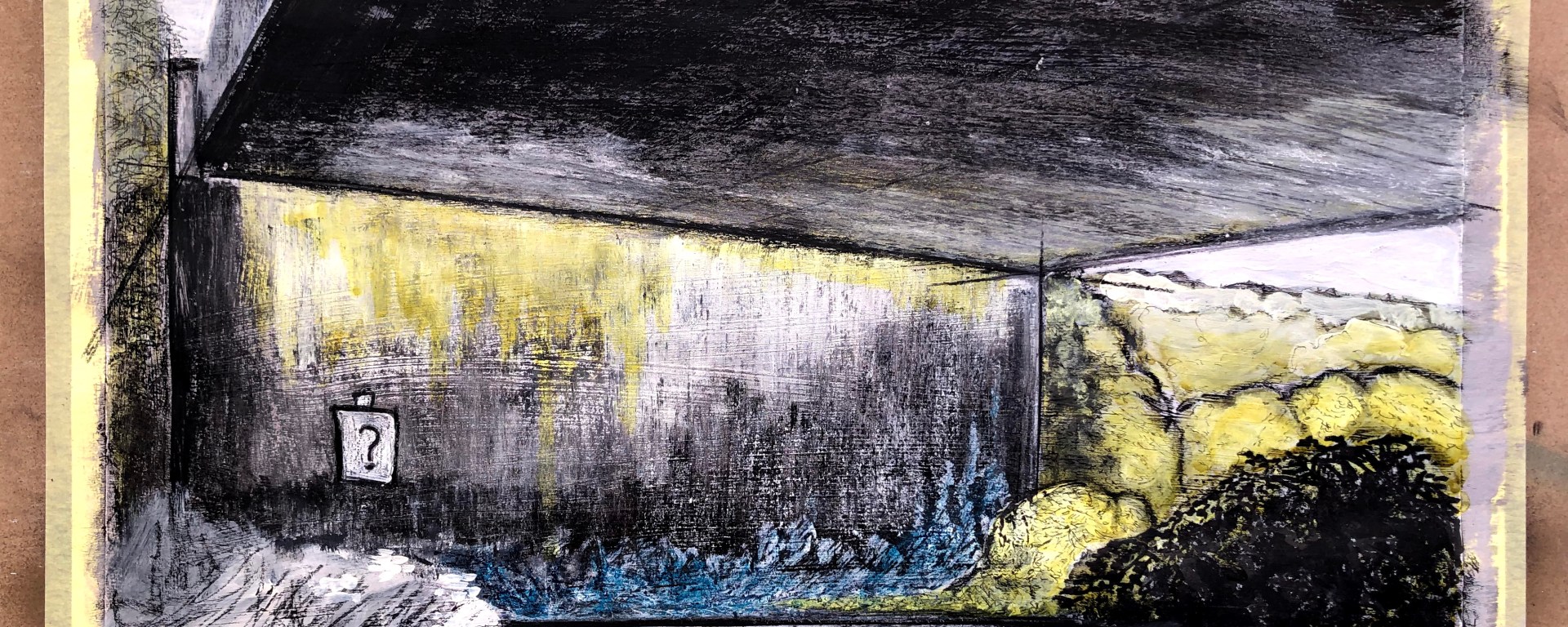 This is where it is now with added layers of white and black gesso, ink highlights, fineliner detailing, and some inktense colour just for good measure. Dog walkers (and walkers) will know this place – although maybe not from this picture! – it’s under the Steyning bypass on the east side of the river Adur just south of Beeding bridge. Some of the graffiti has been, erm, ‘simplified’ out.