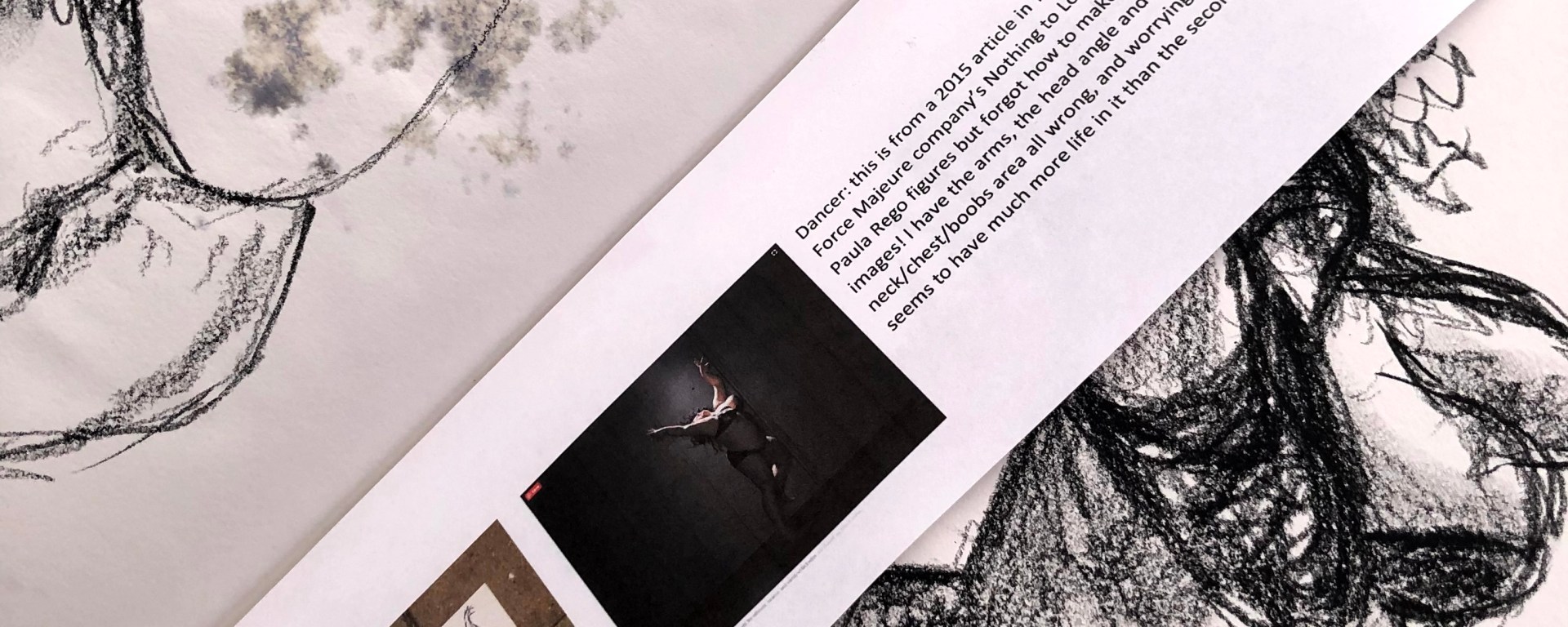 In the absence of people to draw for the first part (I’ll come back to it), I’ve made a start on Part 2 and since I’m not going to use nude models but still need to find anatomical form that isn’t hidden by clothing, I’ve searched online for images of dancers and gymnasts. The first images I found immediately put me in mind of Paula Rego but my execution falls way short!