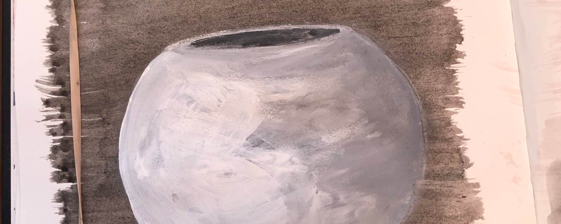 This is a move on from there to overlaying an object on a base of grey wash. I’ve used a small candle holder. This is the first application – quite blocky and some distance from wash.