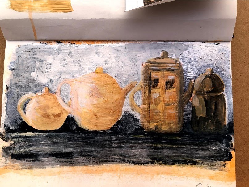 The task here is to find a ready-made still life – that is a collection of objects already positioned somewhere in the home that draw the eye – then make a series of sketches to get a feel for the shapes, lines, and volumes they comprise.