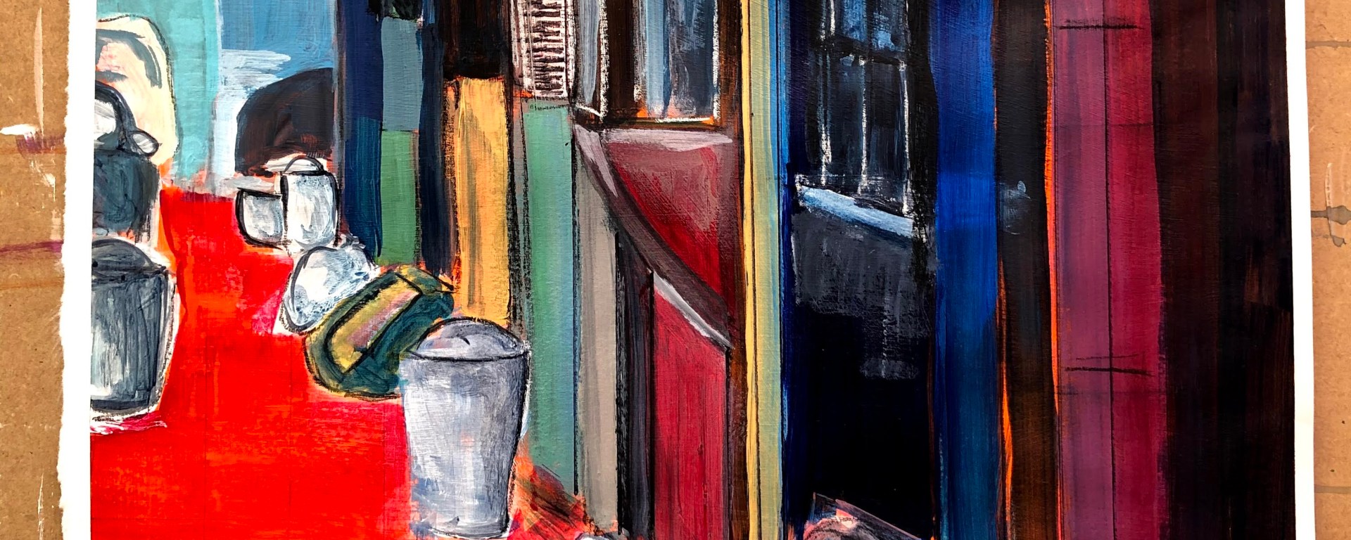 After some more blocking in, I can see a terrace emerging. I use black (or white) conte to make guide lines but I’m not aiming for a ‘clean’ graphic image, more one that is impressionistic. As long as I get the perspective right, I’m going to feel free to use colours that say Brighton rather than take a more naturalistic approach. I’ve become a fan of the ‘dirty brush’, one that will streak another colour along with the main one. This seems to be turning into a quilt.