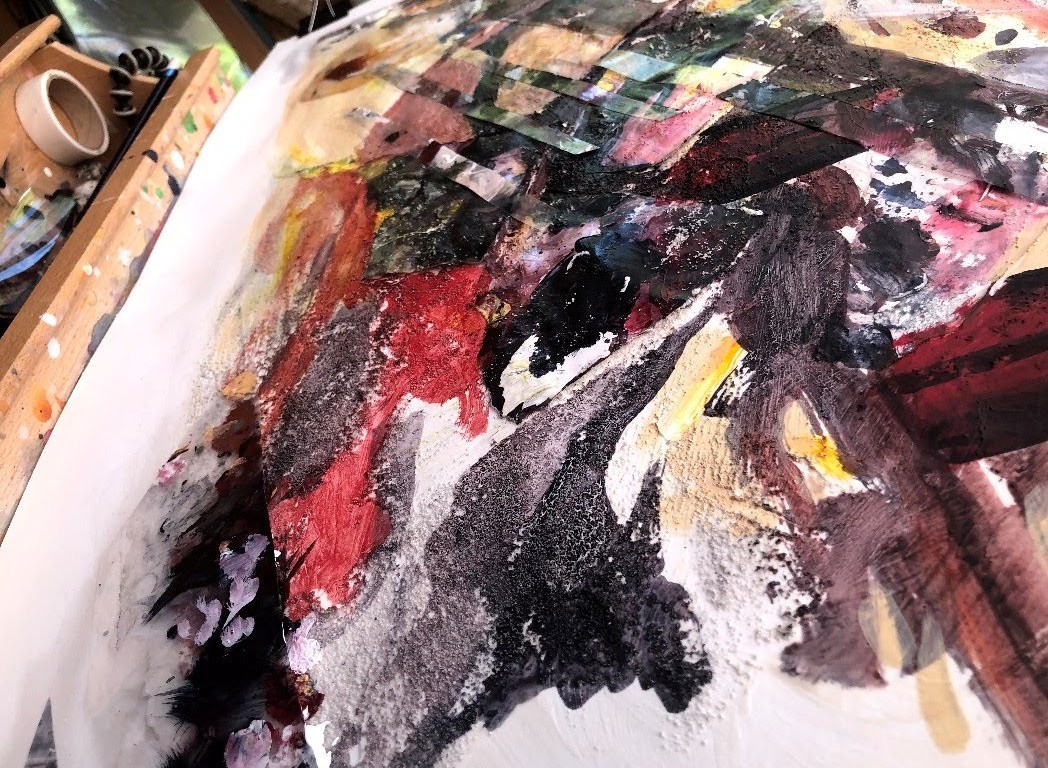 So in response to this, and glancing at the disposable palette I used to make it, I prepared an A1 sheet of cartridge with white gesso, pva glue, and pumice medium applied with a pebble, then ripped up the palette (freezer paper) and stuck it onto the support. Some of the paint was still workable and the brush I used to push it into the medium/glue also tracked colour across the areas in between. I don’t have a plan, but then that would seem consistent with several key individuals; this will evolve but it will reflect the original. The current image is just the base layer.