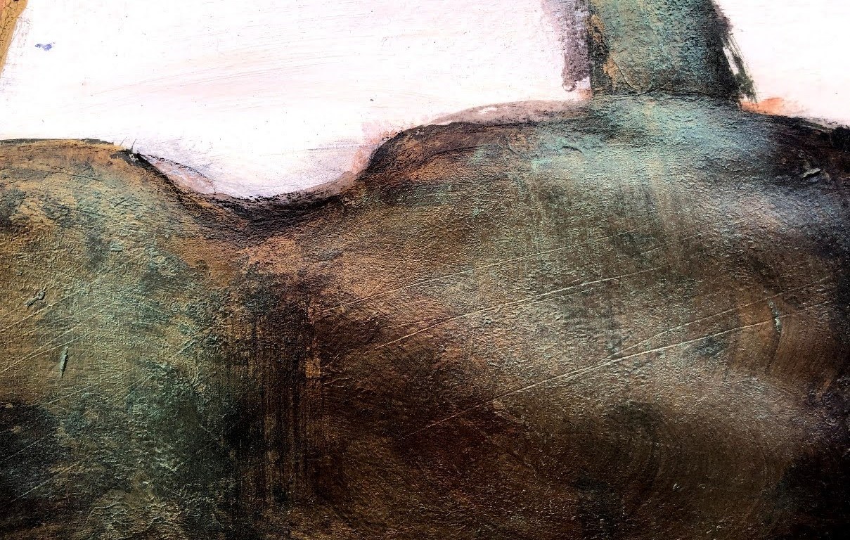 I made a start with shapes and colours, drawing on my experience of ‘booklet’ printing. This is an A1 sheet of cartridge prepped with transparent gesso, drawn out in black conte, and painted using a mix of System 3 copper and PVA which I’ve established adds a slight gloss to any medium. In the meantime I’ve found some texture on a wall in my studio and pulled this out with oil crayon. I intend to do the same with other textures around my house as this is the environment to which I’ve been confined since mid-March and where I’ll most likely be obliged to stay for some time yet. The internet has been my window on the rest of the world and my source of references for almost all my work in this module.
