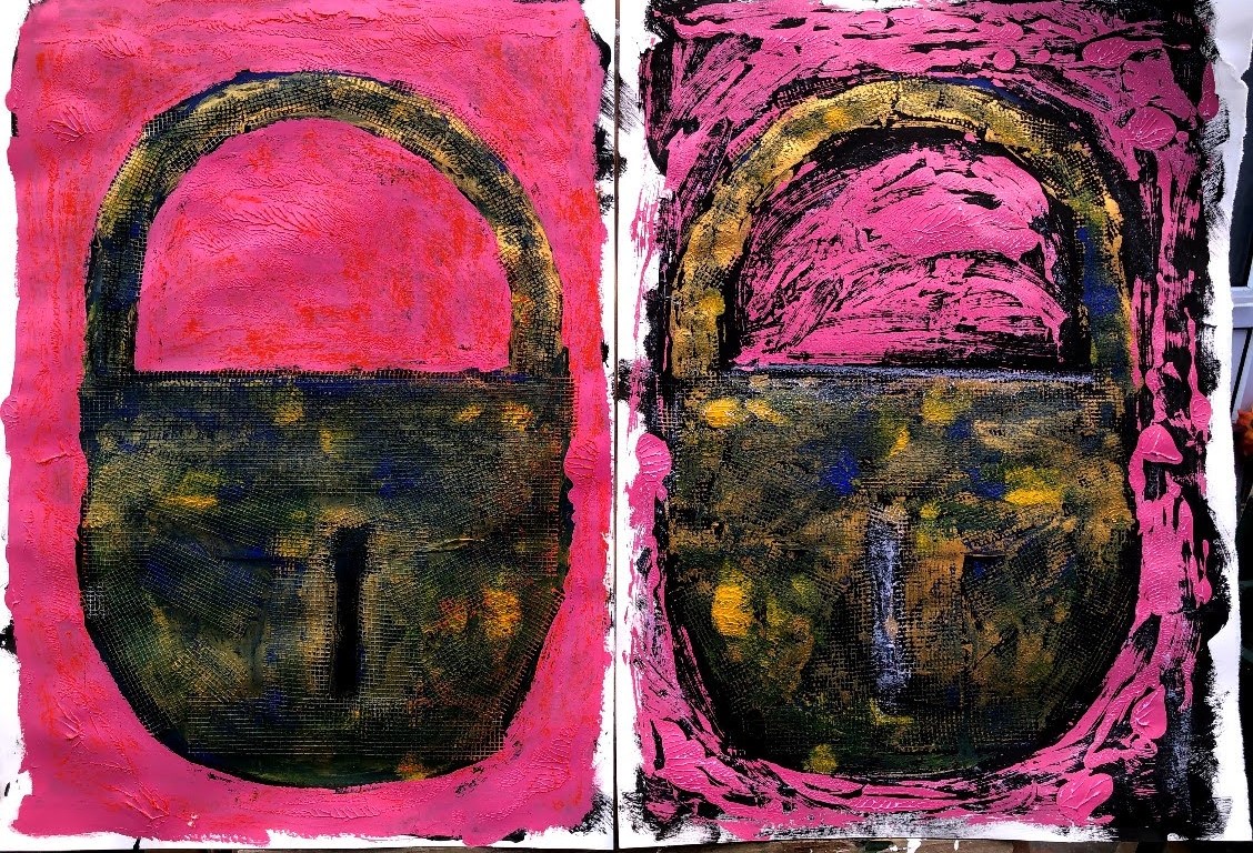Pink locks. The print seems more interesting in terms of textures and movement but may not once I’ve done some removal work on the source. I want to darken the key hole a little but also move onto the syringe/key because that may give me different ideas. The theme that seems to be emerging is the block of the lock; what it hides, what it contains, and what it will take to release it. I’m thinking about bringing my key lockdown paintings into this in some way, along with representations of the services that have kept me going during this time. There will need to be cats because, although I am technically the service, they have been the company – always an ear to scratch and a purr to feel humming through my body, the fun – kitten antics are something else, the challenge – what if they’re ill, how do I access a vet?, and the routine – breakfast time, tea time, get them indoors time, bed time, and forever that’s-not-yours-it’s hers time when they nick each other’s food.
