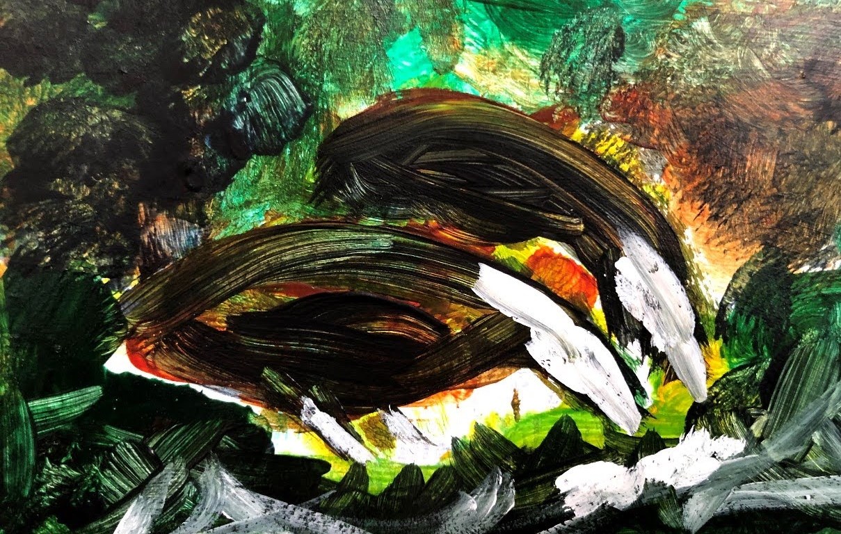 18th August. This task requires an assembling of five of my found images, overlapped; an A3 sheet of paper, and water-based paint. I have run out of HP watercolour paper so I used black cartridge, painting the blocks of the photos in white acrylic. The idea is to paint from the assembly of images without looking at the paper and really I have no idea how that works in practice given the spatial organisation of my set-up. Still, this is the first of three and actually it is not as horrific as I had thought it might be. In fact I am quite pleased with the one at the bottom, and now I have a feel for what I’m doing, the next two could be both fun and interesting. I will try different techniques and media as well as support because that will change my approach. Acrylics, for me, lend themselves to broad brush, impasto ridges, and imprecision whereas other media may not. That said, precision is unlikely given the task directive about not looking at the paper. Simplified form and some muscle memory perhaps using large amounts of water for the medium to leak into and balloon within.