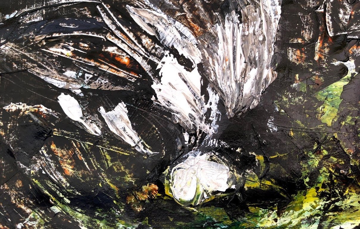 One more attempt. I prepared the paper again with transparent primer then washed it with T Buff. After using brushes of various sizes for the previous paintings, I chose this time a small pointed palette knife with the intention of making shapes with impasto and sgraffito.