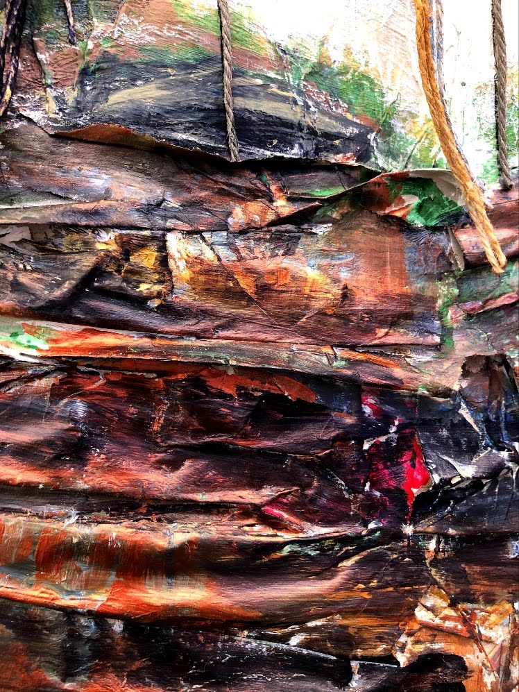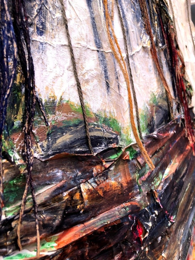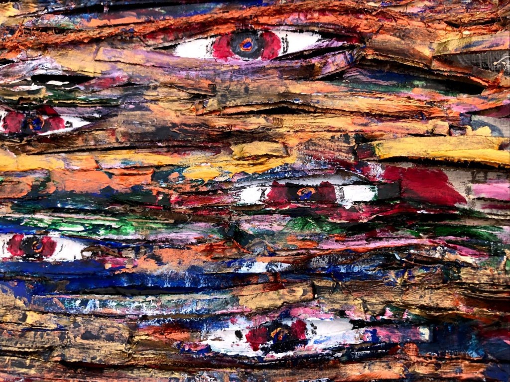 Eyes On. Acrylics and shredded protective packing material on 20×25.5 cm re-cycled canvas board mounted on A1 white card.