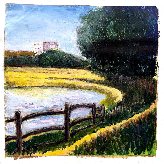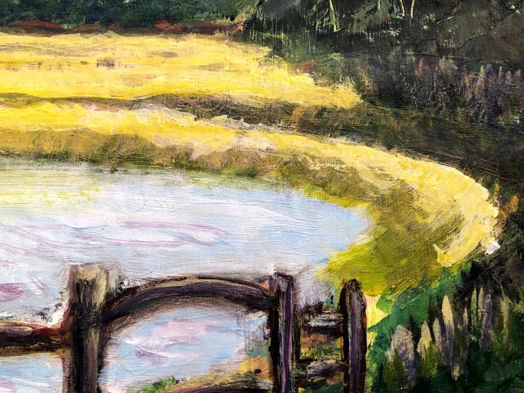 A Bend in the Adur. Acrylics on 45×45 cm corrugated packing card.