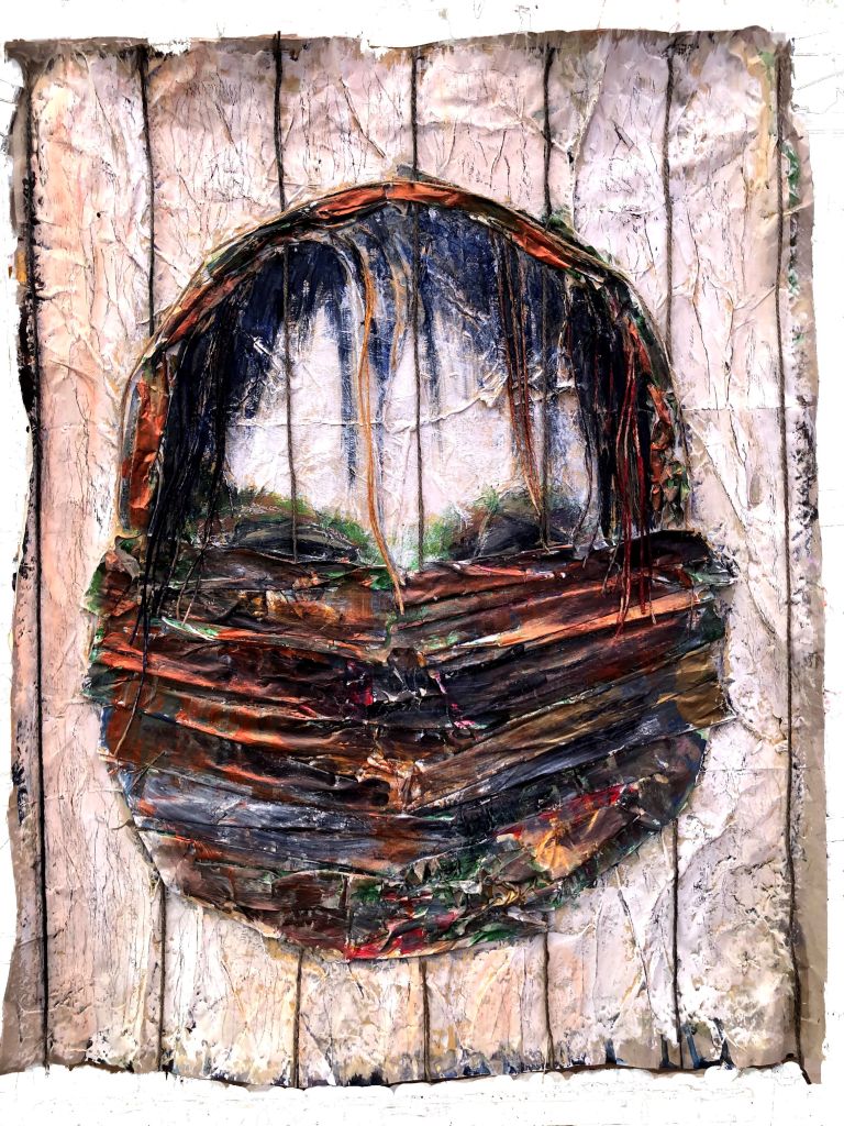 Mask. Acrylics, string, and packing material on brown packing paper. Approx A1.