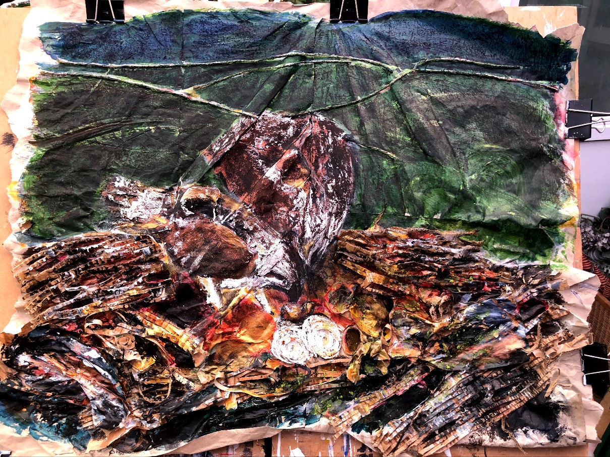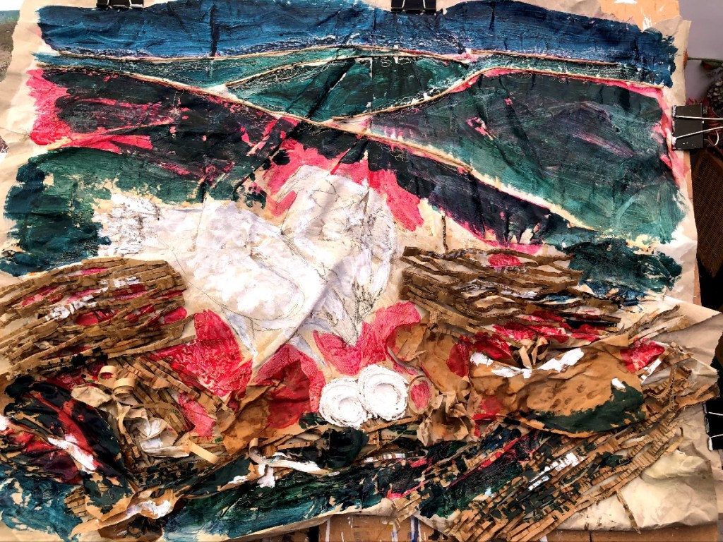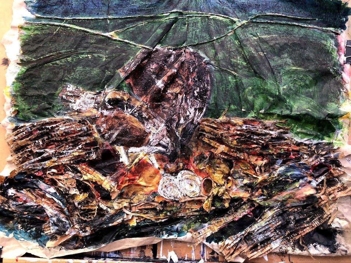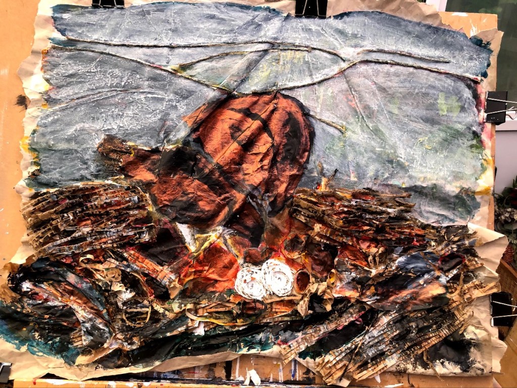 I’ve applied matte varnish by spray to fix the soft pastel – some of which is glued on after I dropped a piece and shattered it. Ground up, it gives texture as well as colour. Hopefully, once fixed I can wash the background with some darker tones without losing the effect of texture where the pastel has acted on the folds and crinkles of the paper.