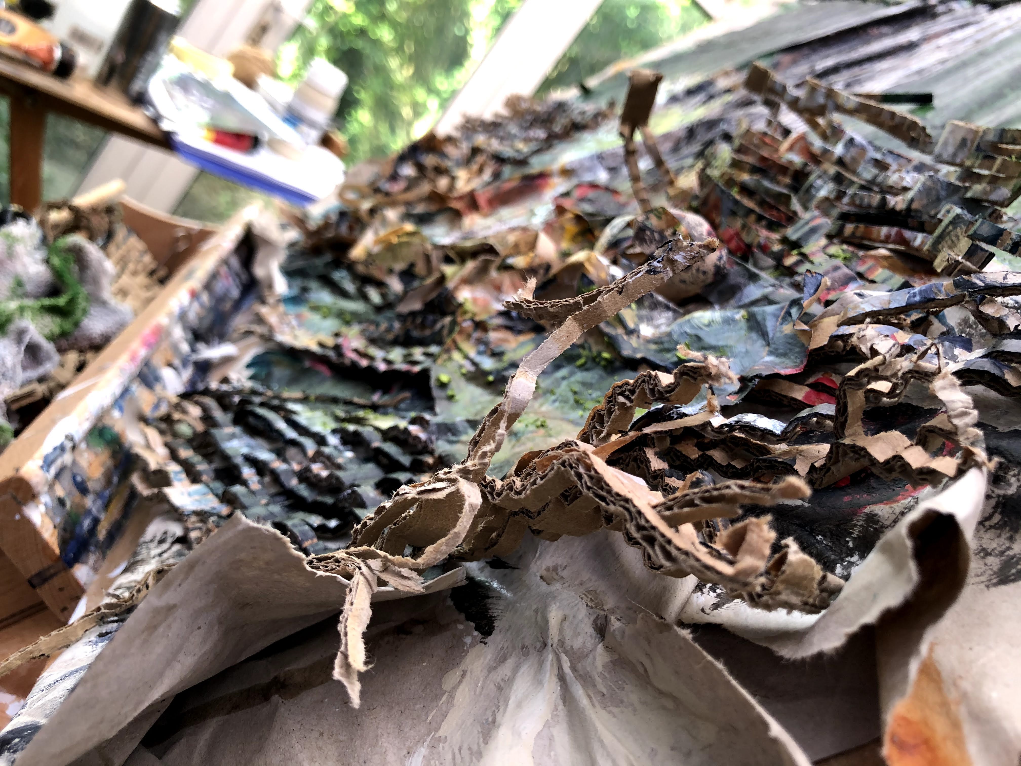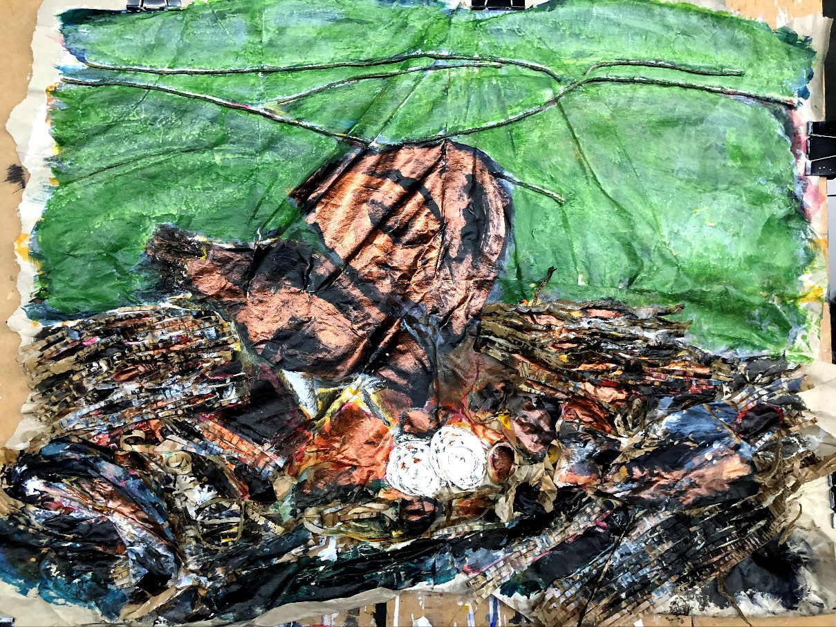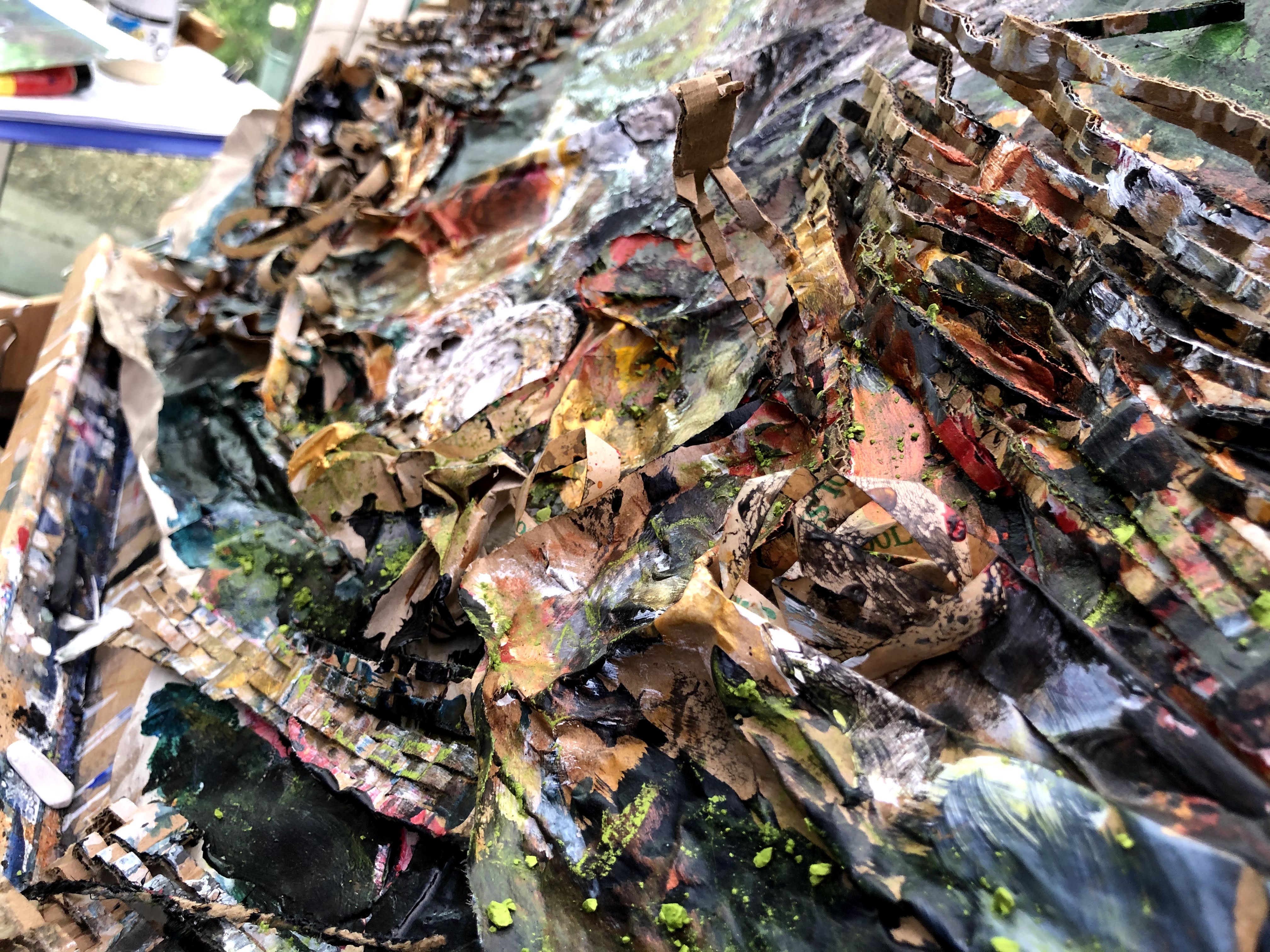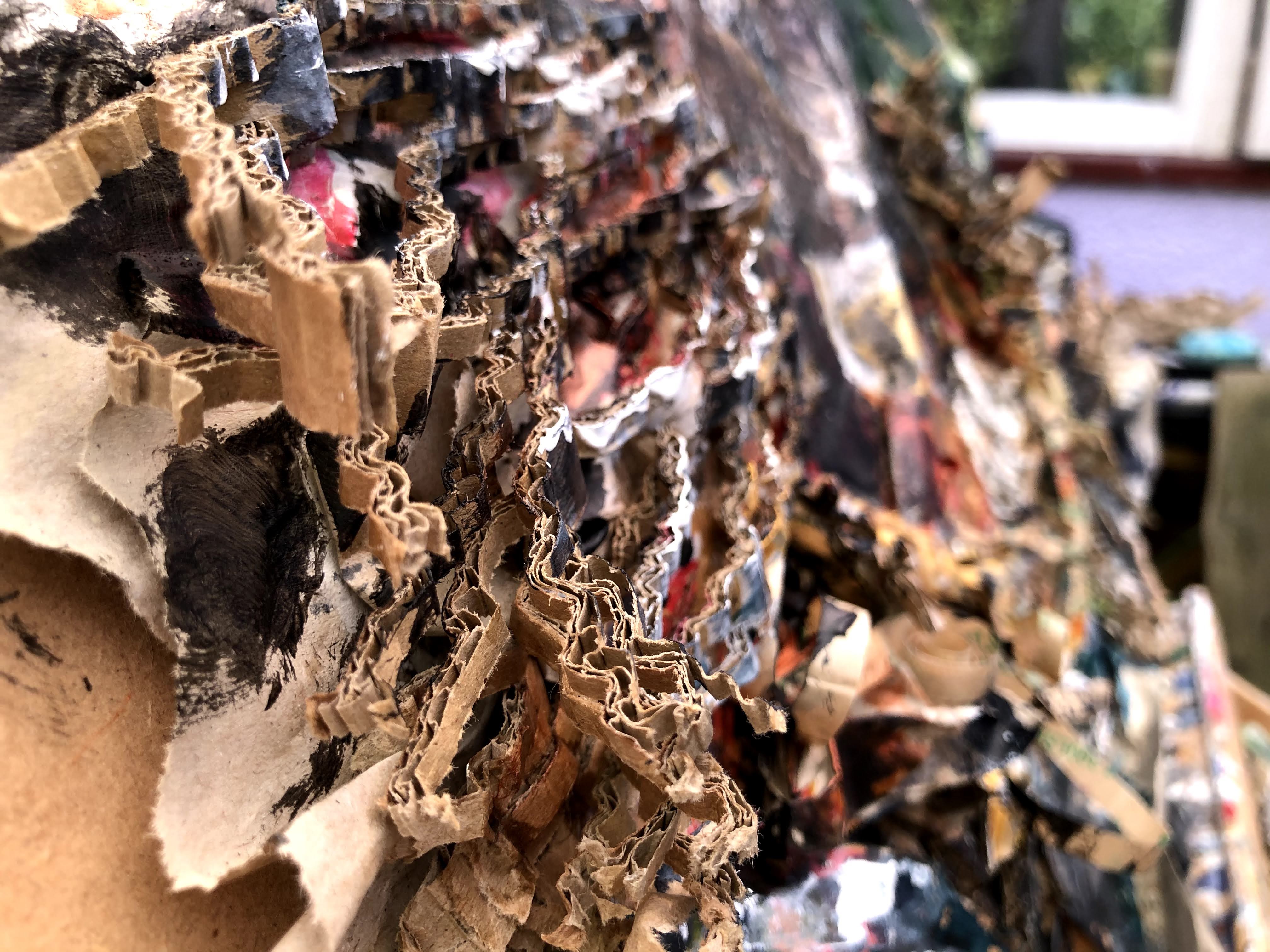 I’ve applied matte varnish by spray to fix the soft pastel – some of which is glued on after I dropped a piece and shattered it. Ground up, it gives texture as well as colour. Hopefully, once fixed I can wash the background with some darker tones without losing the effect of texture where the pastel has acted on the folds and crinkles of the paper.