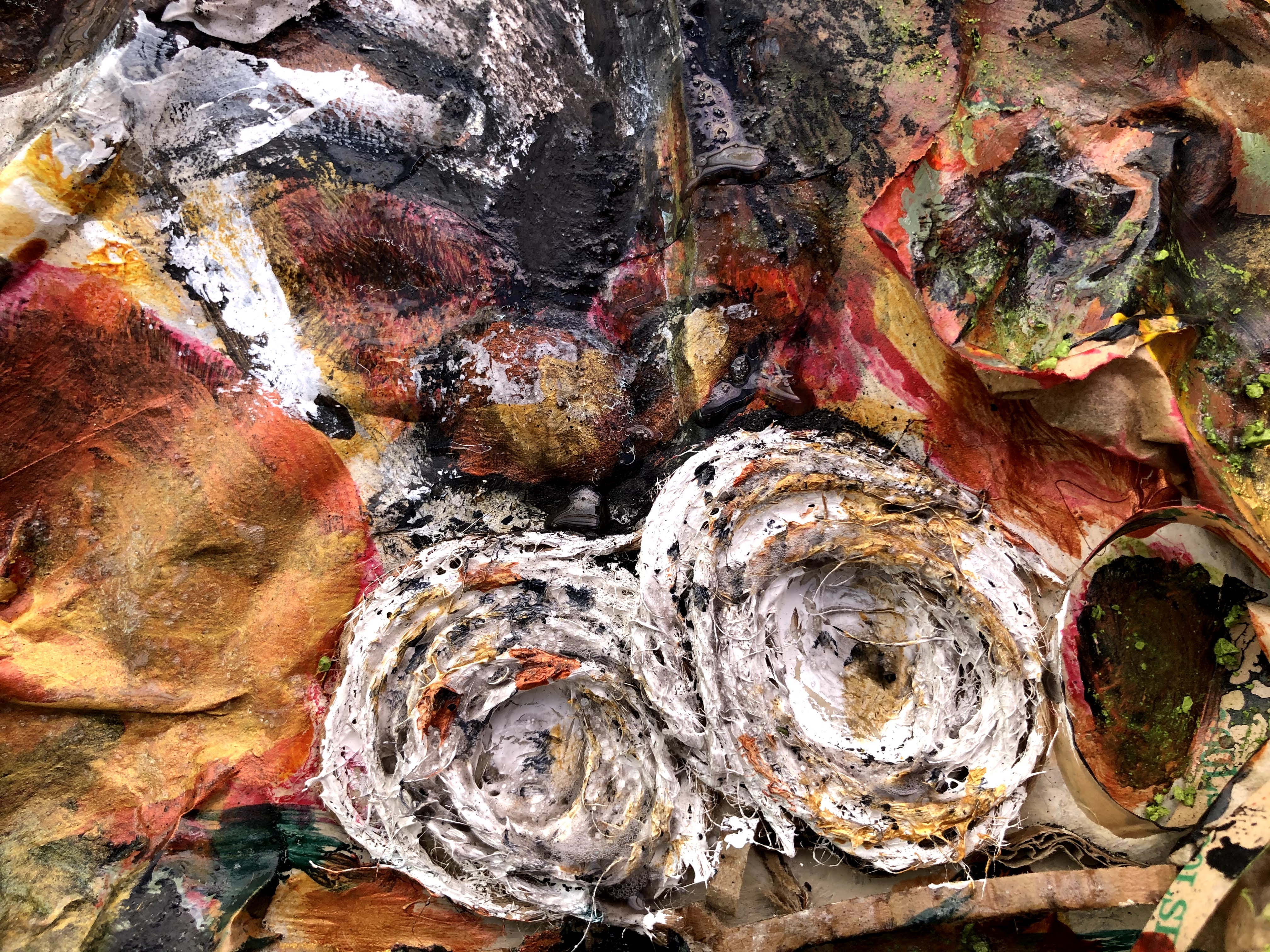 This is the tipping point; the support is flimsy and won’t take much more medium or pressure, the risk of over-working is high, and the background isn’t what I want just yet. Also those ‘eyes’ that make the larger bird look like a cartoon. How is I see this so clearly in a photo but not face-to-face?