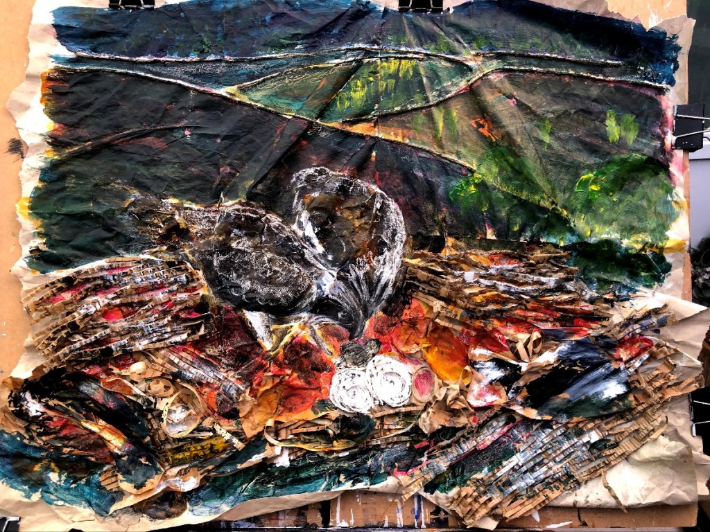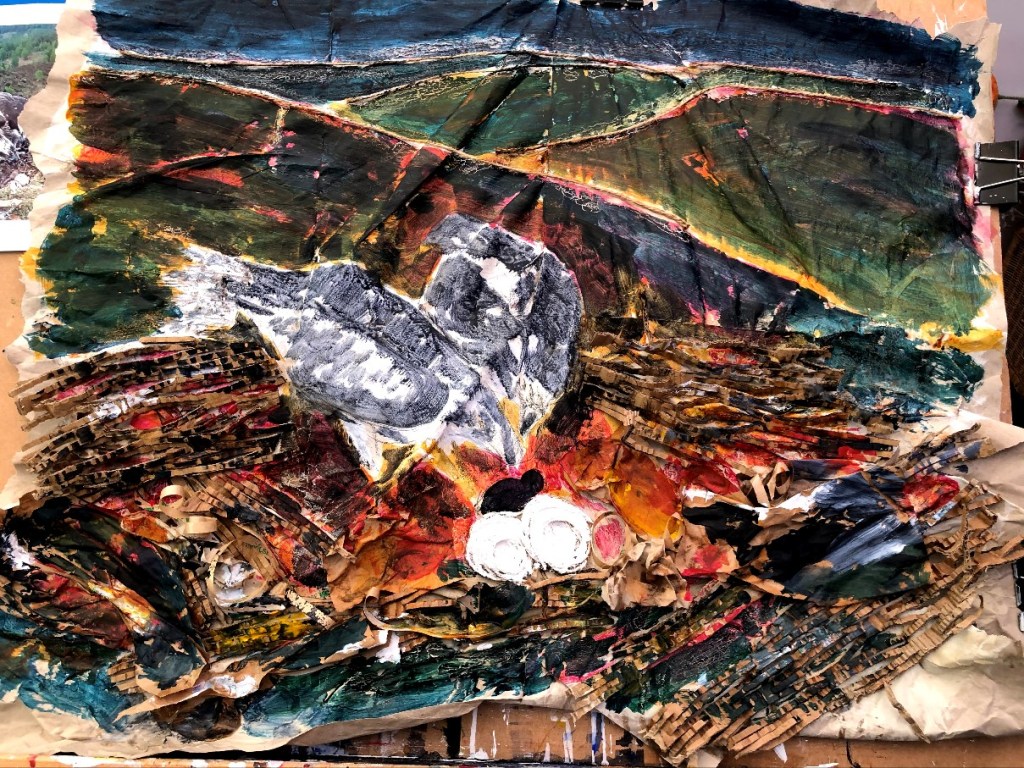 One of my found photos is a still from the Loch Arkaig osprey cam taken just after the first chick hatched and while there were still two eggs. Of all the photos, this is the one I actually wanted to paint and, for the assignment, I will. But the specifications are that each painting should be on a 6″ x 6″ square of HP watercolour paper and I really wanted to make something bigger. So that’s what I’m doing; getting it out of my system, maybe!
