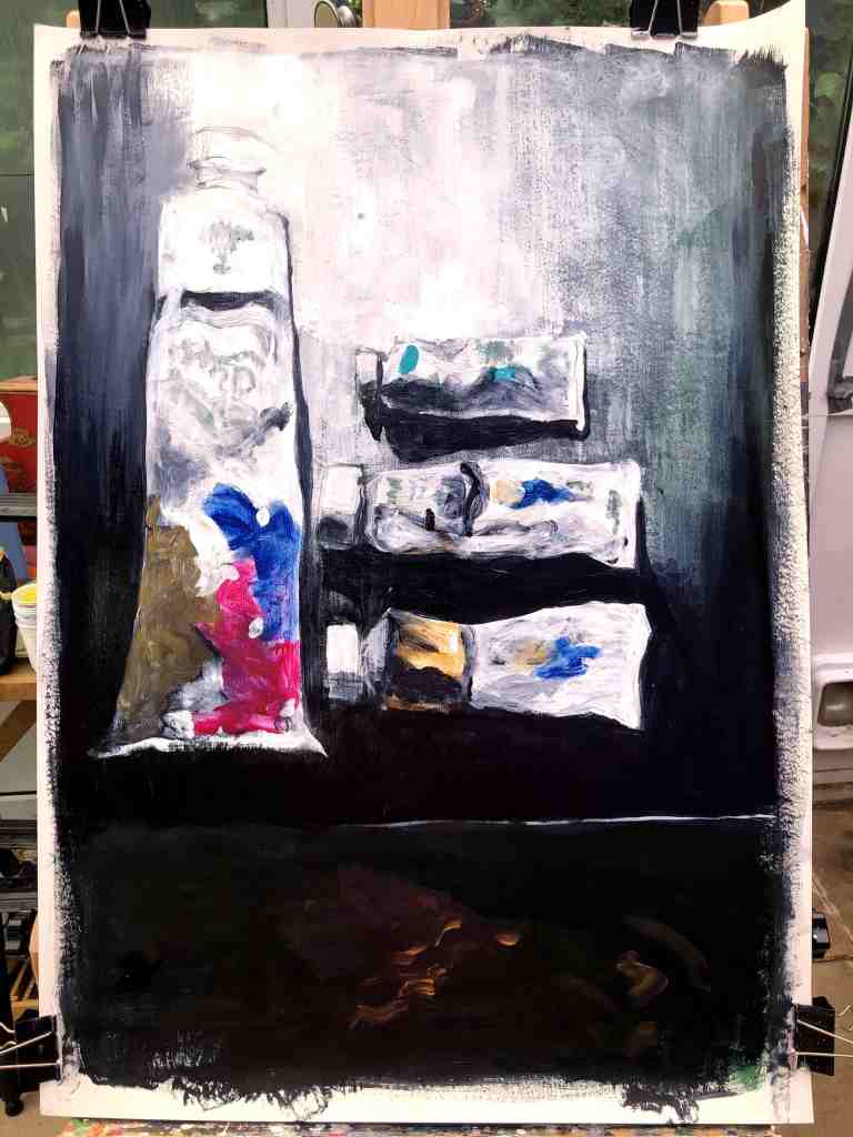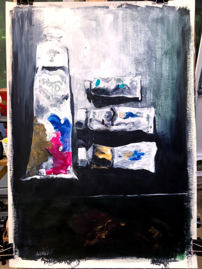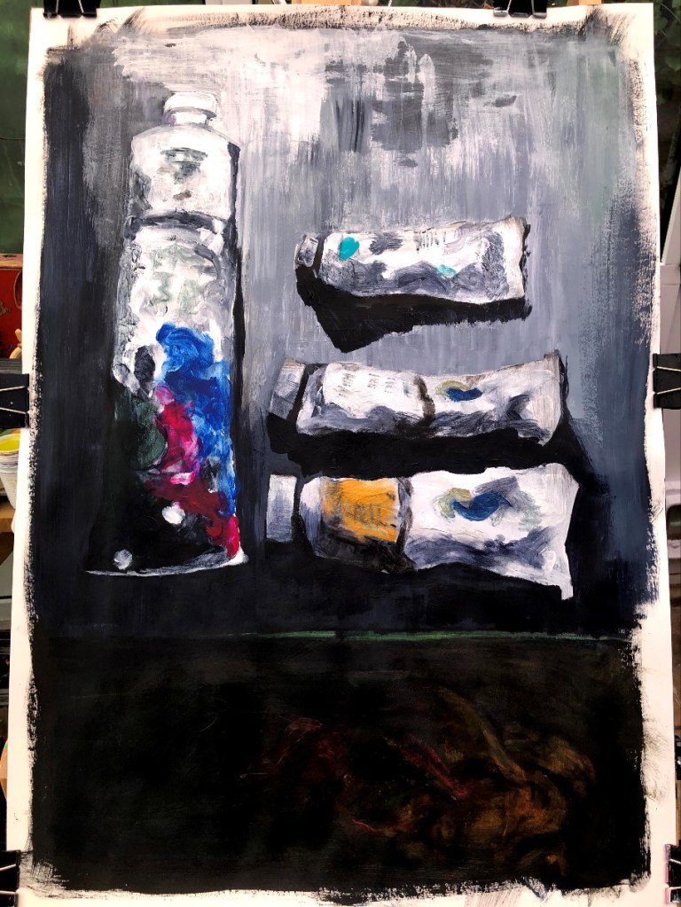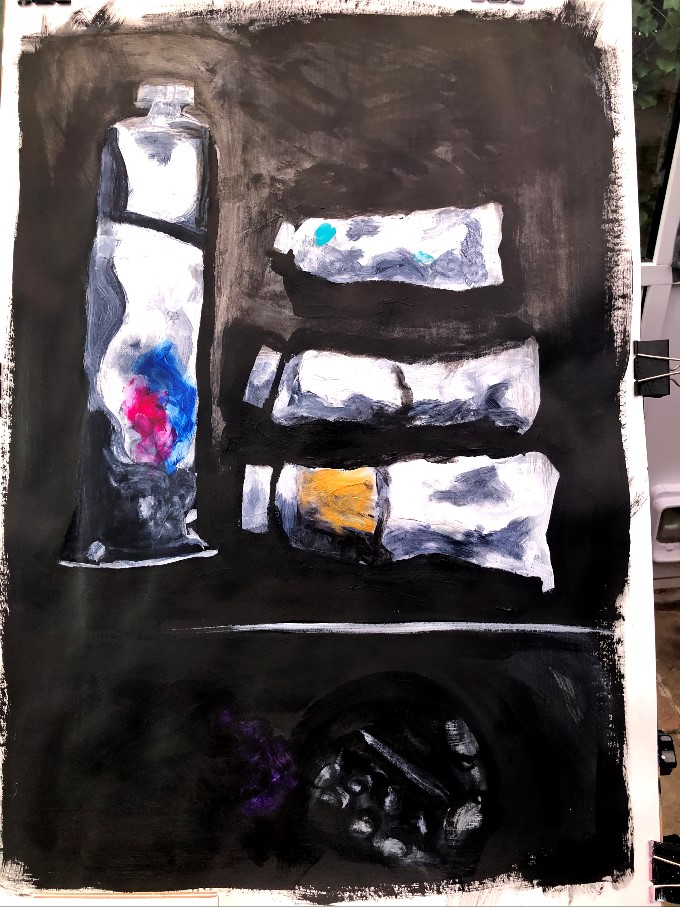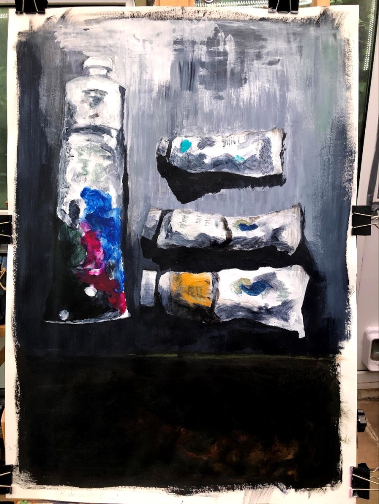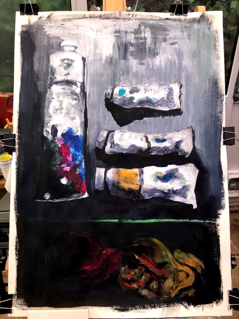 This is really my preferred size – it allows for gestural movements and maximises large rather than very tiny marks. I’ve chosen the tubes of paint again, placing them on a black Amazon box that had contained one of those Alexa driven clocks. It’s square and has a slight shine to it but the photographs go beyond that circumscribed area. This has given me some folds of cloth at what has become the bottom of the image and transformed the whole from landscape orientation to portrait. The lamp I used has a daylight bulb and can be roughly angled. It felt a little like being on stage, rocking a microphone back and forth although from the corner of an eye it also looks like one of those horrors from War of the Worlds.