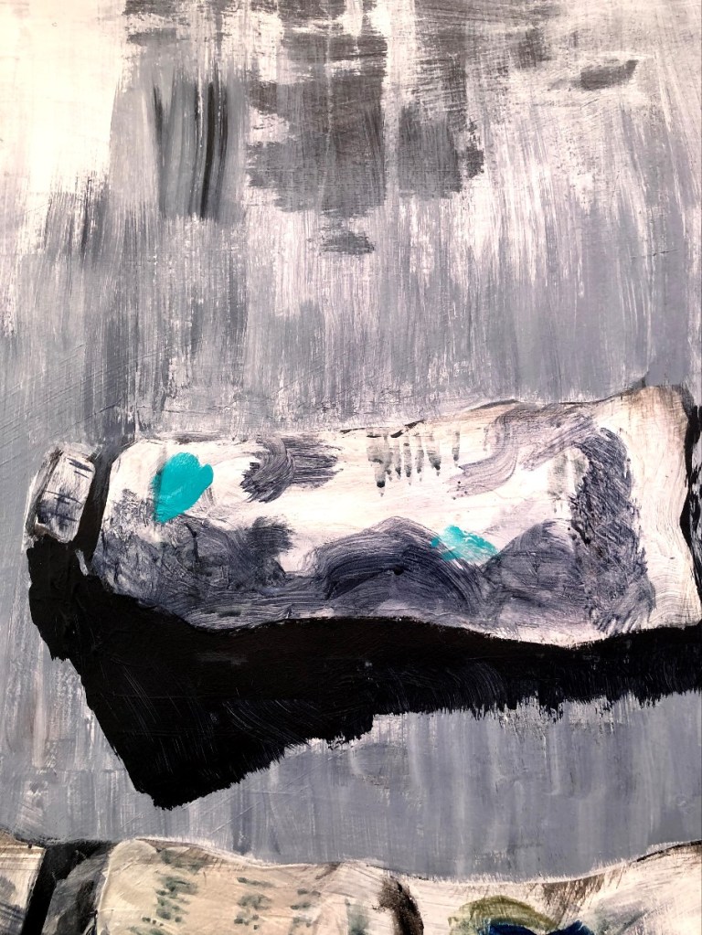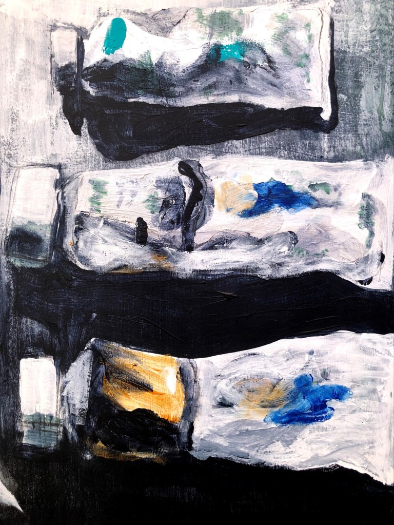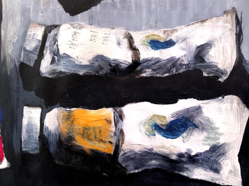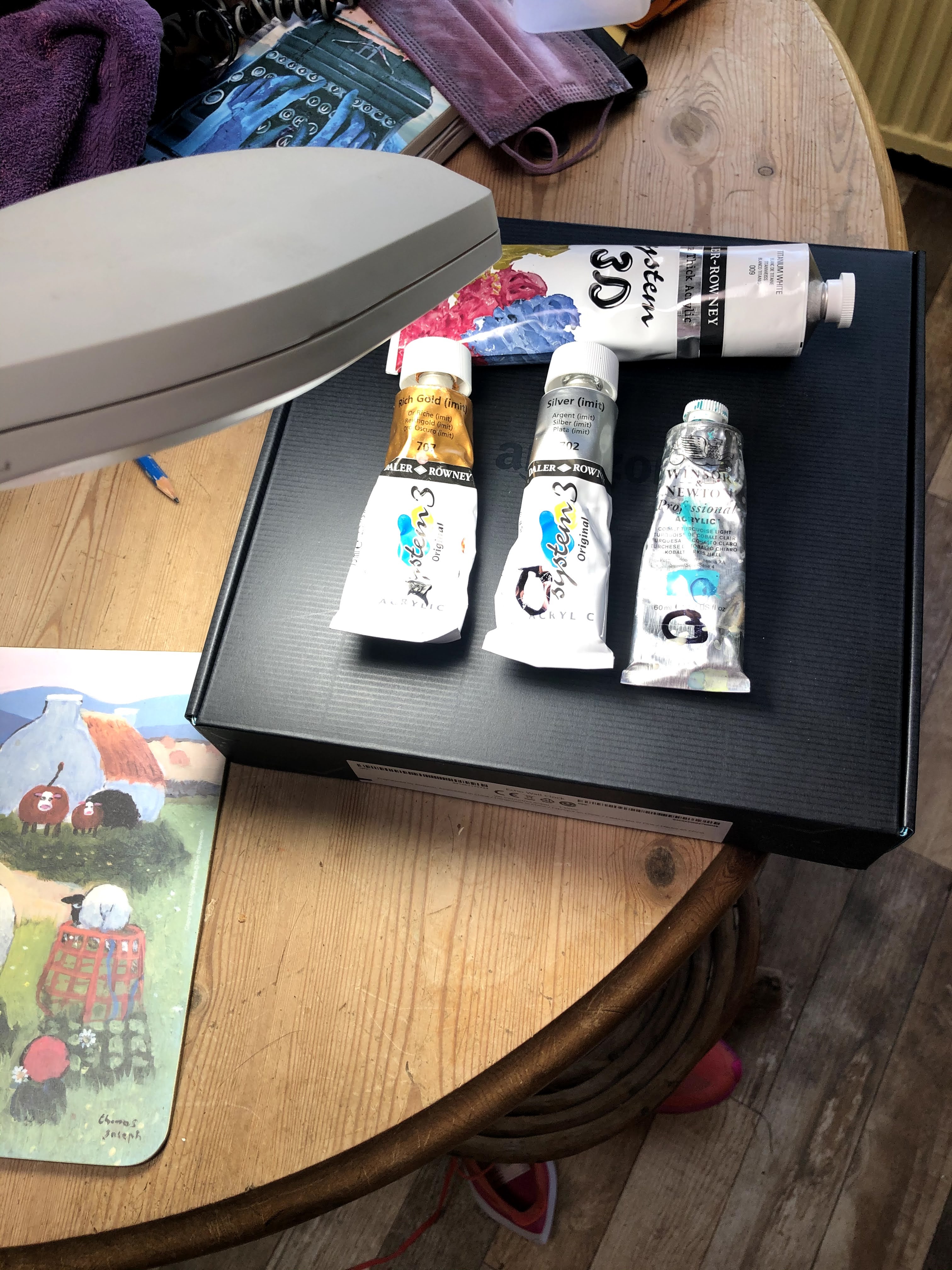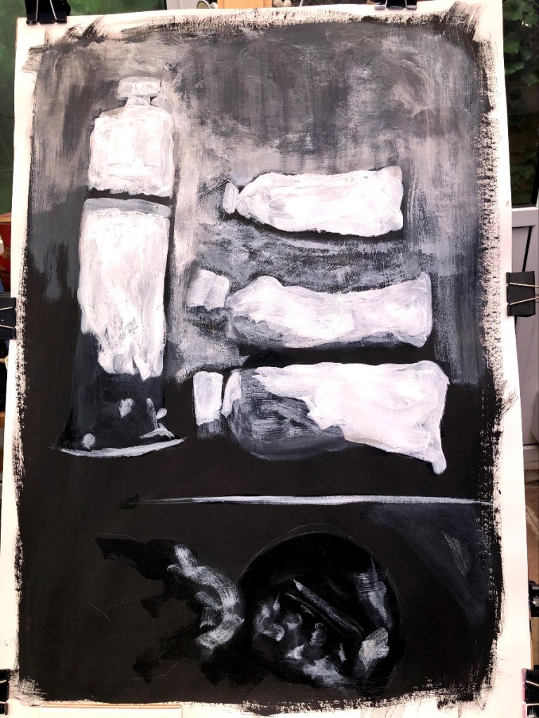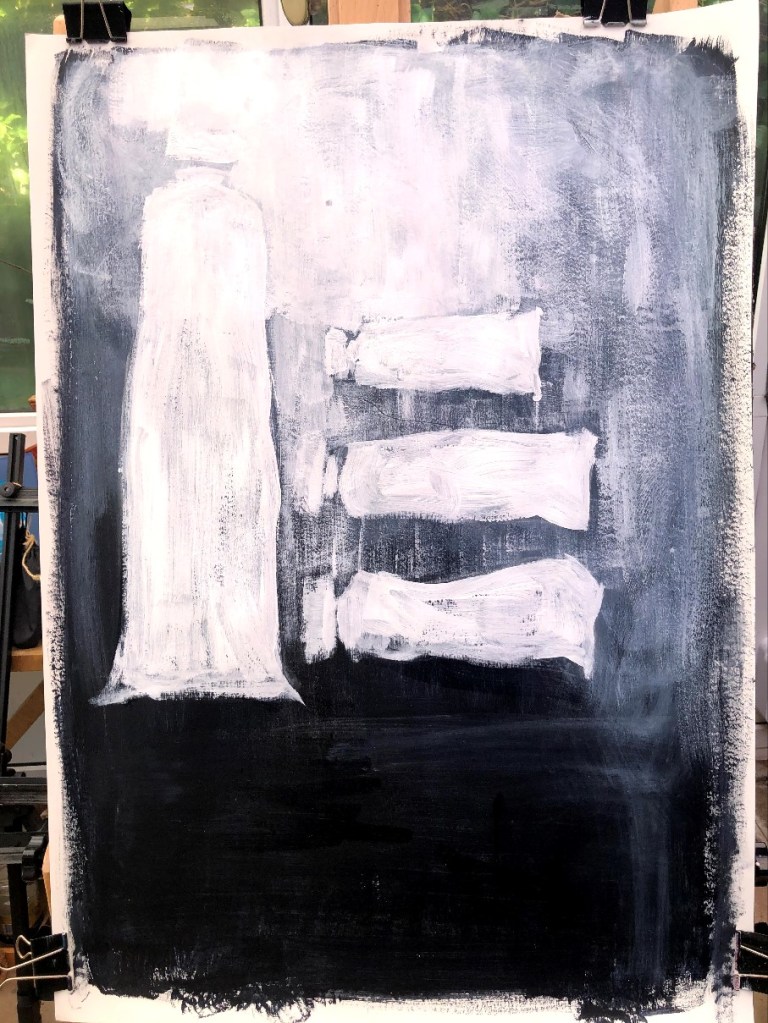 This is really my preferred size – it allows for gestural movements and maximises large rather than very tiny marks. I’ve chosen the tubes of paint again, placing them on a black Amazon box that had contained one of those Alexa driven clocks. It’s square and has a slight shine to it but the photographs go beyond that circumscribed area. This has given me some folds of cloth at what has become the bottom of the image and transformed the whole from landscape orientation to portrait. The lamp I used has a daylight bulb and can be roughly angled. It felt a little like being on stage, rocking a microphone back and forth although from the corner of an eye it also looks like one of those horrors from War of the Worlds.
