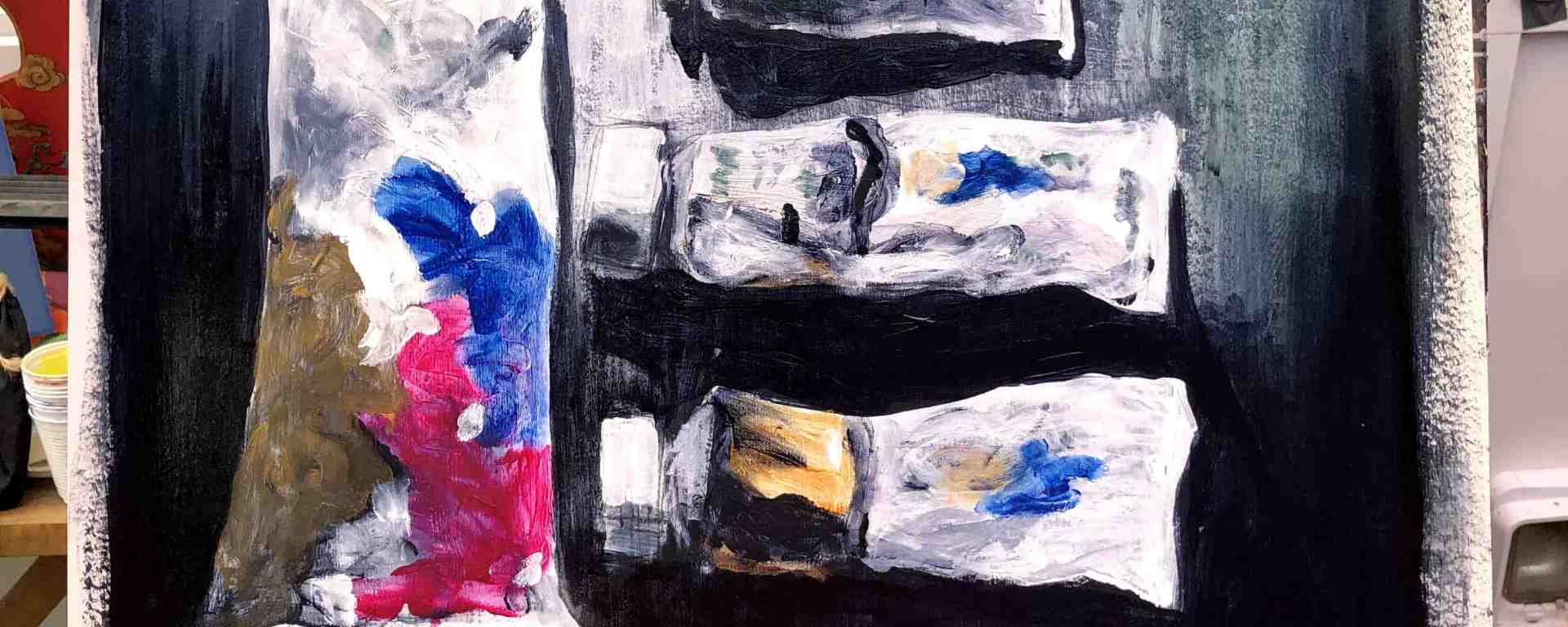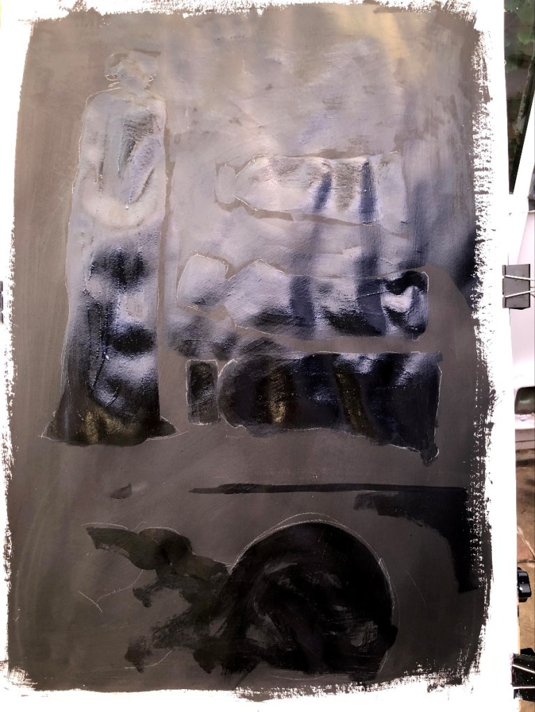 Already I can see how the topmost tubes are almost disappearing into the reflected light so I need to be careful not to lose that when I start applying colour. This time, I have a better idea about how to manage the shadows; I like the sharpness of the shapes I’d made with the paint in the previous version and so I’ll try to replicate that here. I’m undecided about the lowest quarter of the image; maybe that horizontal is necessary to provide a containing edge but the bits and pieces underneath?