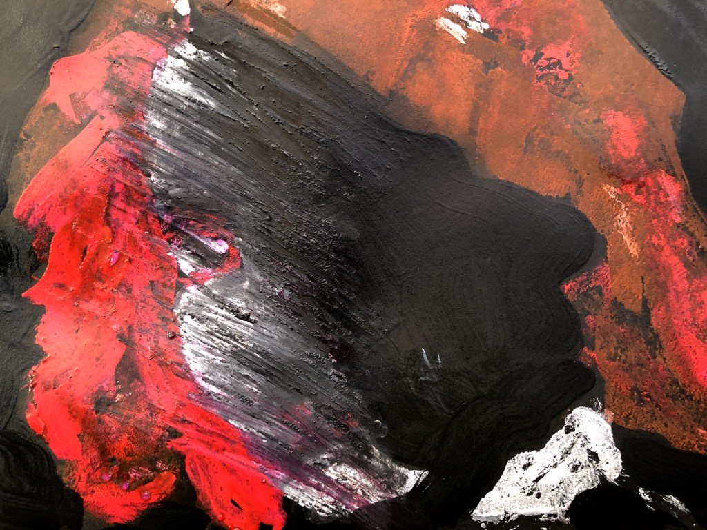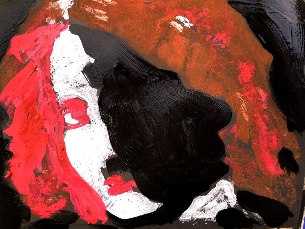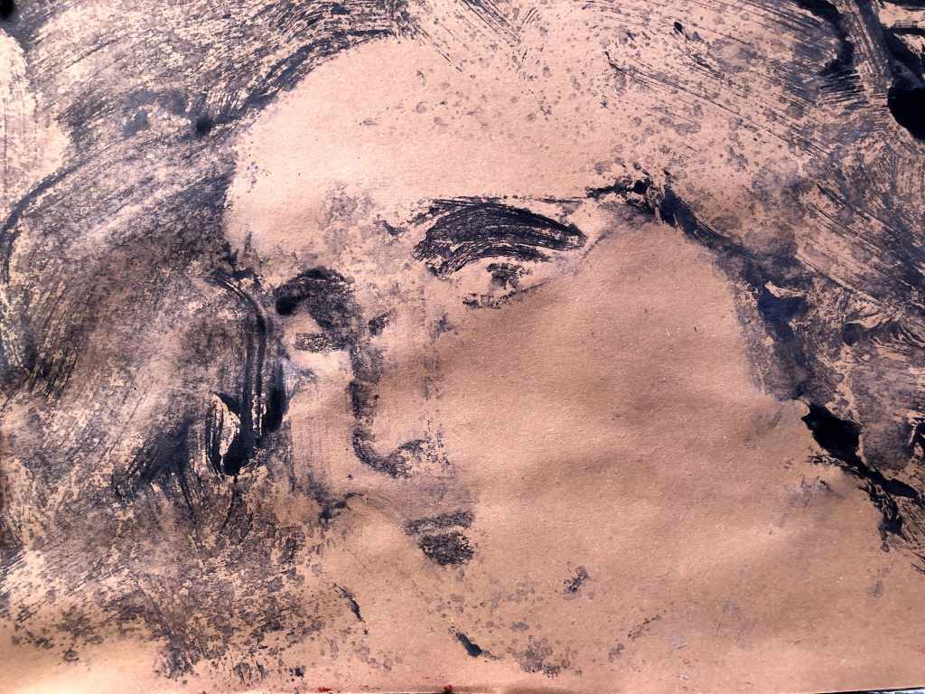 I don’t know if this actually is a monotype because I applied different coloured paint at different times and repeatedly printed from the film. Once completed, I made a few lines here and there either to delineate or to obscure an unwanted spread of paint. I wonder now if keeping the whole of the right side of the face black might be a better image.