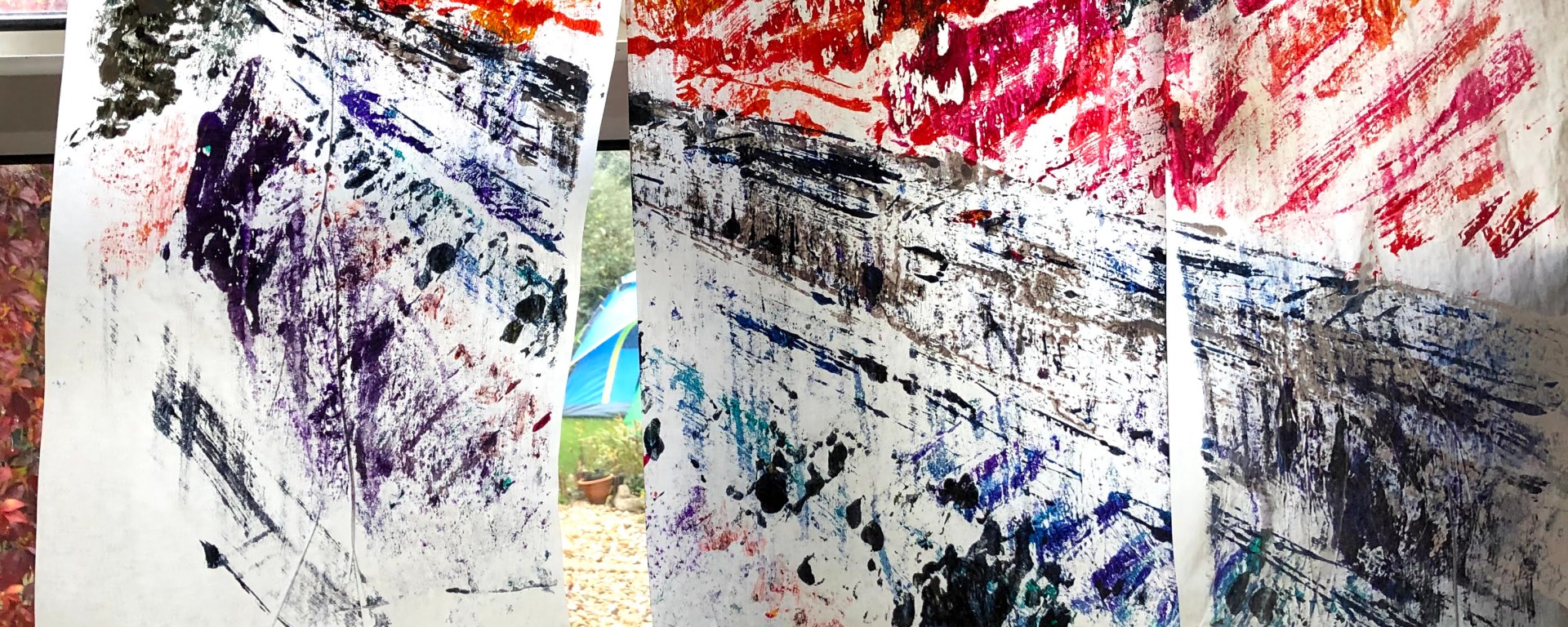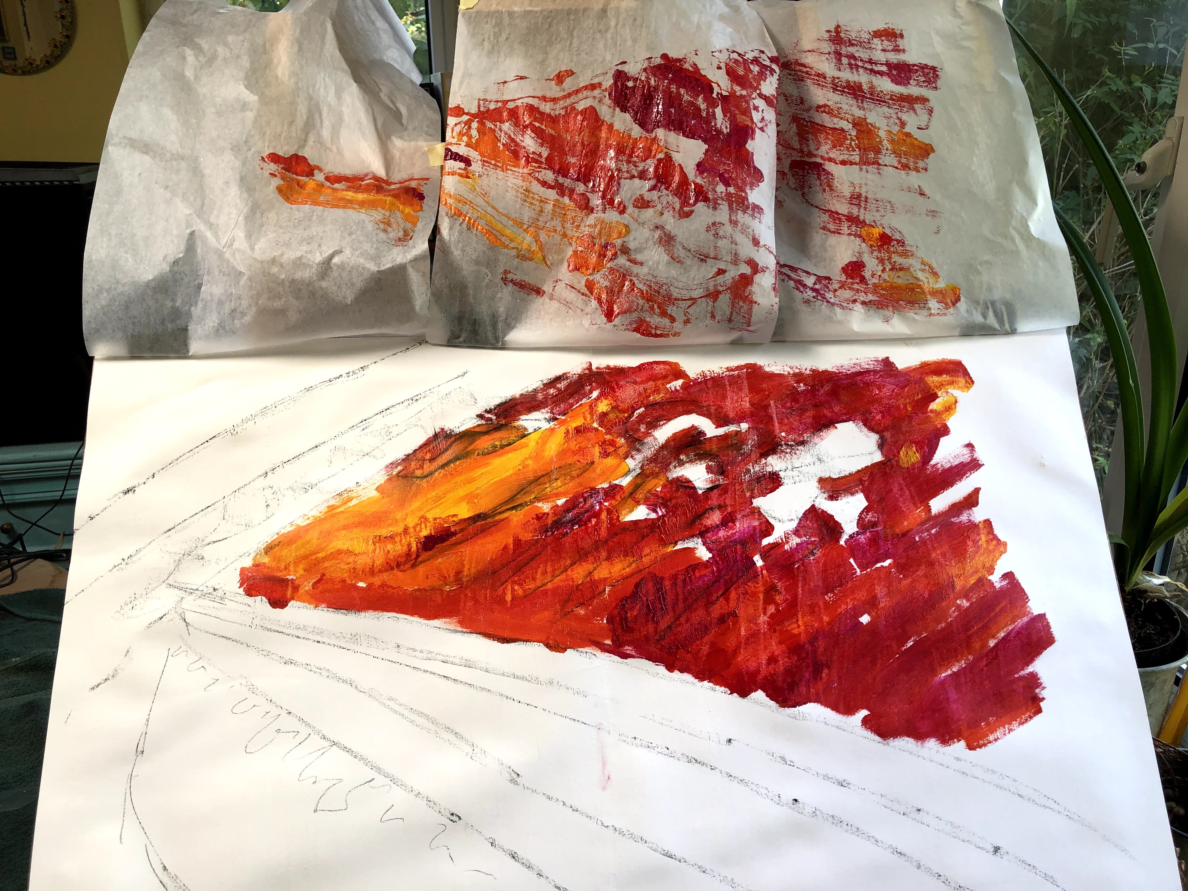 To make the prints, I’m using a base of white cartridge primed with transparent primer, acrylic paints mixed with slow dry medium, and strips of baking paper to pull off the layers as each is applied. I’m also giving it a judicious squirt from a water bottle periodically.