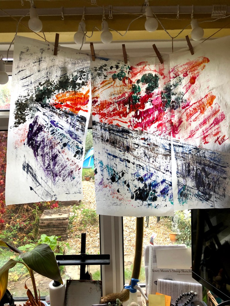 I’m almost to a halt with this now, at least until I have a bit more space, but I’ve achieved what I set out to do which was to make prints on baking paper that would hang in front of a source of light. The angle is poor at the moment and I’ll adjust that later for a proper look, again when I have a bit of space. For the moment though, one painting on A1 cartridge and three strip prints on baking paper hanging from string across the back window.