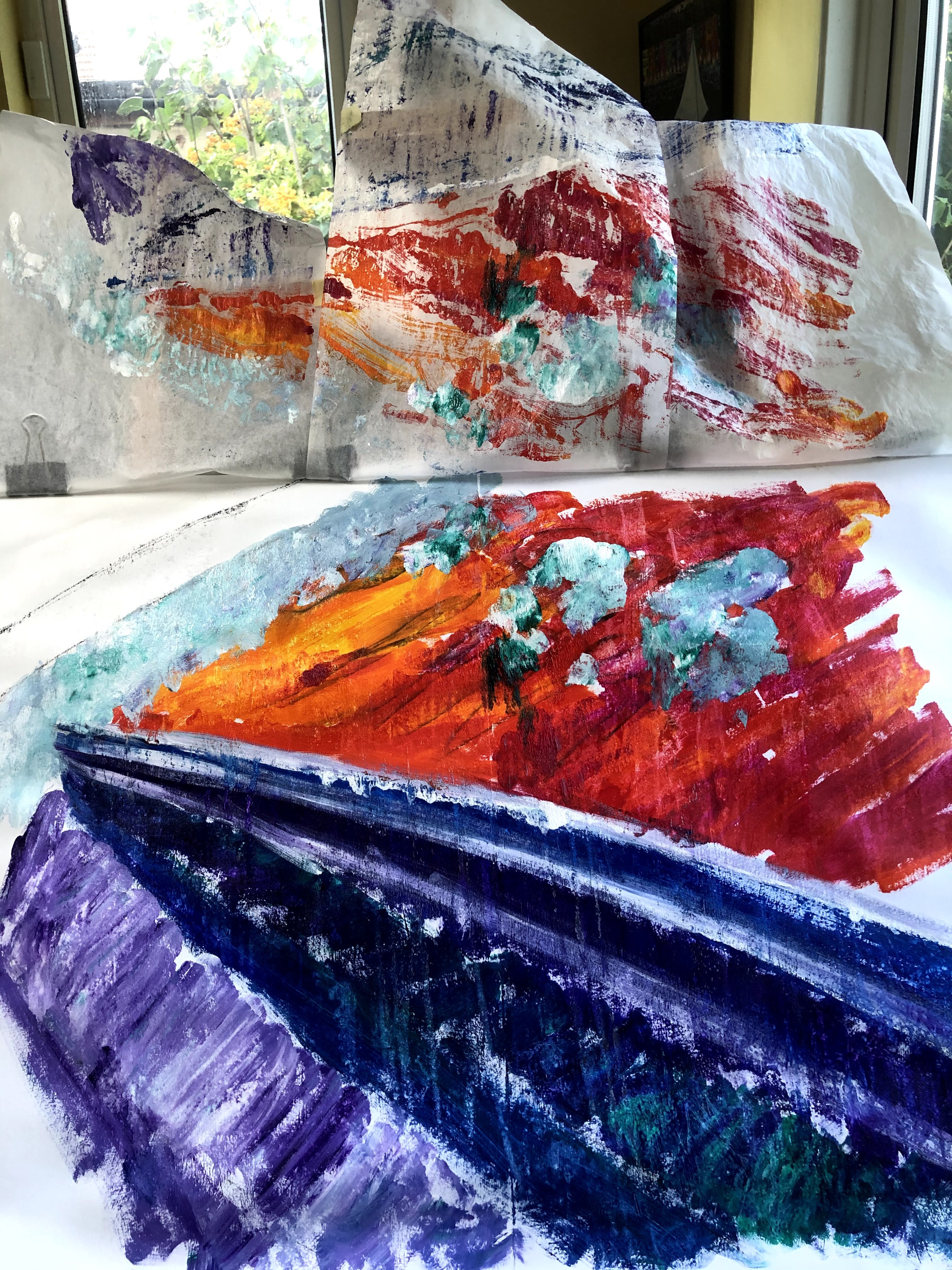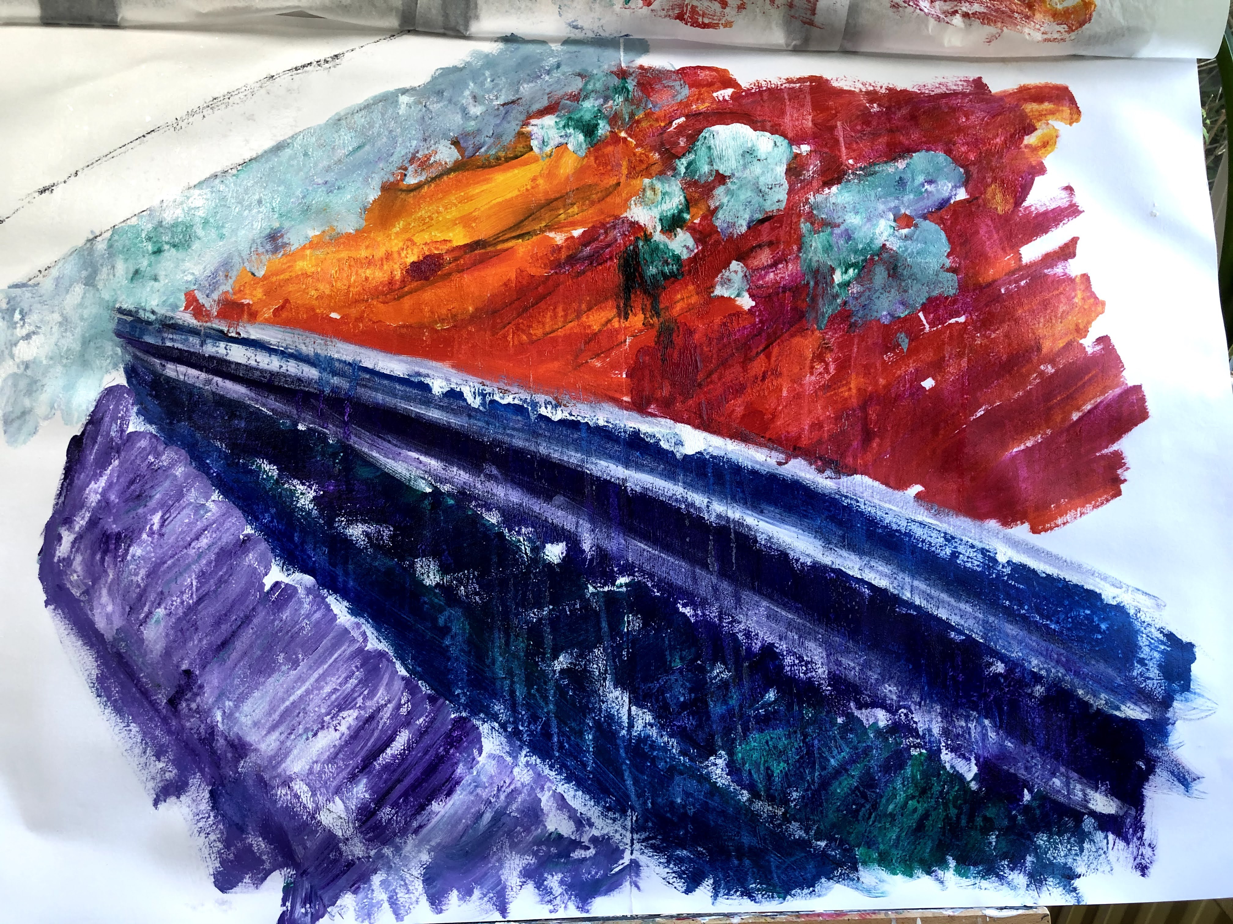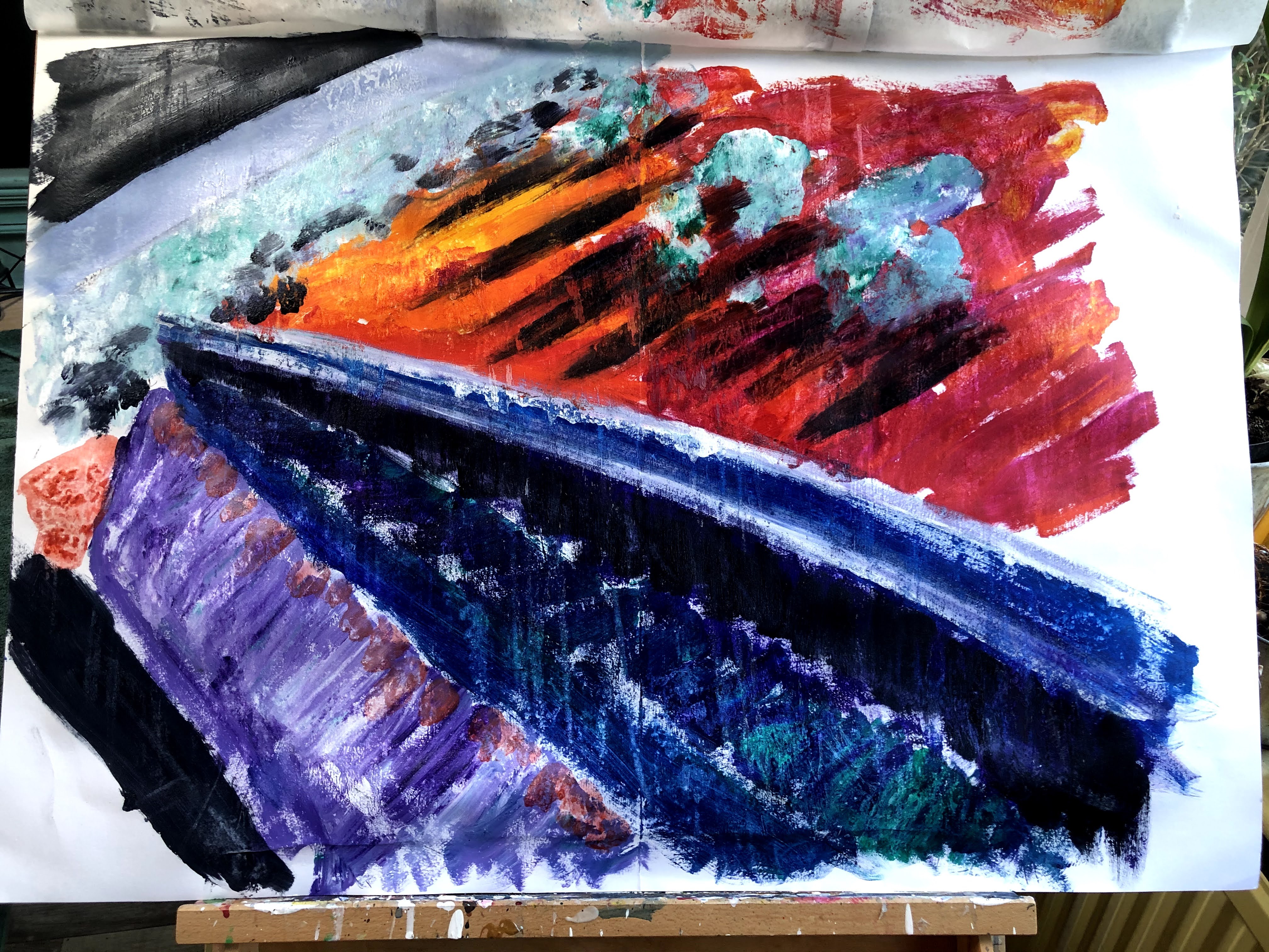 Now that my studio is packed up and sitting in tents in the garden, barring one easel that won’t fold flat, and the drawers of paints that might not survive a dip in temperature, I’m tackling monoprints again in a ‘my way or no way’ way. The image is of a 1096 metre long train called The Ghan which crosses Australia from Adelaide to Darwin through some stupifyingly beautiful territory, taken from my TV screen – a photo of a video in motion which absolutely called for it to be framed at an angle. The ground looks like Mars, the sky thin and blue like the smallest thread of atmosphere, and the black edge of the TV at the top can be nothing else but deep space.