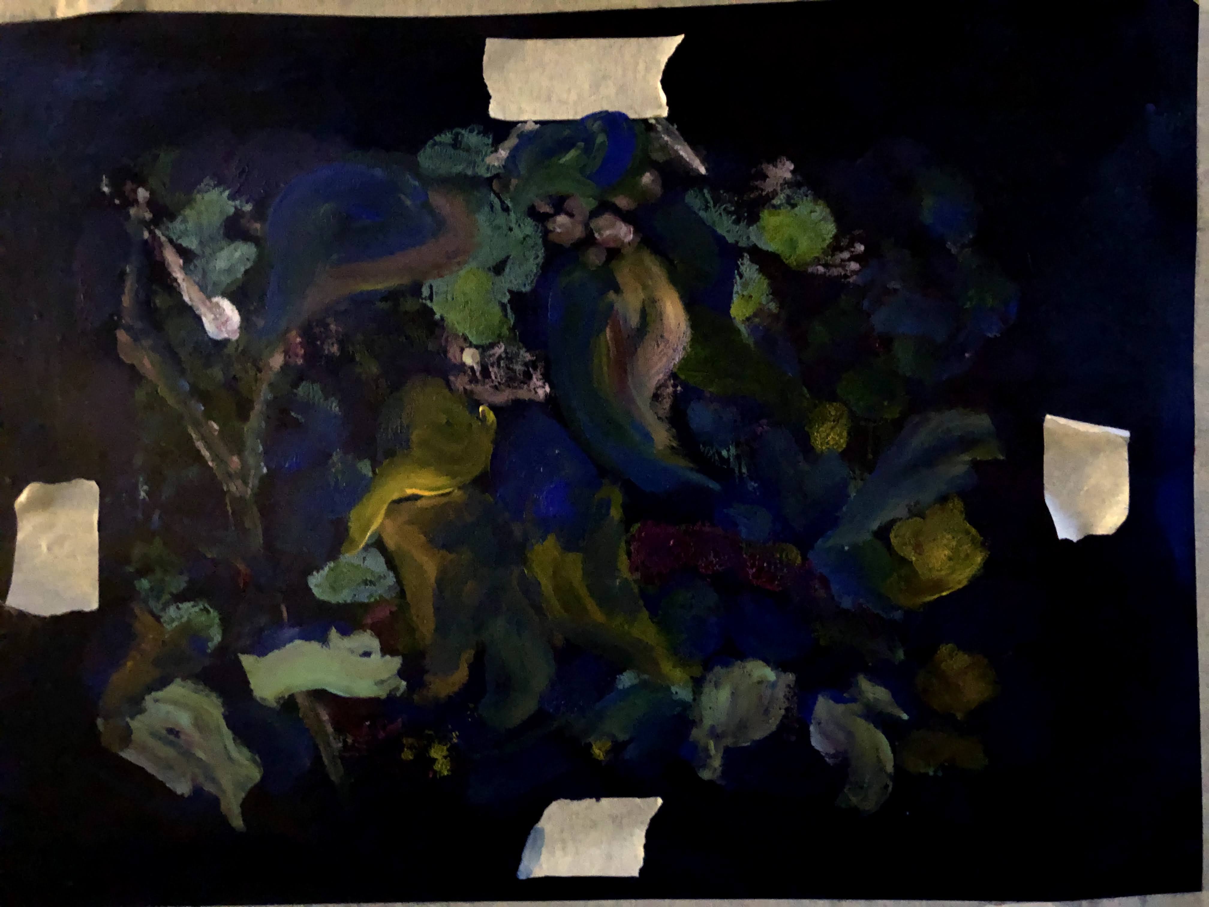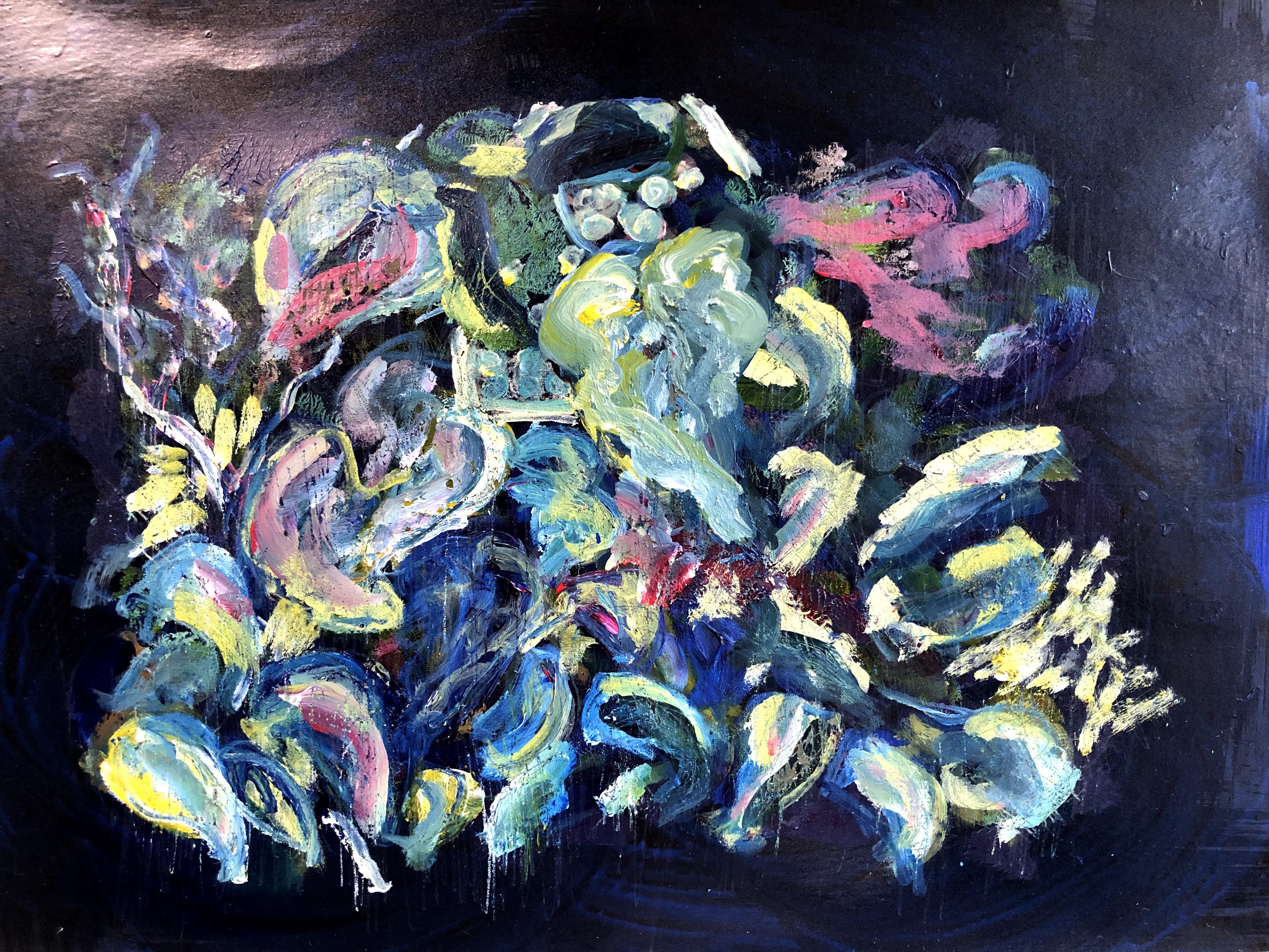 Another aspect of this module is, like preceding modules, seeking to allow development of the artist’s voice, and increasingly I am beginning to understand what mine is. Partly because of close vision deterioration but also due to an inherent expressiveness that’s beginning to find its feet (or arms), I am less inclined to detail and more to making shapes with large flat brushes. I’m very taken by Mimei Thompson’s work and actually copied one of her paintings, but while the colours are as vibrant as my preferences lean, I think at the moment Kim Baker’s work comes closest to what I’m beginning to see as my style. Another consideration is that, throughout this module I’ve been reminded/advised/encouraged to avoid over-working and for me this often translates as an inclination to add detail where space would be preferable. So for all these reasons I’m intending to pay less attention to the detail here and more to the colours, shapes, and impressionistic qualities of the image. I have also become quite fond of painting on gloss varnish – something I would never have considered before this module – and I think, from my experience with the tondos in Part 4, this will allow me to use very fluid paint on an initial underlayer, and then to judiciously pull details out with a stylus. That’s the plan, and to reflect back two levels through Baker to vanitas art, I’m using black cartridge as the support.