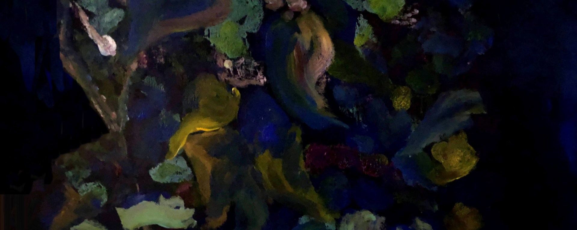 Every layer of paint has been spray varnished before another layer was applied. This was to keep the slippery surface that allows for better and looser movement of the paint. I’ve used mostly a large flat brush but also a smaller round one and my fingers. Unfortunately, I think this is another example of over-working and I should have stopped at that very first iteration. I’m going to give it a final blue/brown wash to dampen it but really I’ve gone down a rabbit hole with it and it’s time to stop.