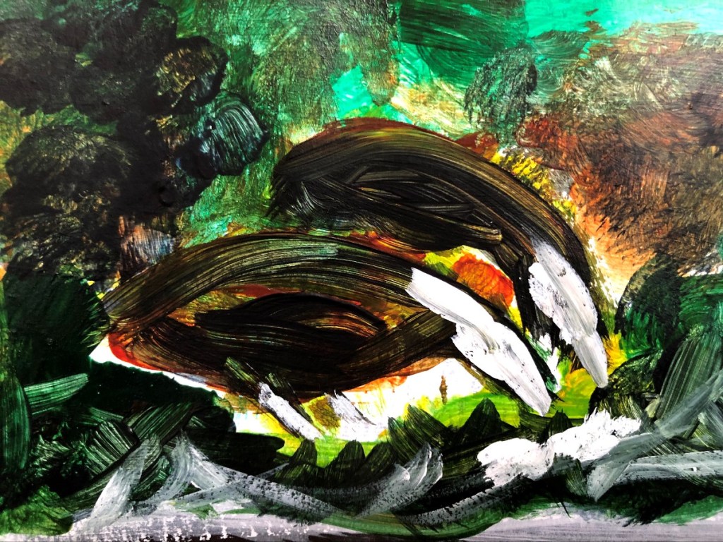 This is the end of the line for this blog; the paint has been splashed and dripped, dribbled and scratched at, trowelled on in great wadges, and spread so dilute it’s barely visible. It’s been applied under, over, and around bits of packing paper; I’ve stuck string and dead grass to sheets of cartridge, and let the local wildlife make a Pollock. The blog will stay here so new starters can see what 61% looks like, but don’t skip to the end to see how it turned out, look at the struggles I had at the beginning, trying to make sense of it all. Those struggles are what made the end result happen and if I have any advice, it’s to let yourself off the lead (leash, if you’re American) and take some risks.
