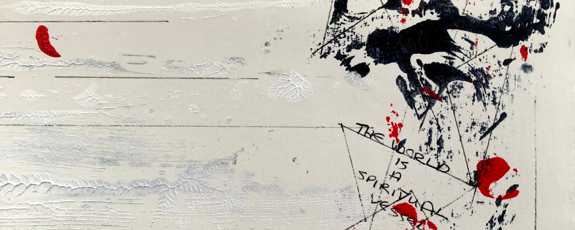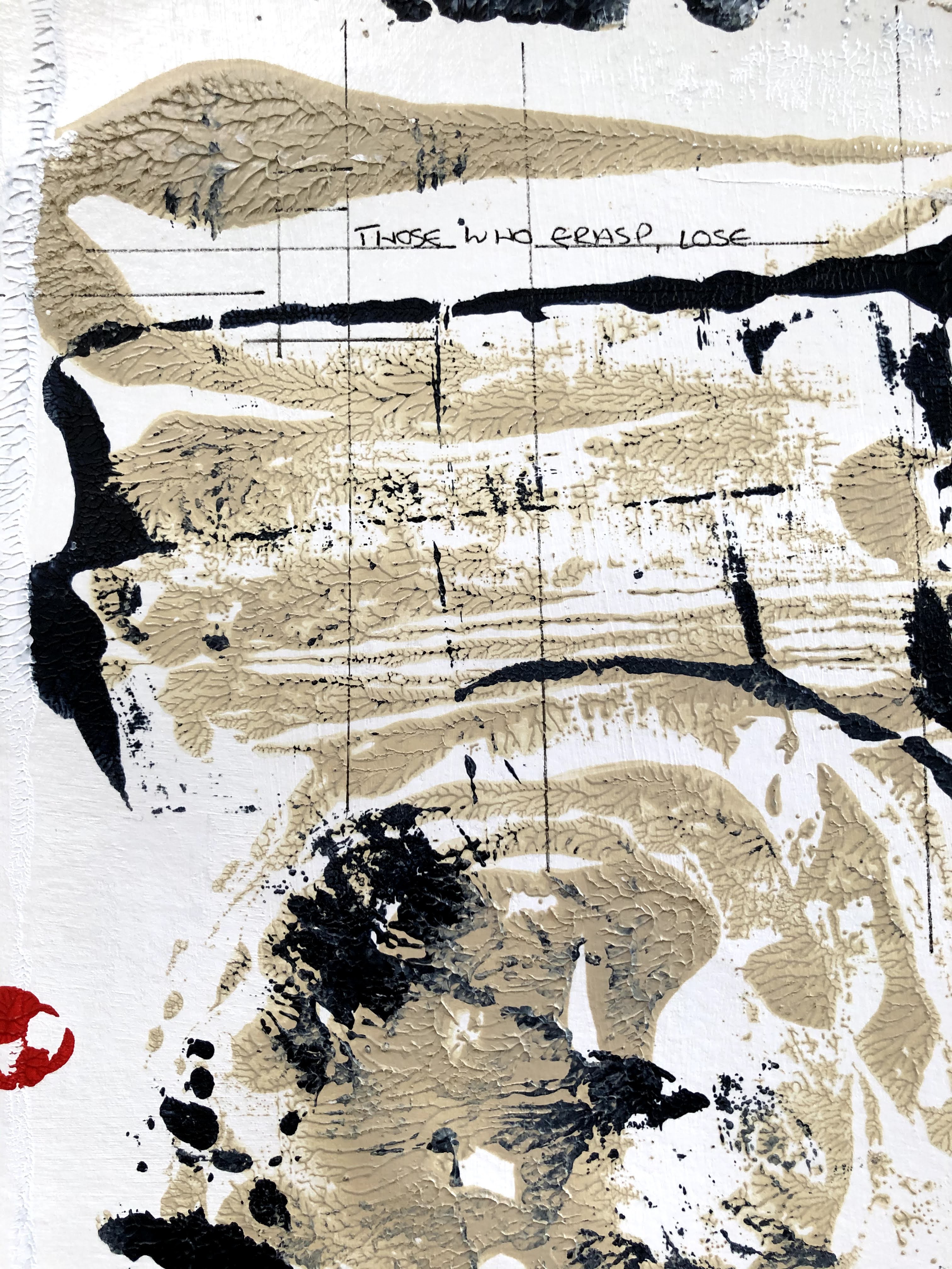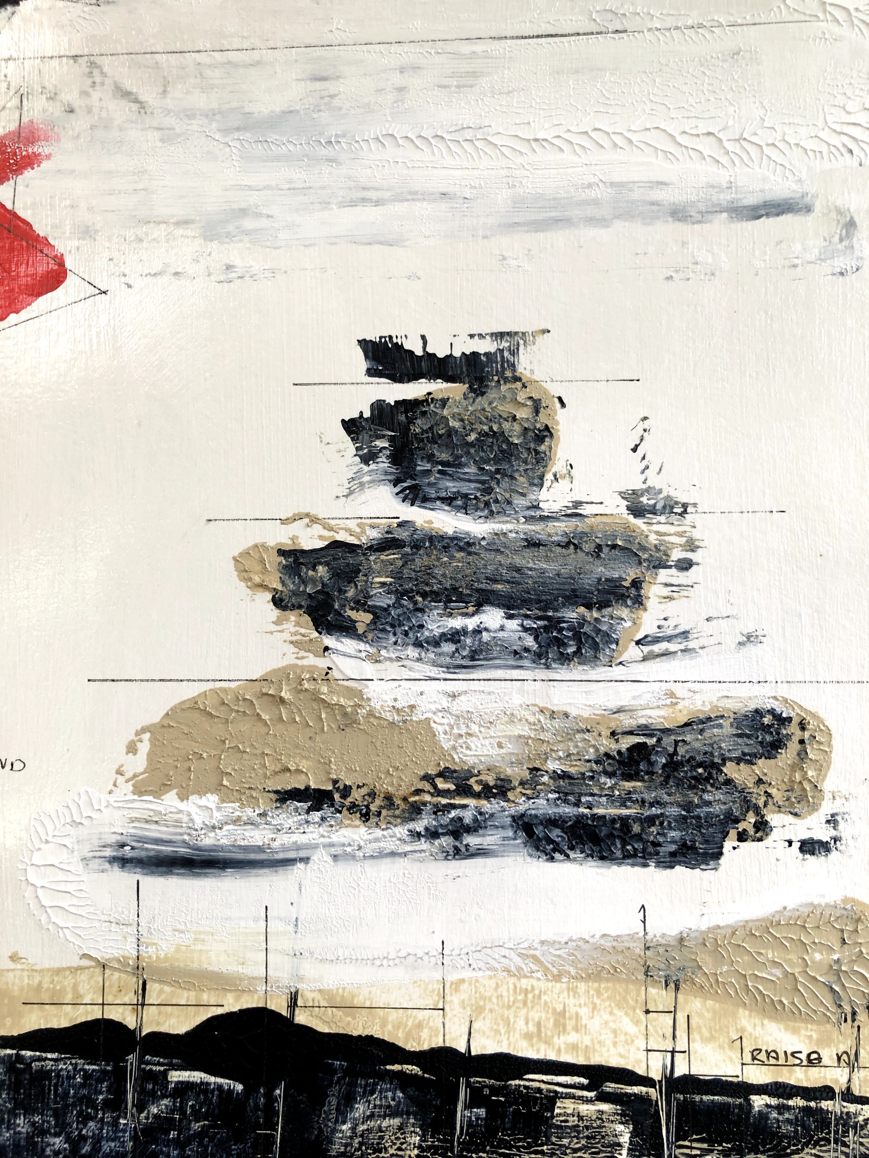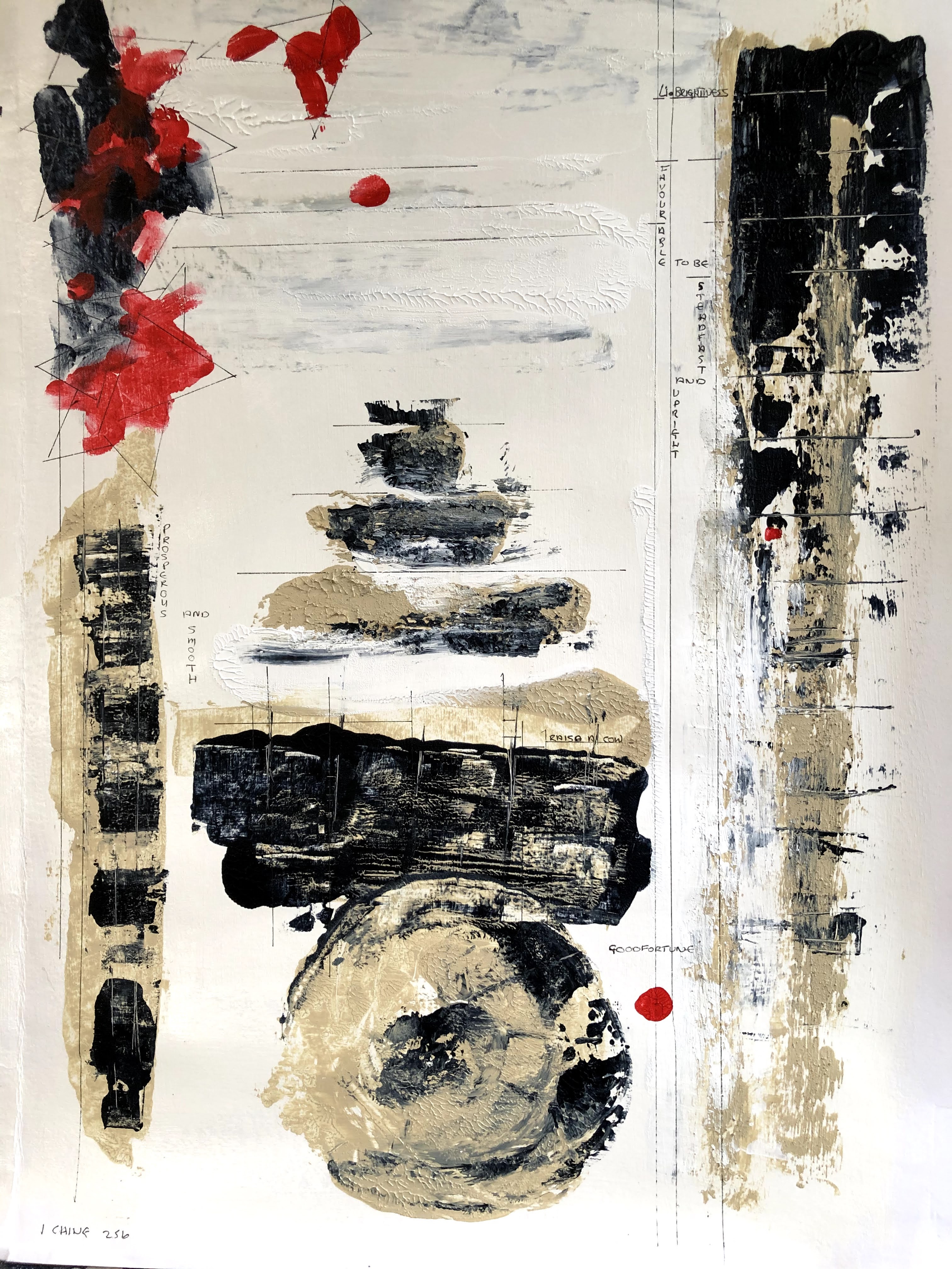 The hexagon of the I Ching is formed by the three lines – continuous/broken/continuous – in the white central area at the top of the painting, and in the pyramid shape beneath it. The text is selected from that configuration. Media are acrylics (T. buff, Payne’s grey, and Cad. red hue) applied with a palette knife, and fineliner 0.4.
