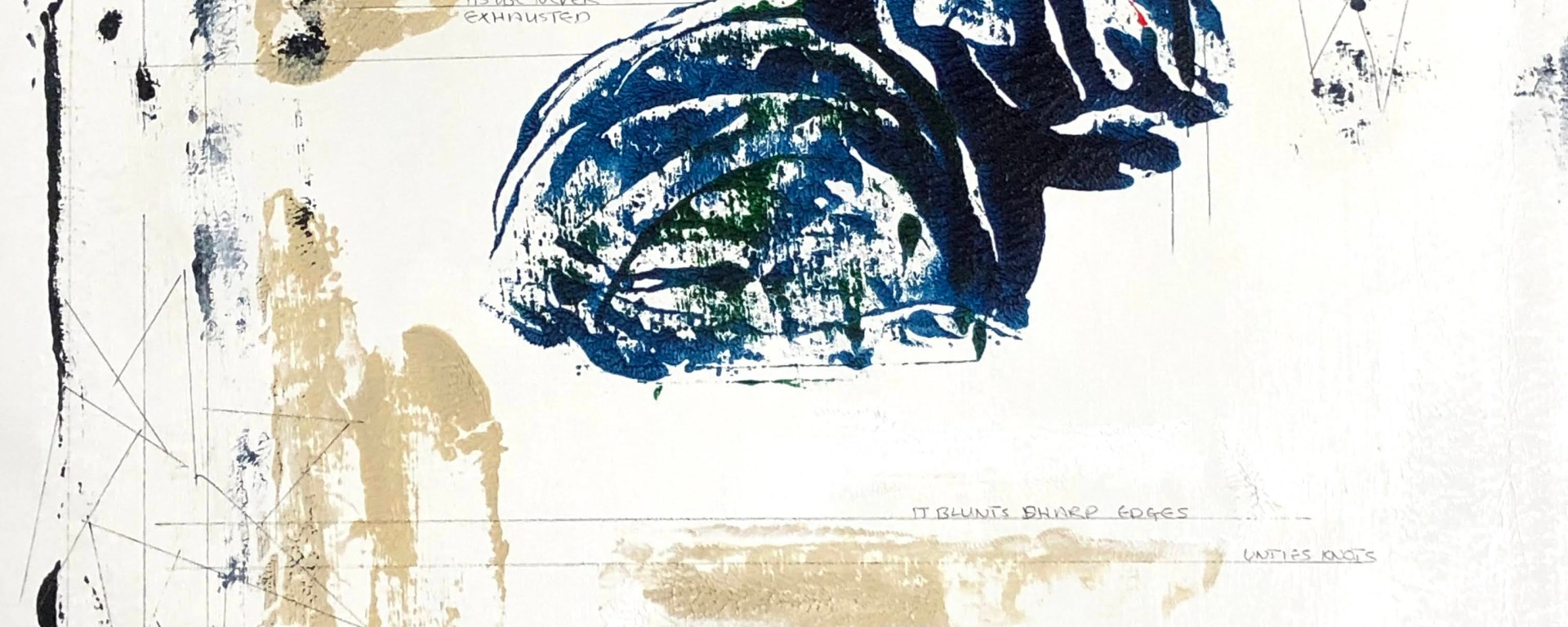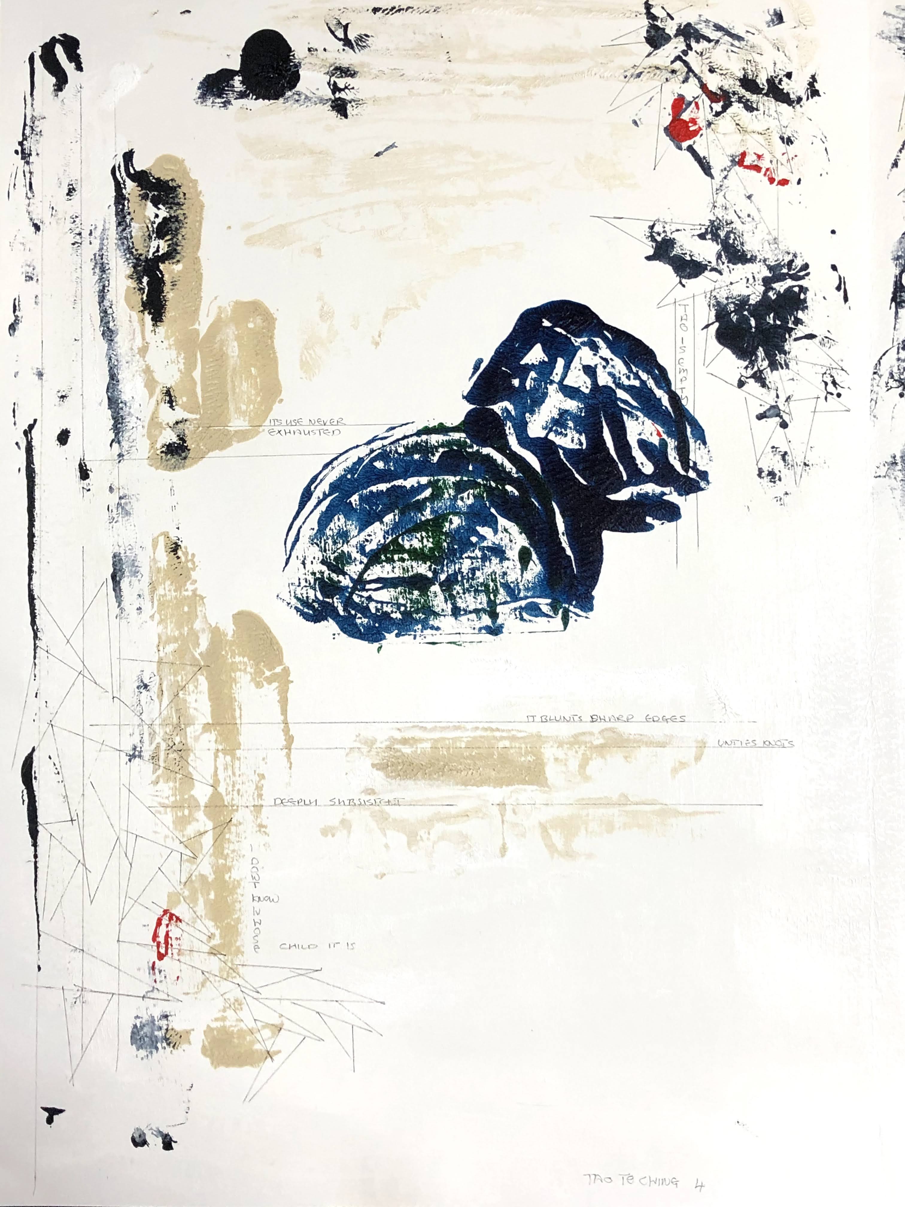 Again this is an abstraction but with some sense of a representative anchor. The vertical lines to the right of the painting and beneath the tents reflect the lines of the I Ching hexagram – solid, broken, broken; solid, solid, broken. The triangular shapes represent foliage. Paint was applied using a palette knife and my fingers.