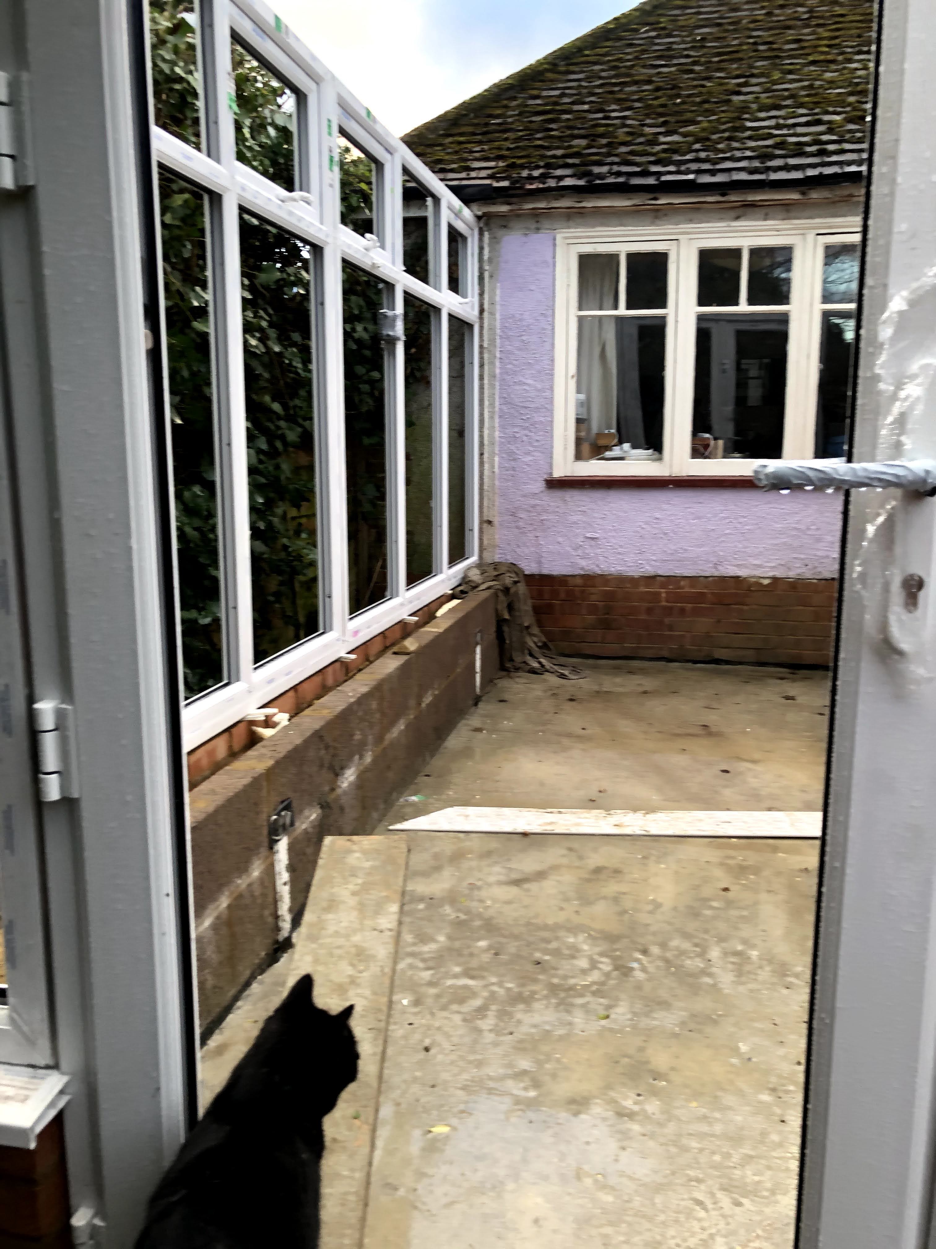 1st February. The roof and window glass is due to be fitted tomorrow but in the meantime a downpour made a pond of the floor so that the cats had to paddle to reach the cat flap!