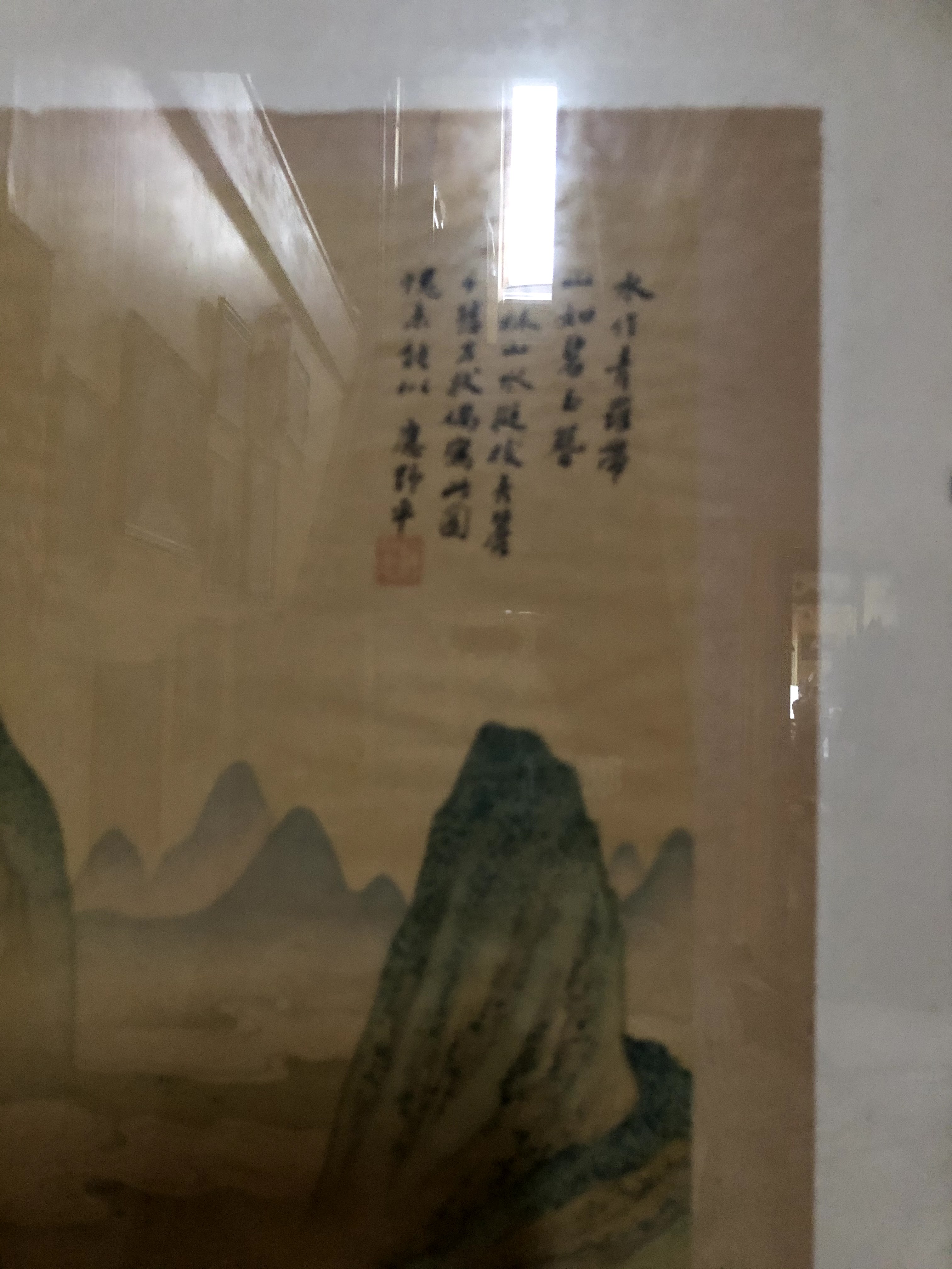 There is also this, brought for me from China by a friend back in the 1970s and so familiar from being next to my front door that it’s seeped into my unconscious and goes barely noticed. But here is the parchment shade, the blue-grey, the green-blue, the pinkish tones, and the vertical script that felt right for this work.