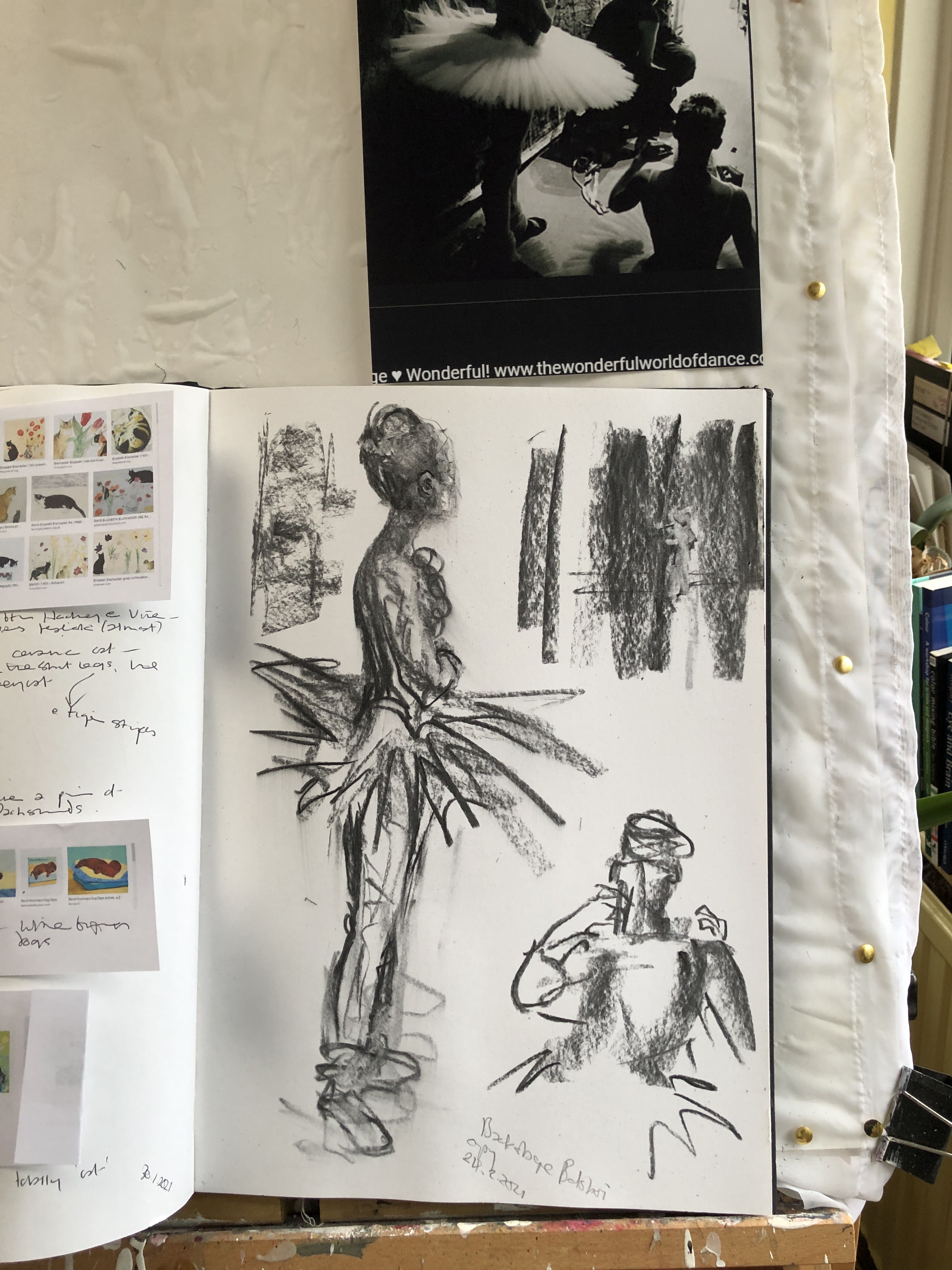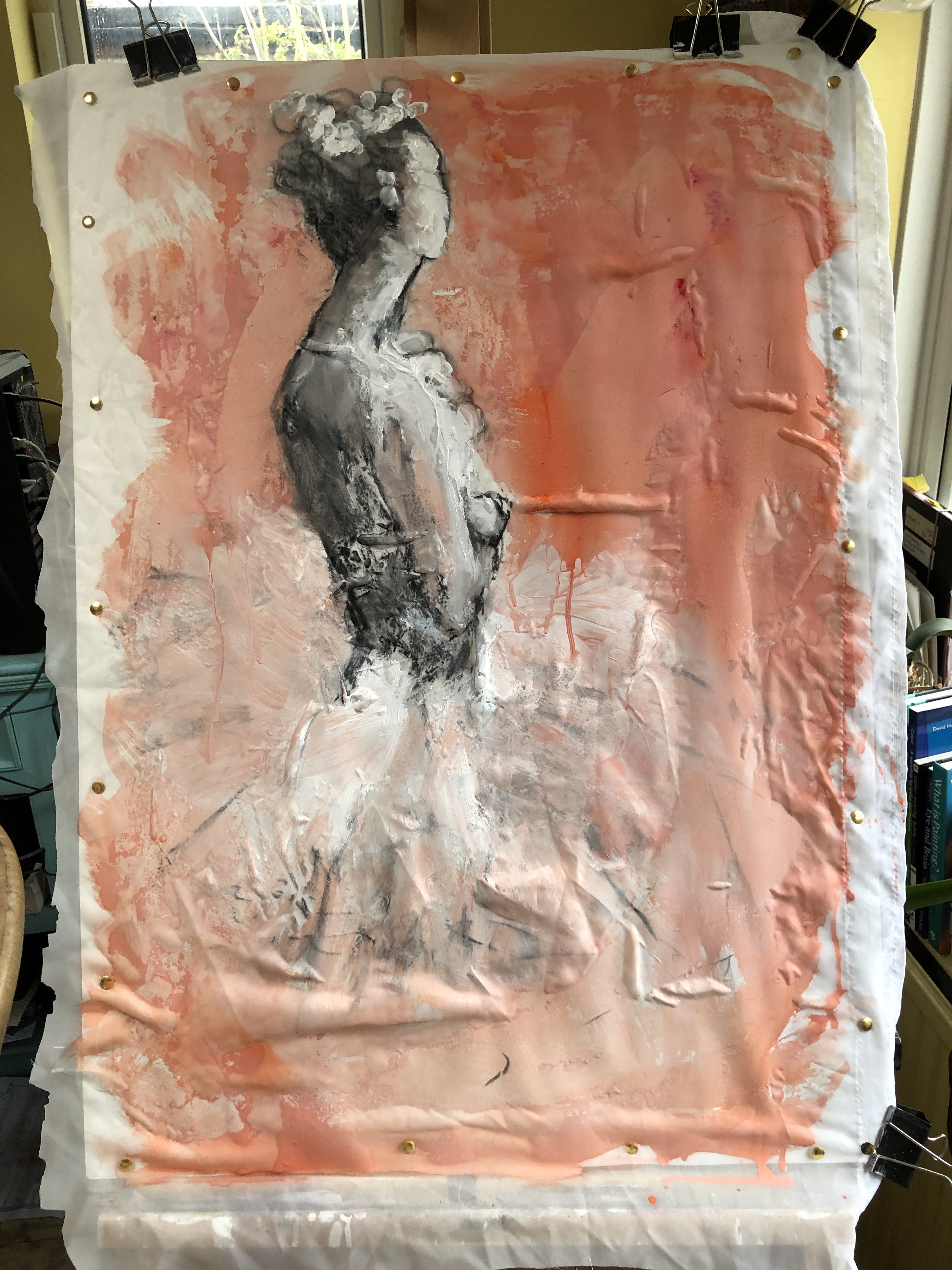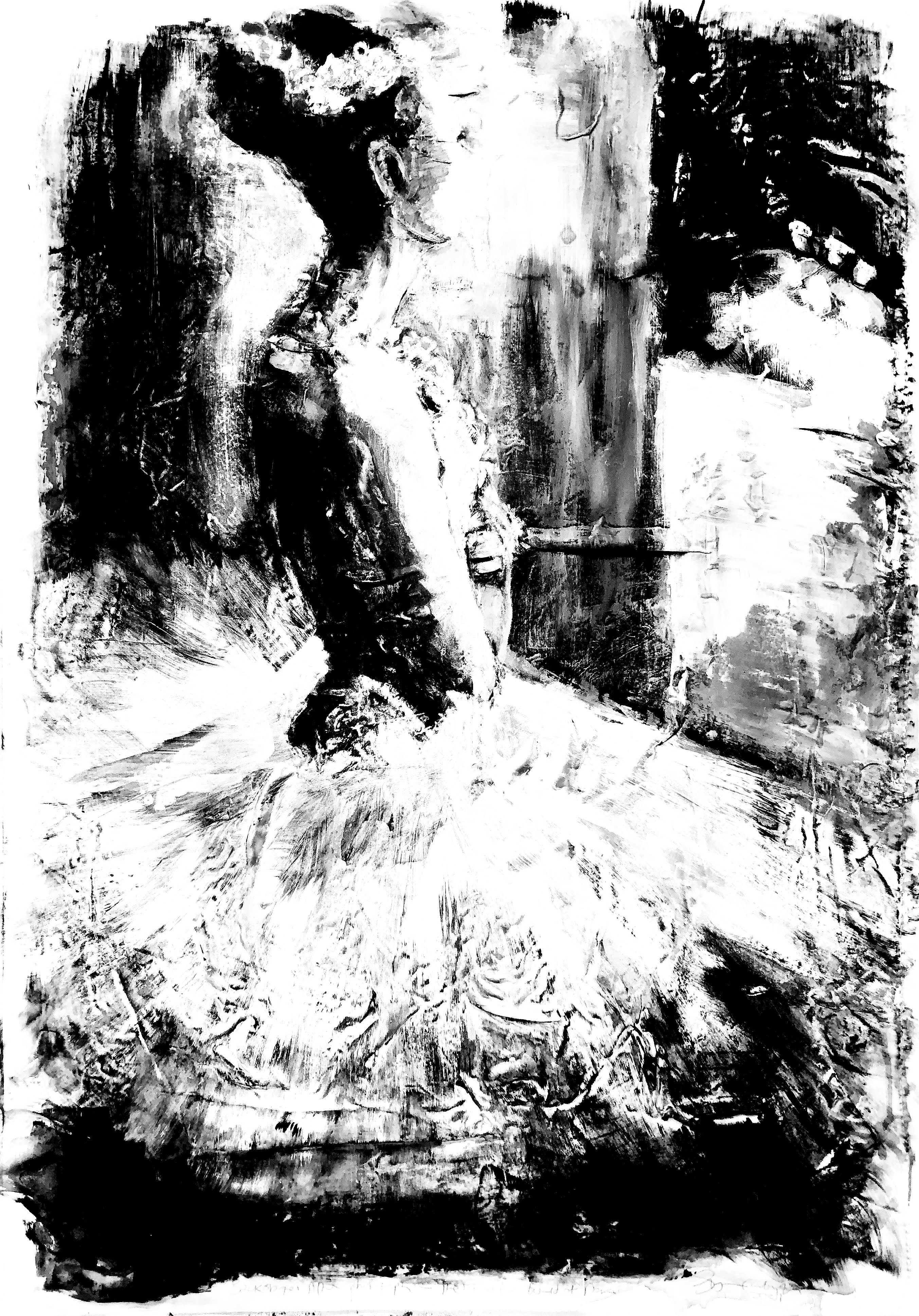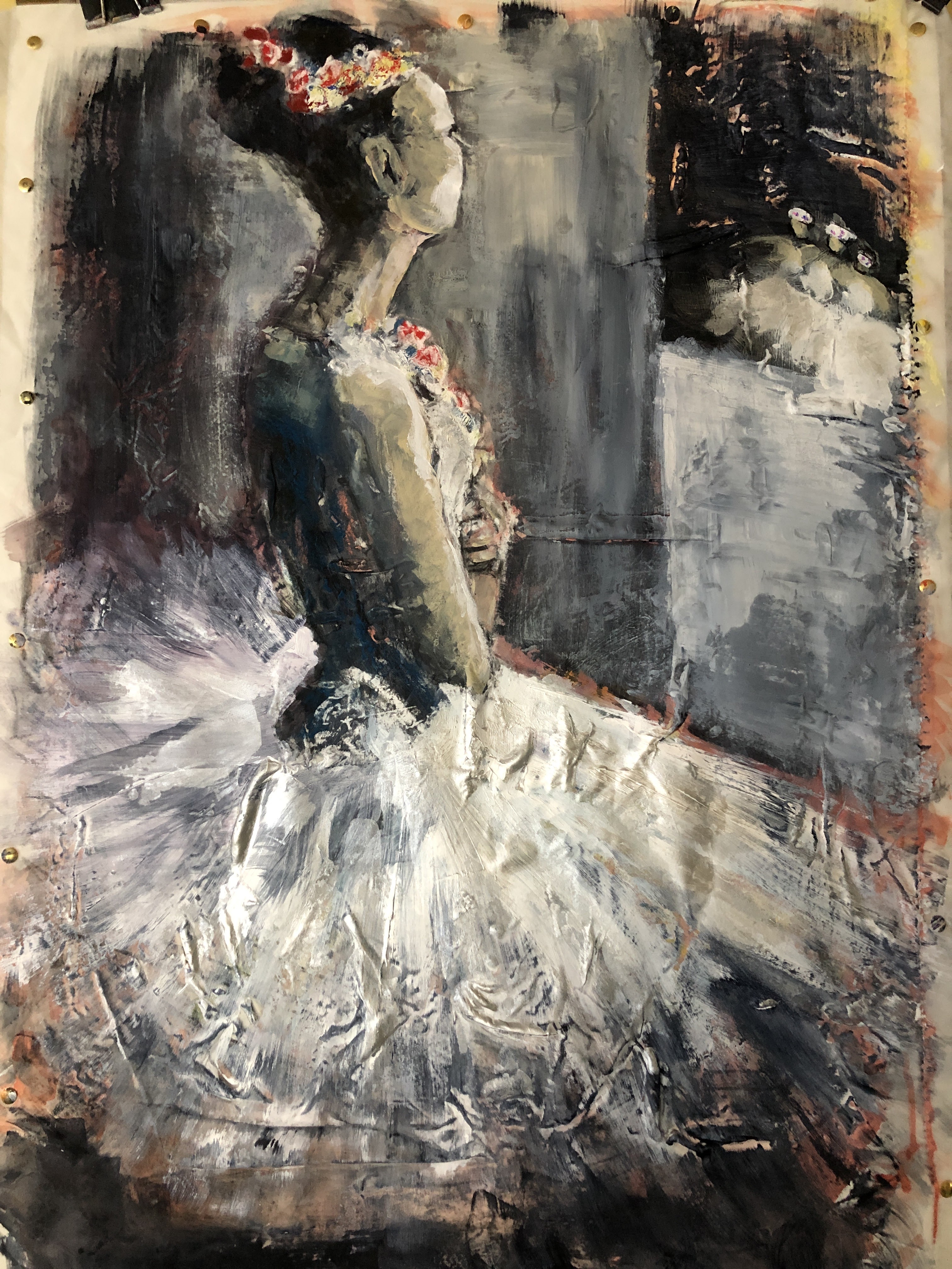 I’m adding an imagined background of corps de ballet performers to provide focus because the single male figure has, for me, more of an oratorial stance than a balletic one. Also, if the corps de ballet is on stage, this dancer becomes one of the Principals doesn’t she? I may add some silver to her costume.