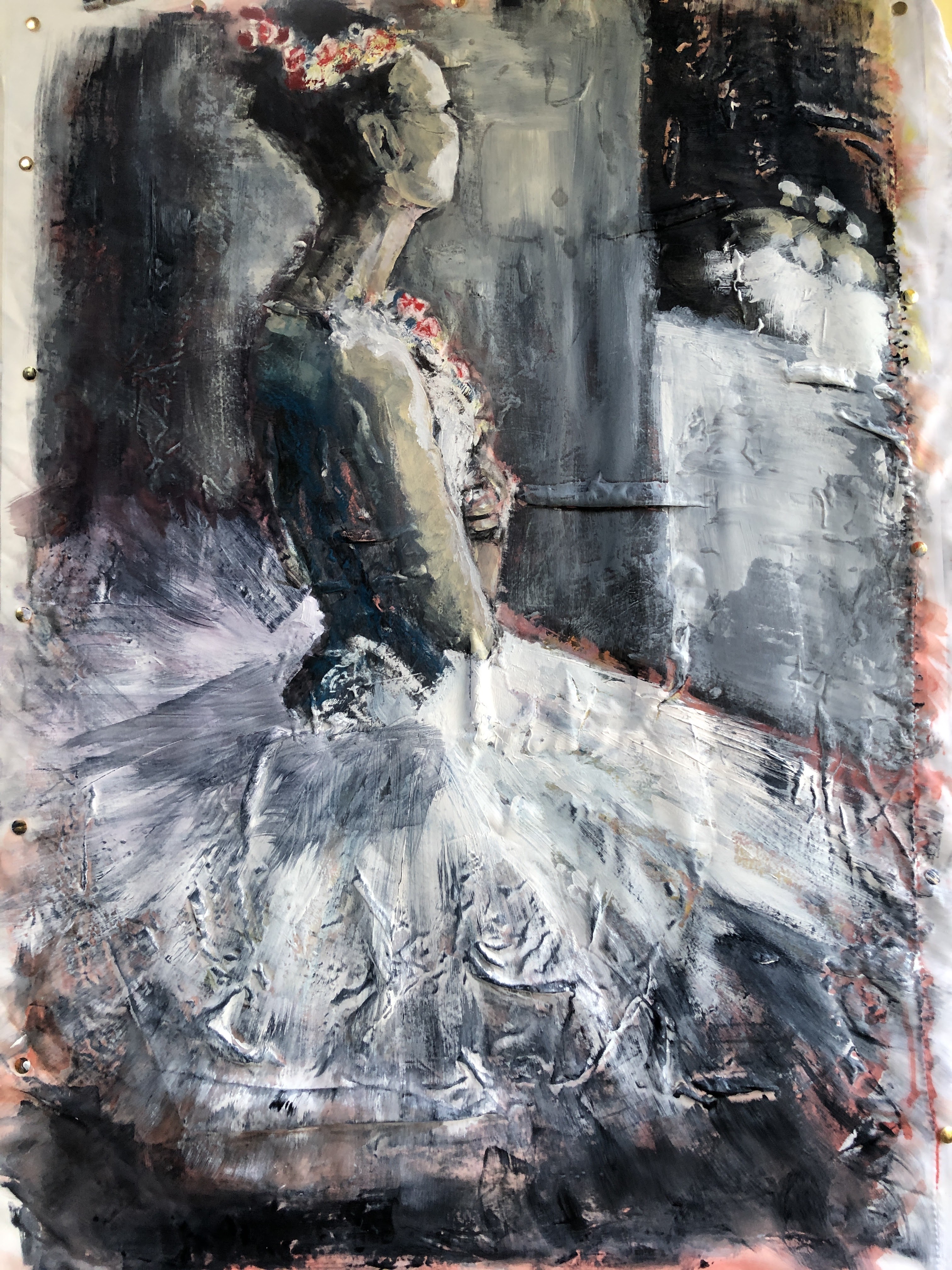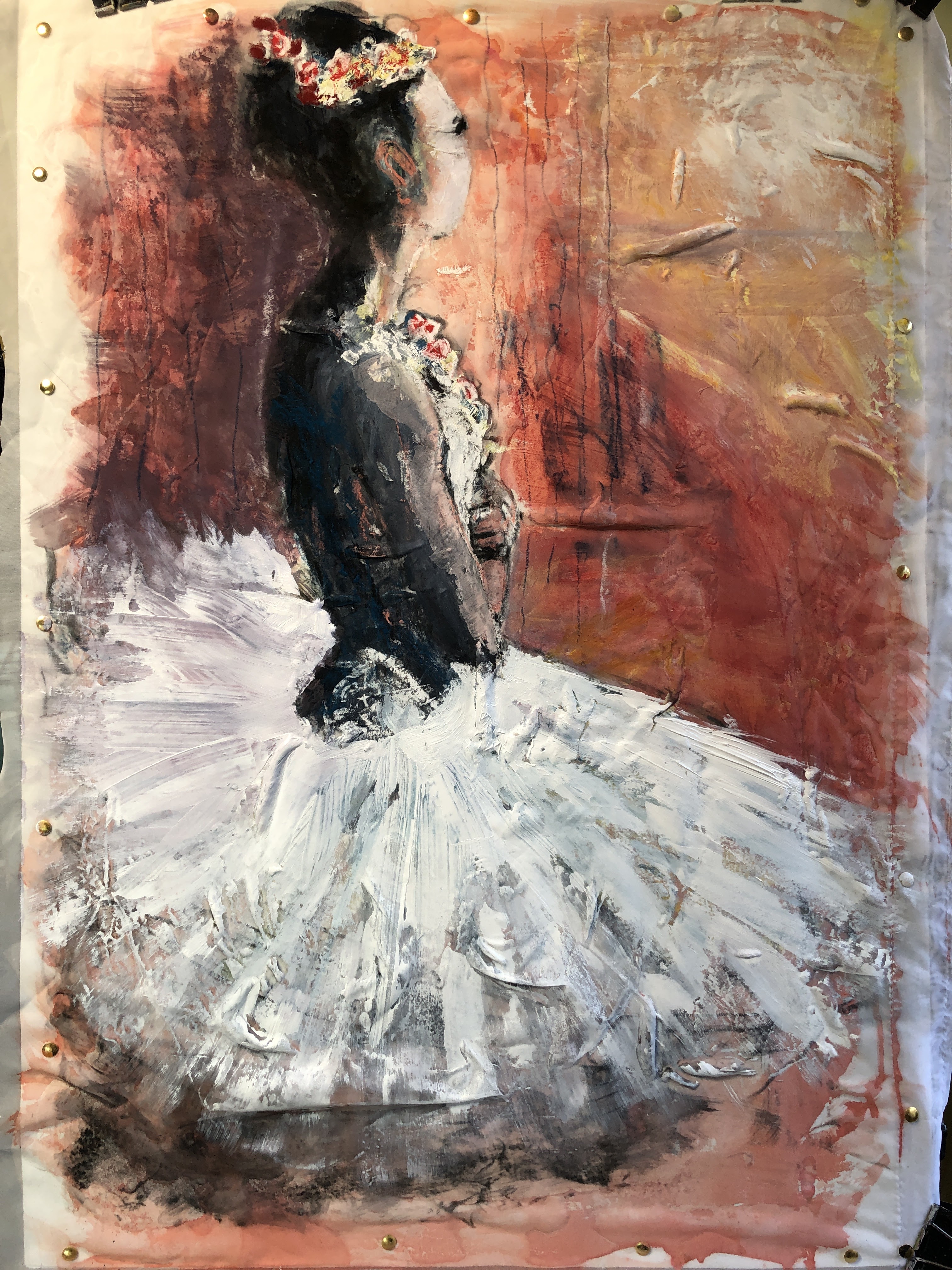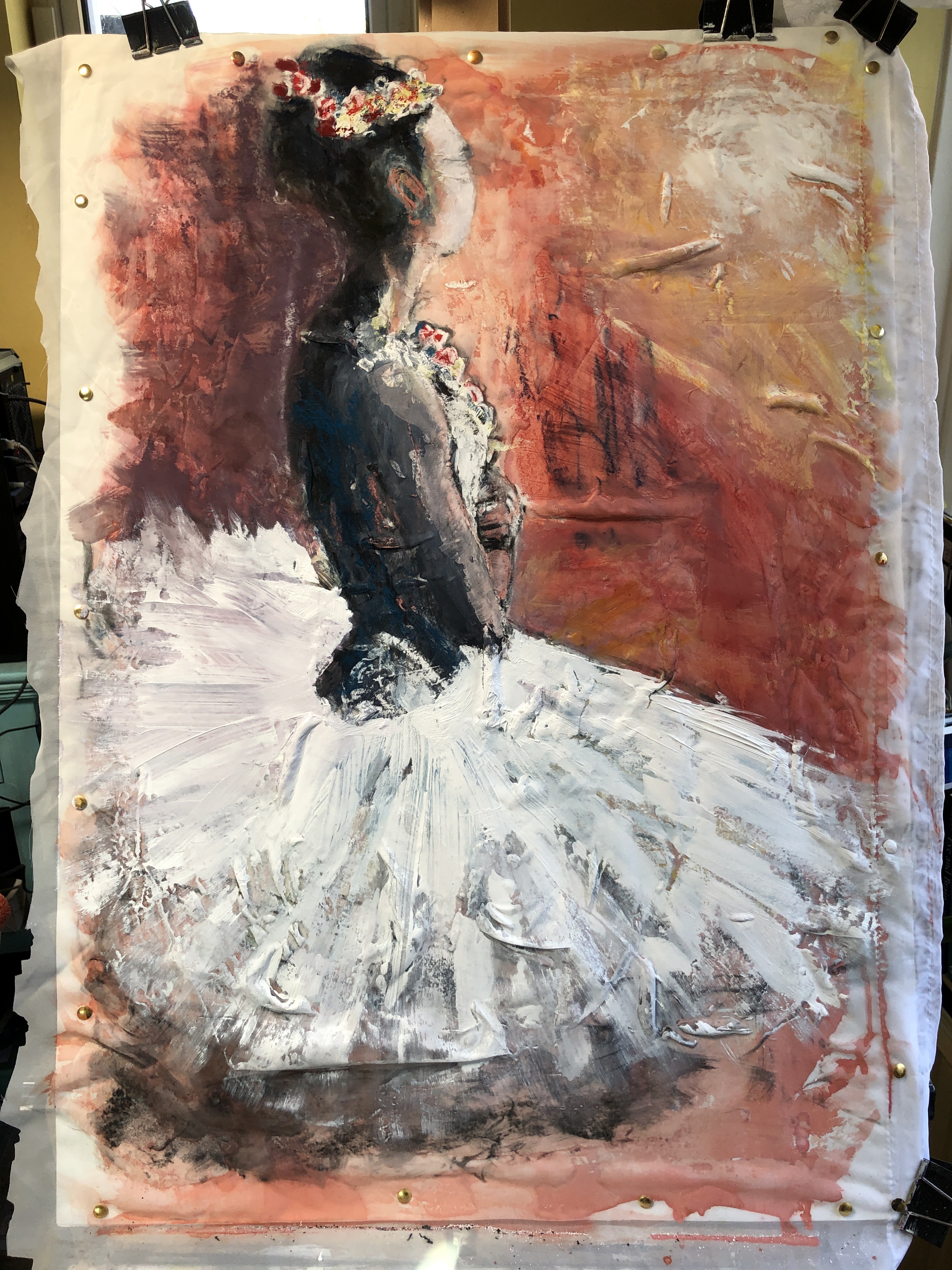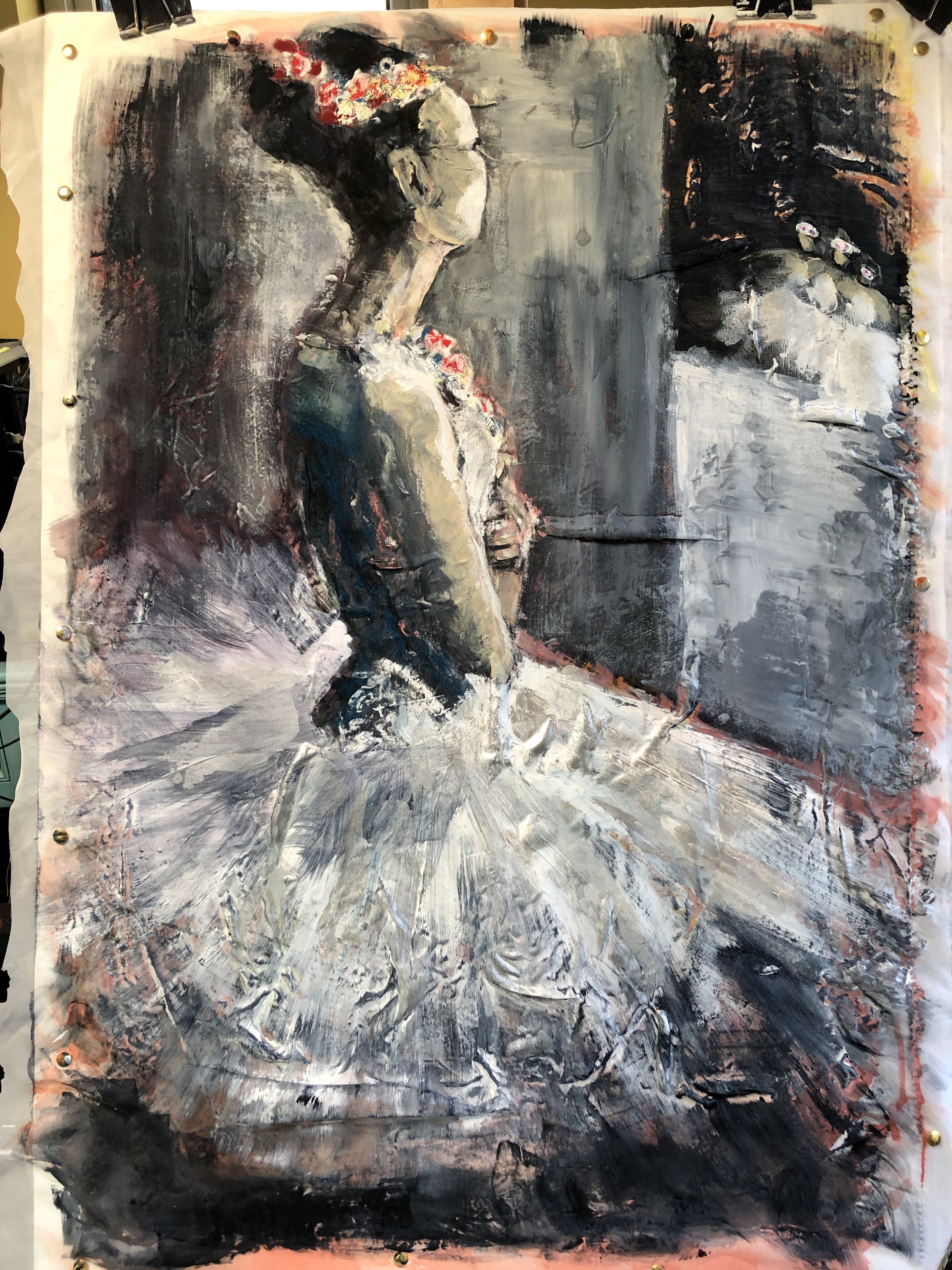 We’re in the realms of tiny adjustments now. The silver acrylic is on – swept over the ridges made by the net to capitalise on the suggestion of brocade that creates – and some black acrylic pen to the dancers top right to fine down some of the shapes I’d put in place with a finger. I’m beginning to like it.