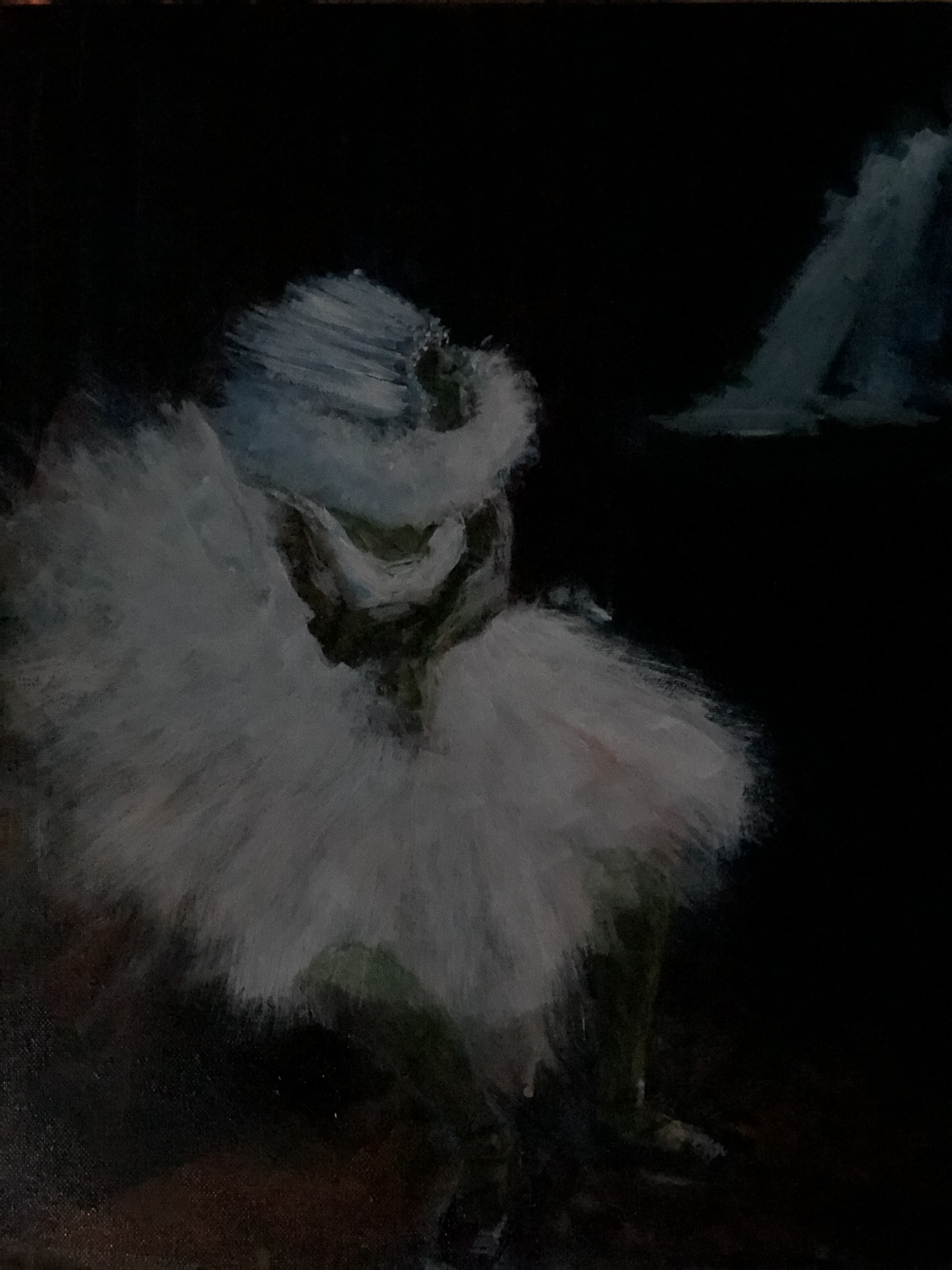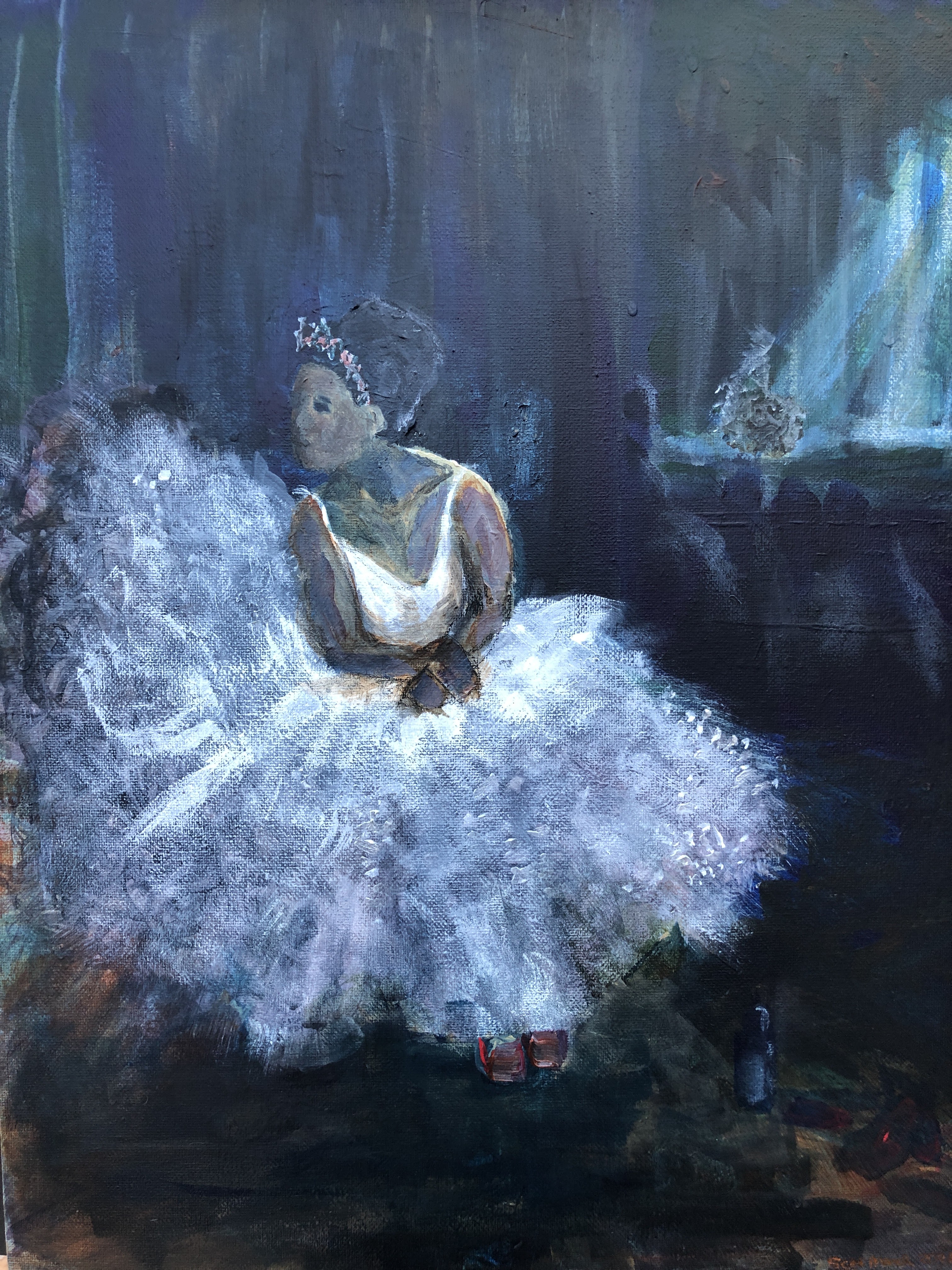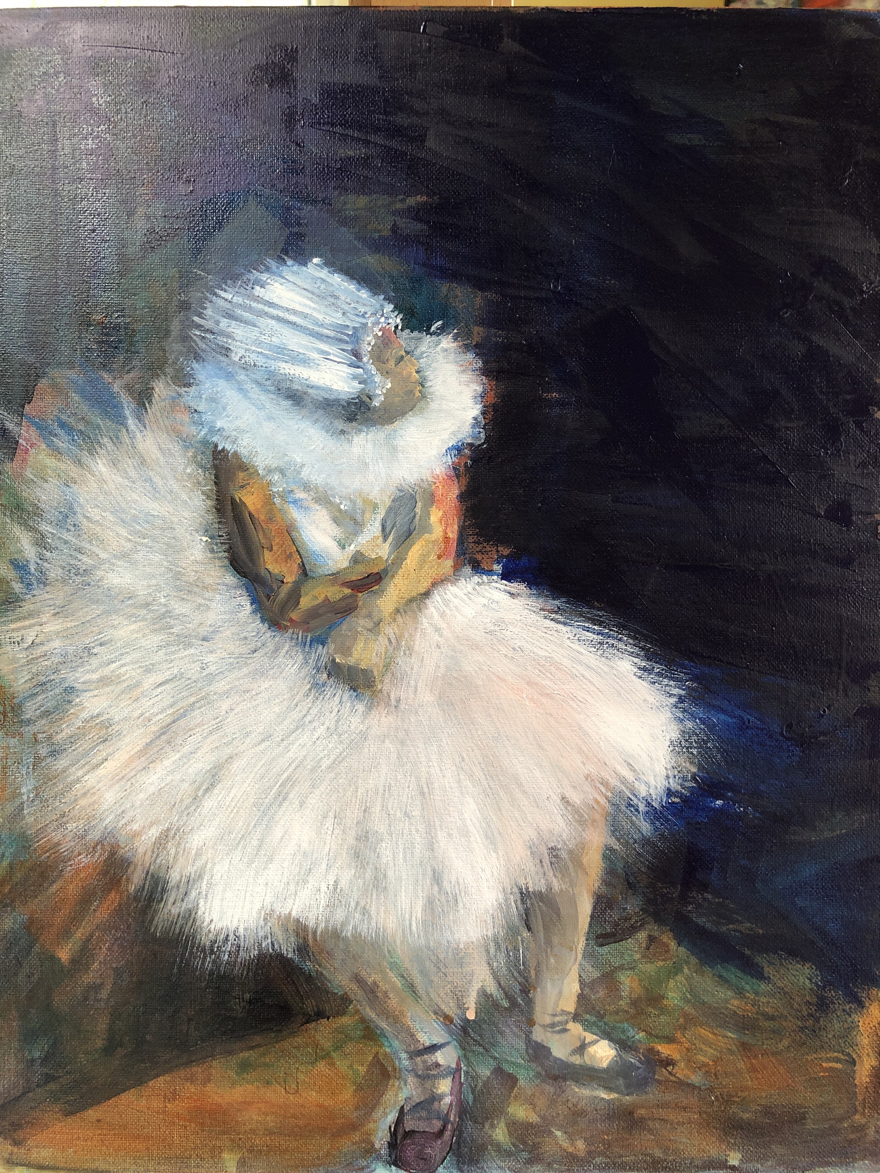 6th March. Pursuing the ballet theme because I’m beginning to get a feel for the shapes, the colours, and the way light works in backstage/onstage contexts. This time there is no reference photo or painting although I did use one drawing by Degas for the angle of the head.