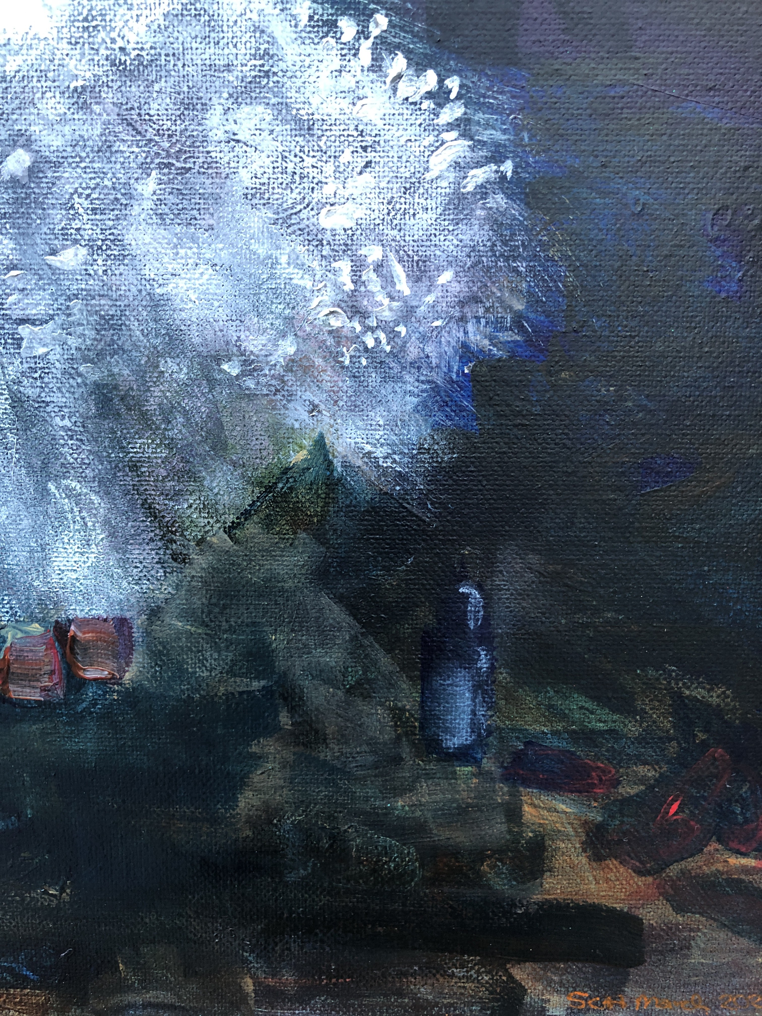 So what have I learned from this exercise? First, have an idea of the narrative – what story is the painting telling? Second, understand where your model (or invented model in this instance) is positioned and how her infrastructure works. Some decent sketches would have helped but no, I plunged in on an optimistic wing. Third, the best things are the loosest – that bottle and those barely discernible shoes (also some of the shapes and marks in the very first layers). Fourth, some things can be fixed but not very well if you can’t ‘see’ the underpinnings and given them appropriate weight in response to gravity. Fifth, this is much smaller than my preferred size so detail is more difficult, but – Sixth, I like how paint works on canvas because transparency behaves differently. Better invest in some bigger canvases, then.