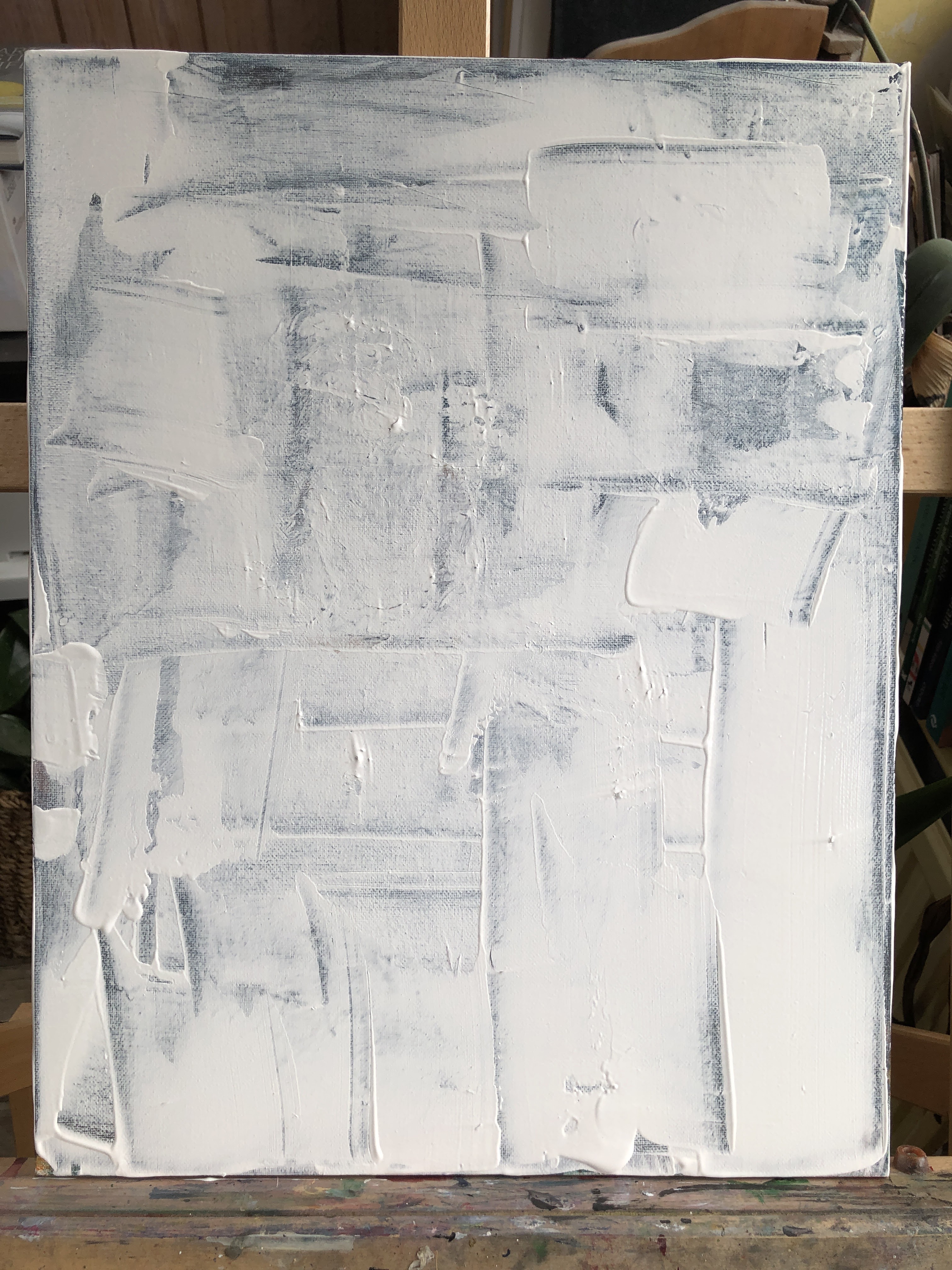 Once I had some clear figurative elements, I began painting into the shapes with T White, Payne’s grey, and Naples yellow, later washing the whole with alizarin crimson, then burnt sienna to reduce the pink which was making it look rather chocolate box. I’m using a pre-stretched canvas and the difference this makes to the application of paint is quite starting at times. And of course I’ve added a layer of gloss varnish.