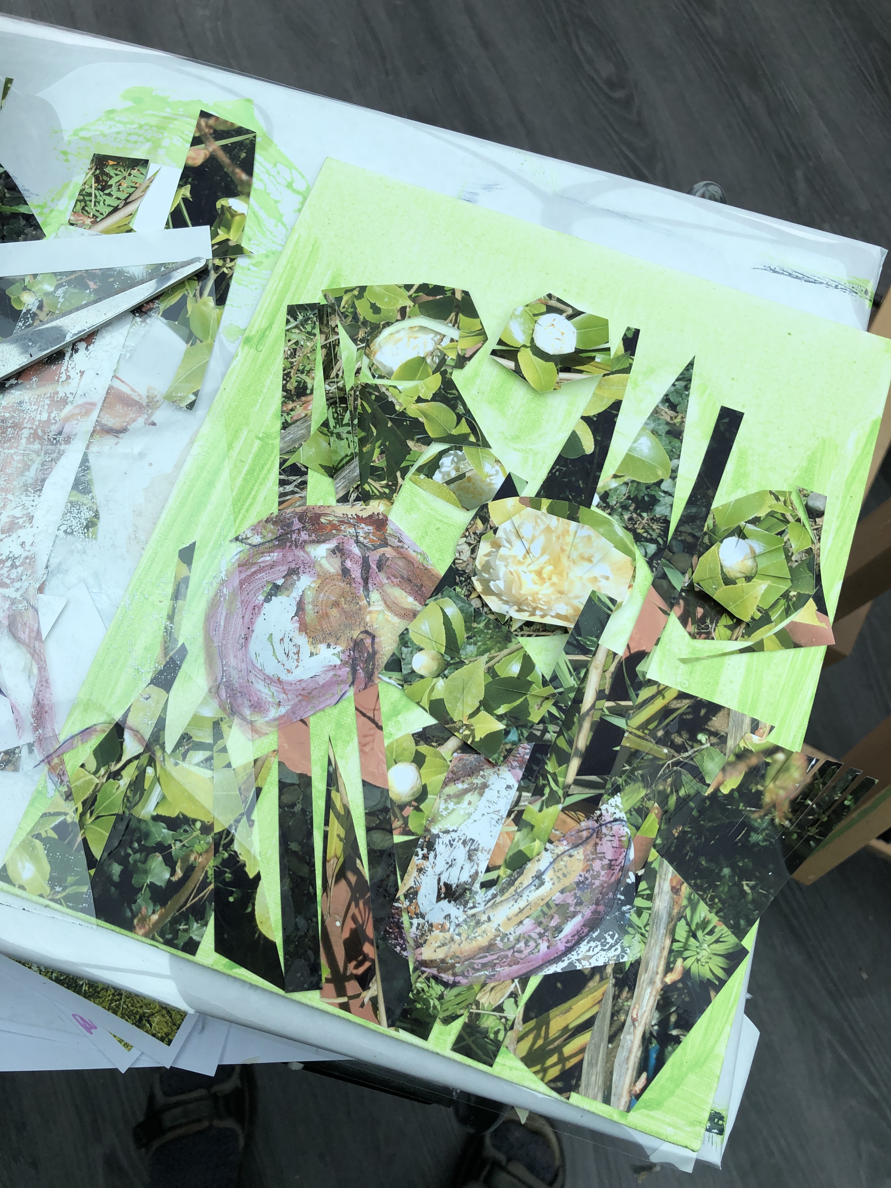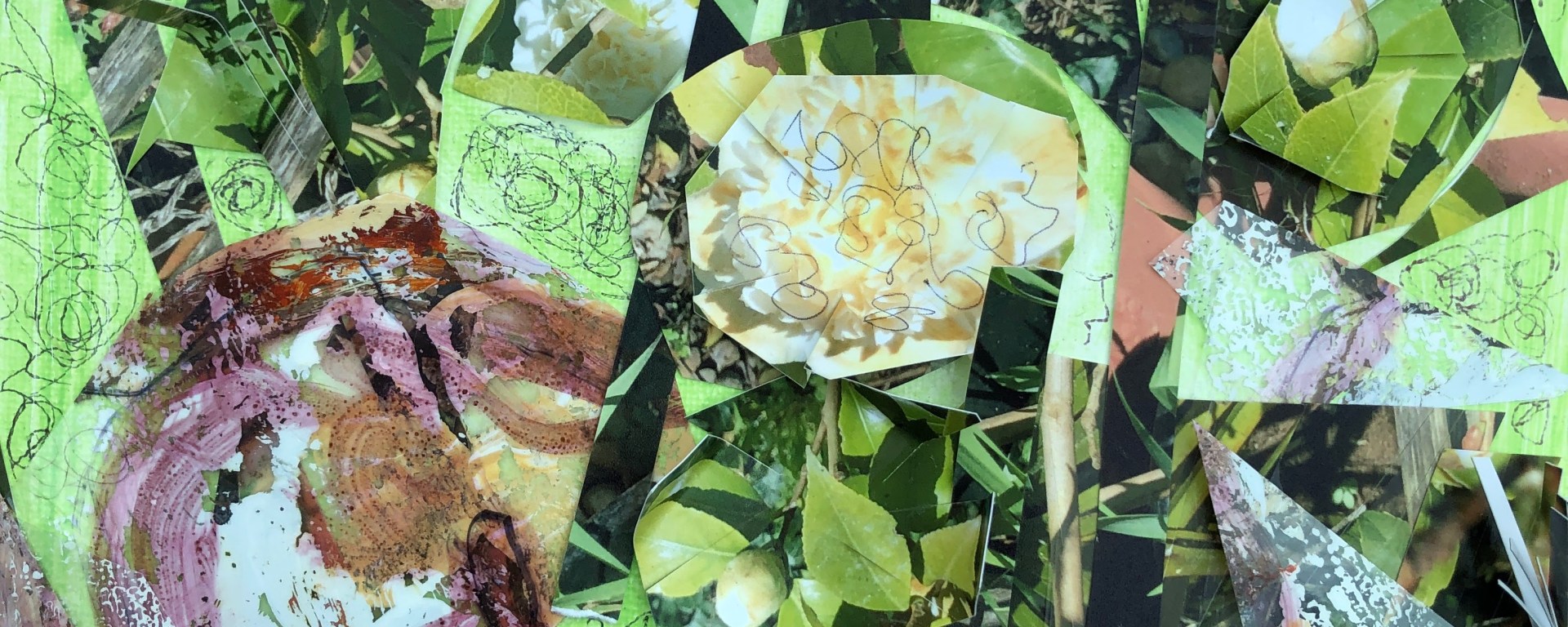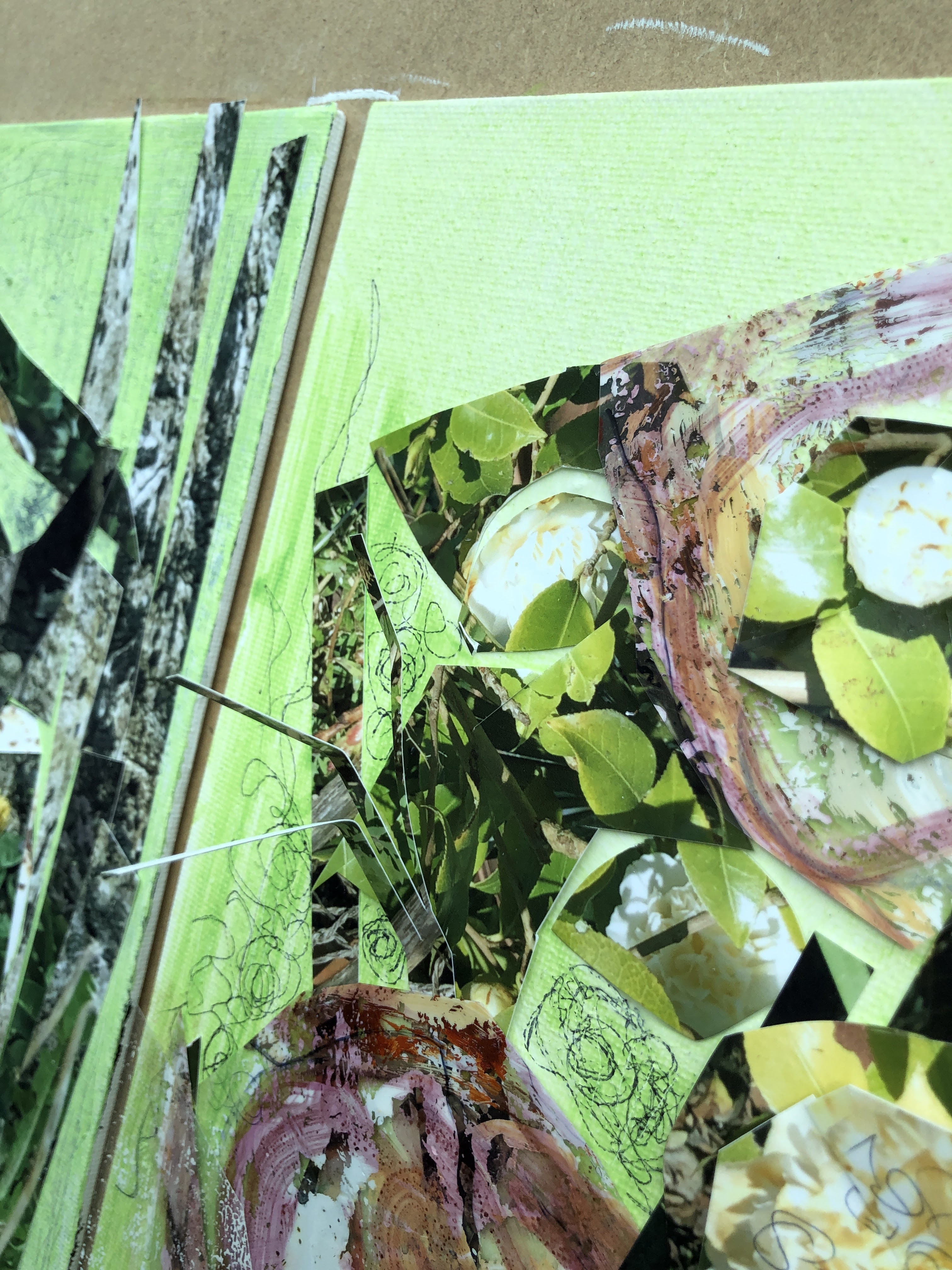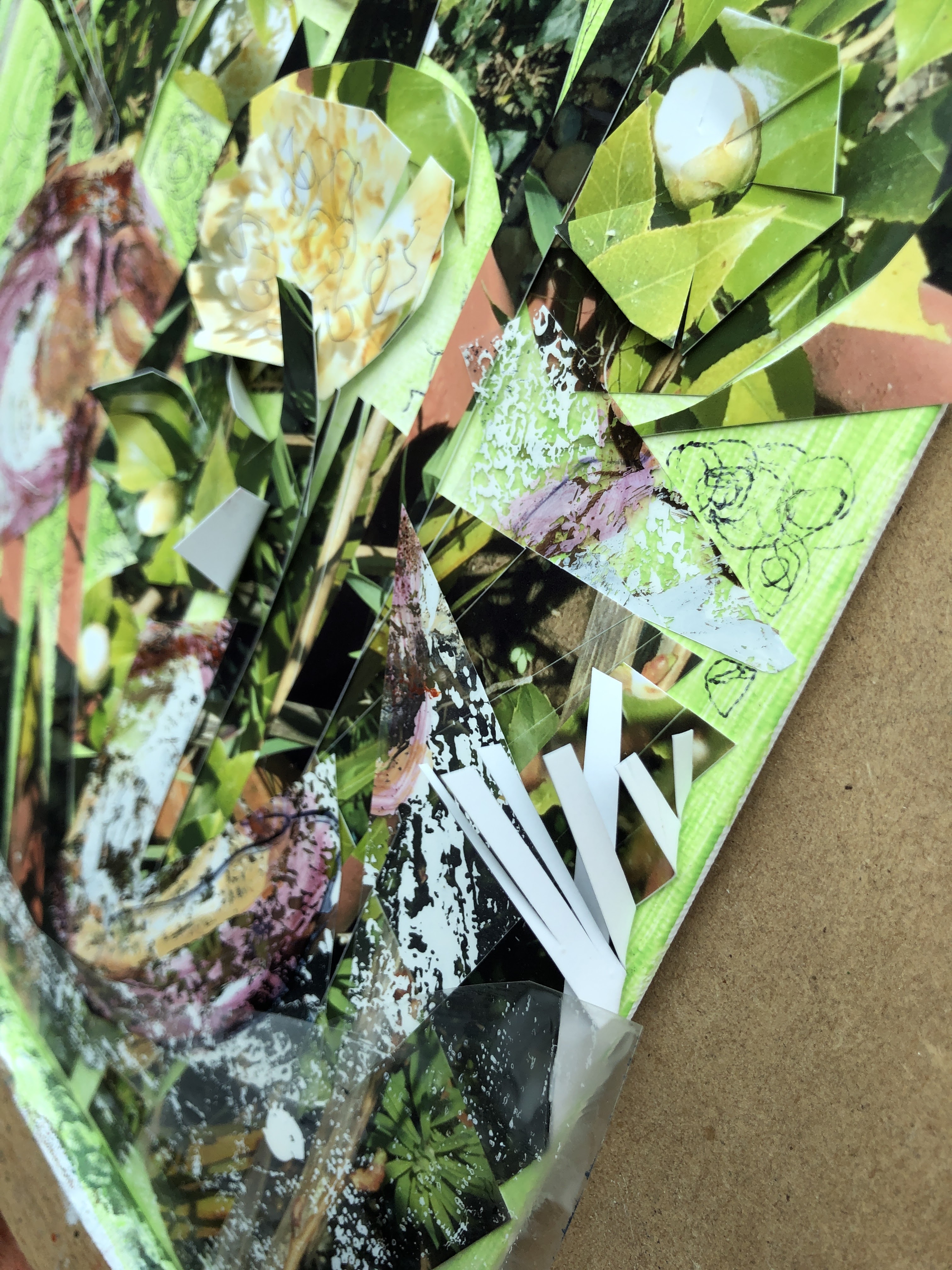 The rest is collage from two sources; the photo and a piece of film I’d used in the previous mushroom picture to transfer paint from one surface to another. It had some nice pinkish browns on it and some rough textured white.