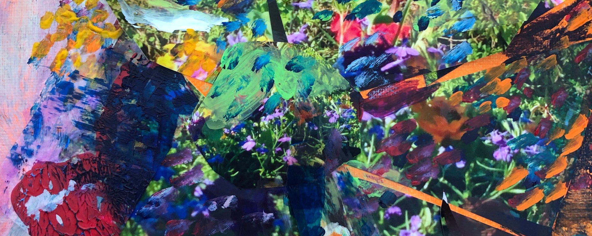 As I’m reasonably sure another 8″ x 10″ canvas board isn’t going to suddenly materialise, this is the last hurrah and it features a hanging basket tumbling with colour from a few years ago. There’s an orange wash on top of the gloss and at this stage, I’m just piling clips from the A4 photo and a small set of crops onto the board to describe the chaos of the tumble. I have a mind to make more blue and the orange is there to pop that out. Of course, that might change because, well, pink. There’s a lot of frill and fringe going on here because so many of the leaves are tiny and not at all ordered.