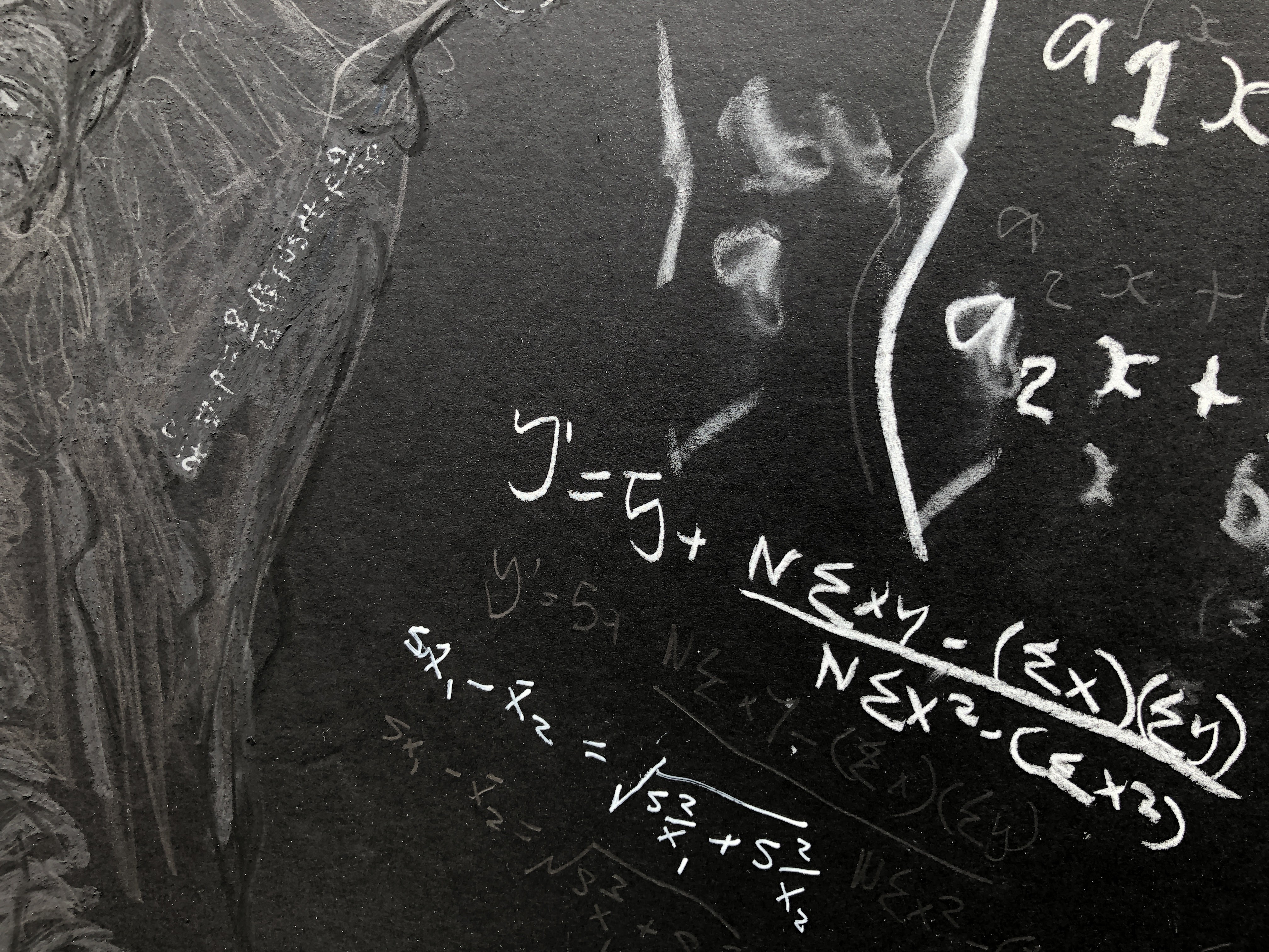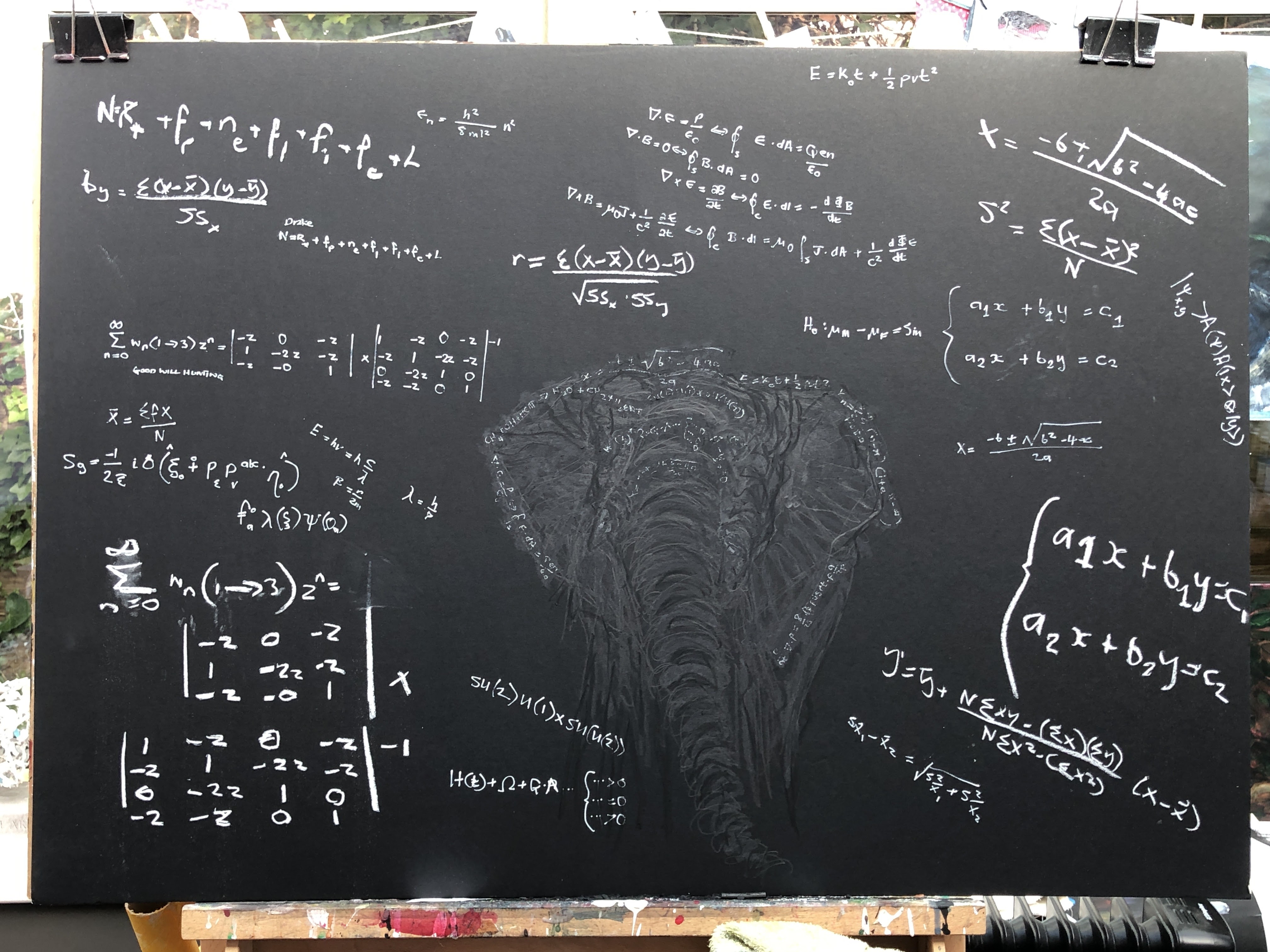 This is the result of several episodes drawing in the shape of the elephant from a reference photo and writing in various equations I found on the internet. I’ve no idea what they mean never mind how to address them. The tools are white acrylic pen, white conte, black charcoal, black soft pastel, 8b pencil, and graphite pencil. The photograph pulls out the pencil marks so that they’re more visible than in the real world.