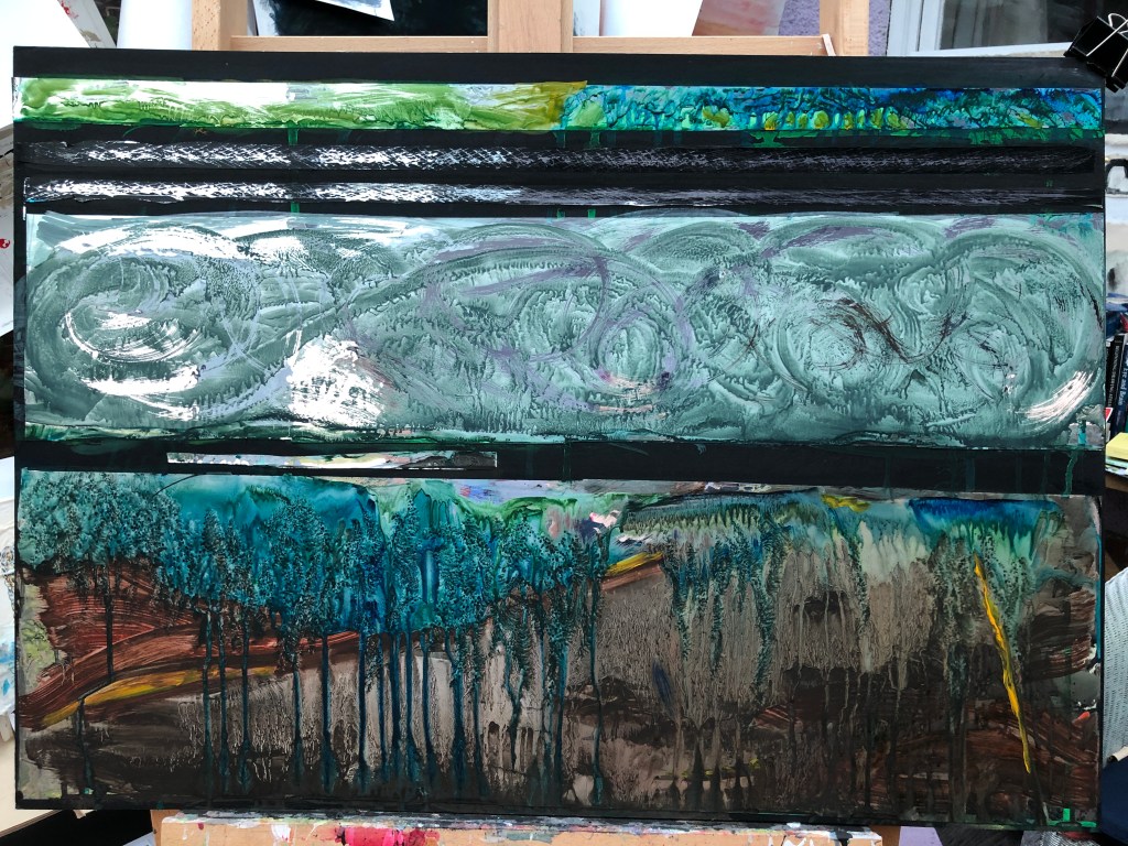 Painting on mirror foil as part of the OCA painting degree course requirements. Based on a lockdown bus ride via webcam from Lancaster to Keswick on damp, dark day. The painting analysis, if you’d like one, is: tiny green/blue strip at the top – roadside trees and foliage; dark strips beneath – the road; wild blue/grey swirls beneath – the leaden sky; and the wide, geological strip at the bottom – the brown and green rolling hills of the countryside.