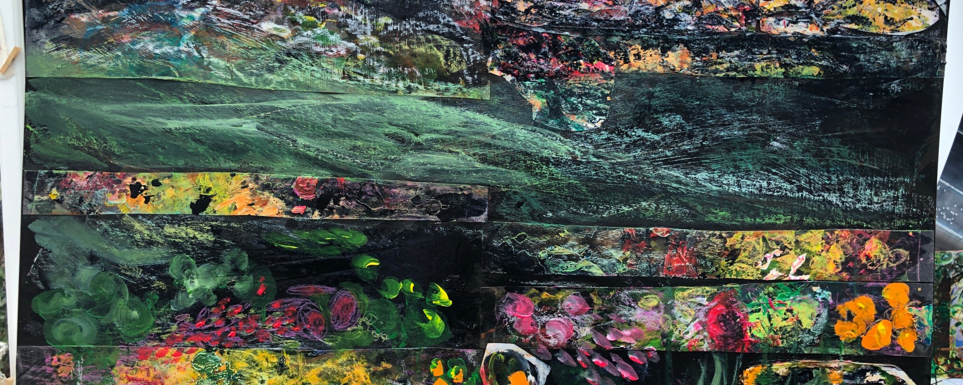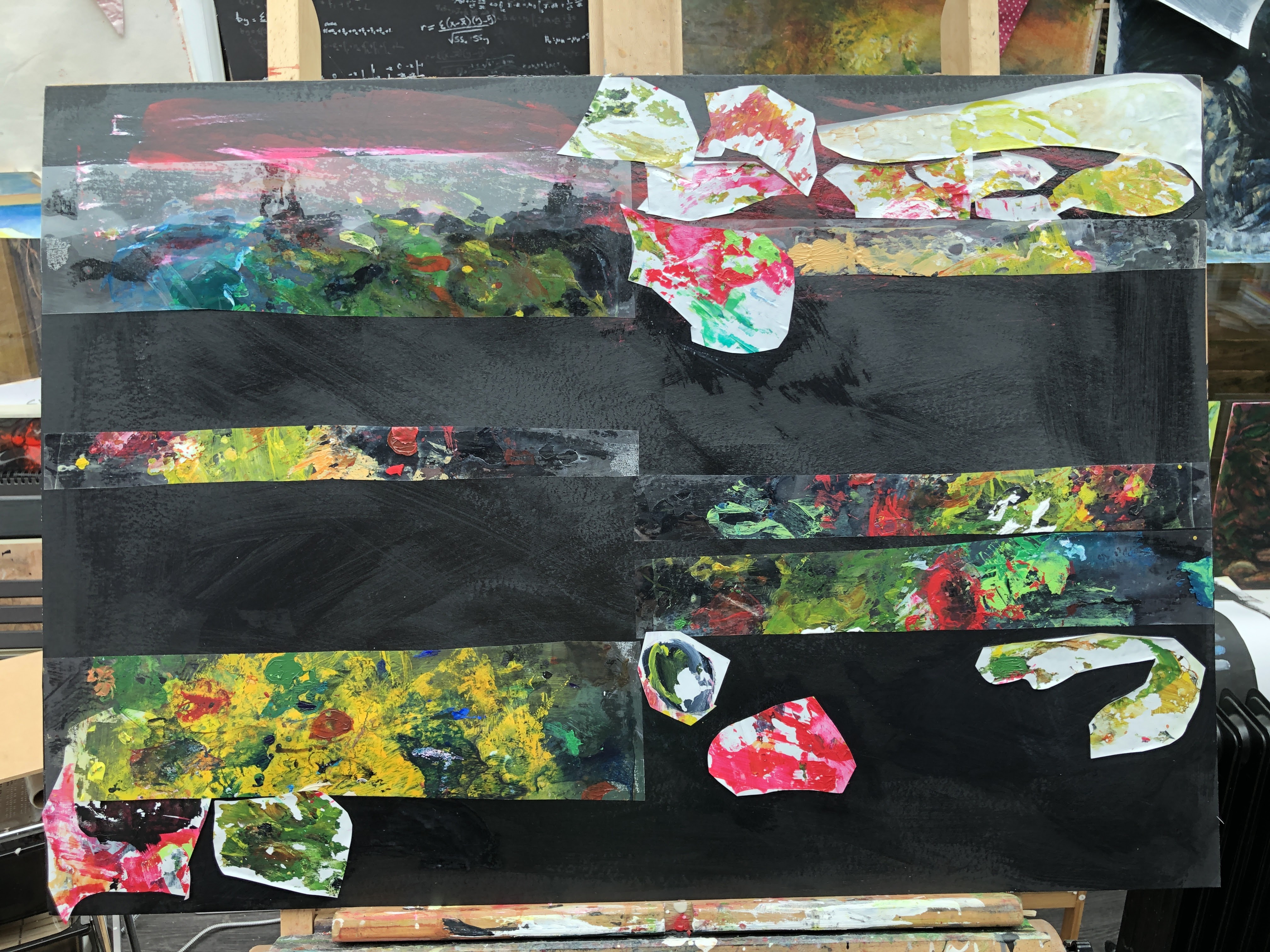 This time it’s black and I prepared it with a layer of gloss medium then added strips of film from my old palette. This too is a bit of a favourite move, partly because, for obvious reasons, it carries the remnants of medium in my favourite colours, but also because whatever shapes and patterns there are on it are unintentional and so they elicit new ideas about what’s emerging. I realise though, that I’ve positioned the strips in predictable horizontals so I will make a note to myself to be more ambitious next time.