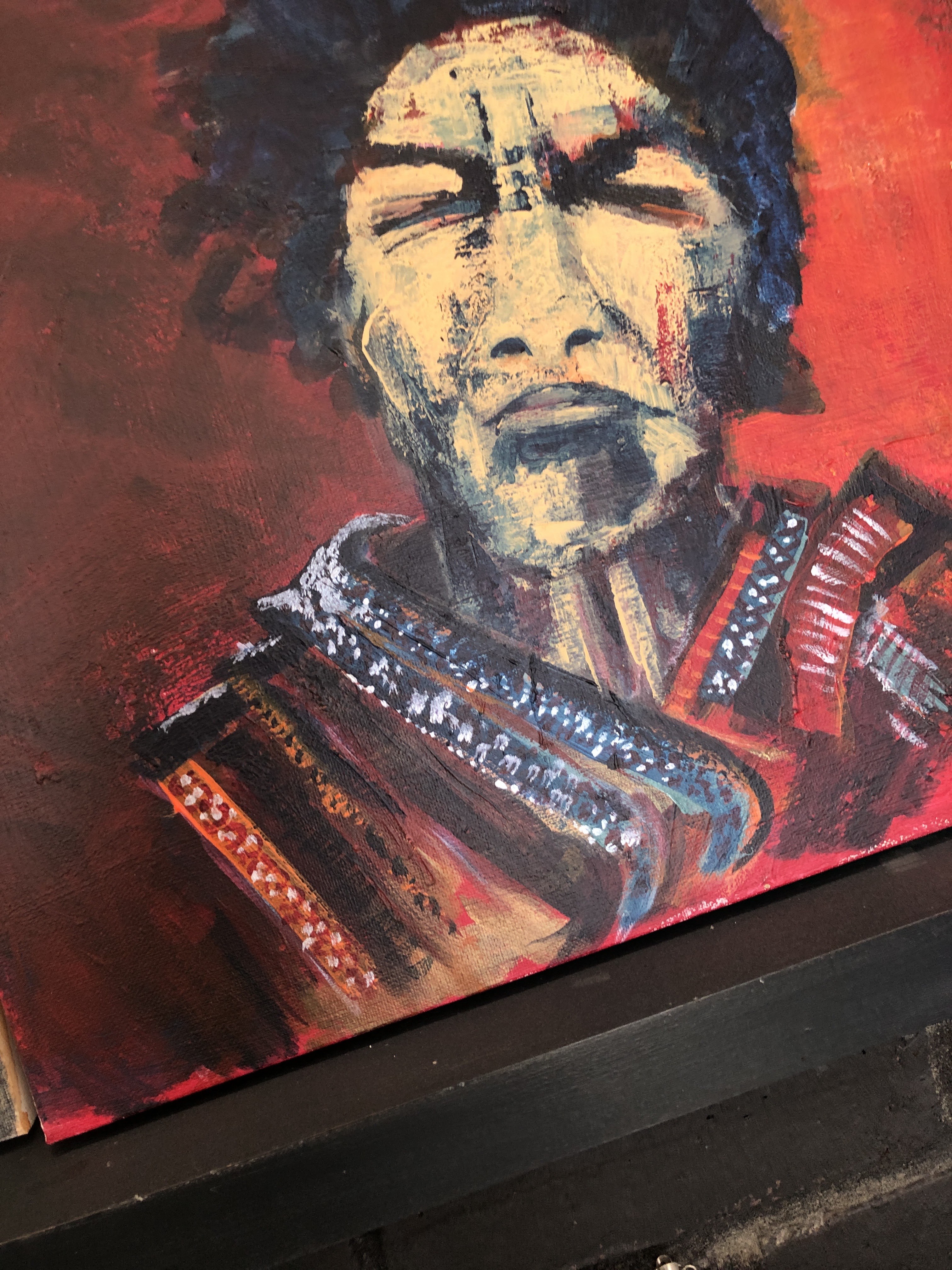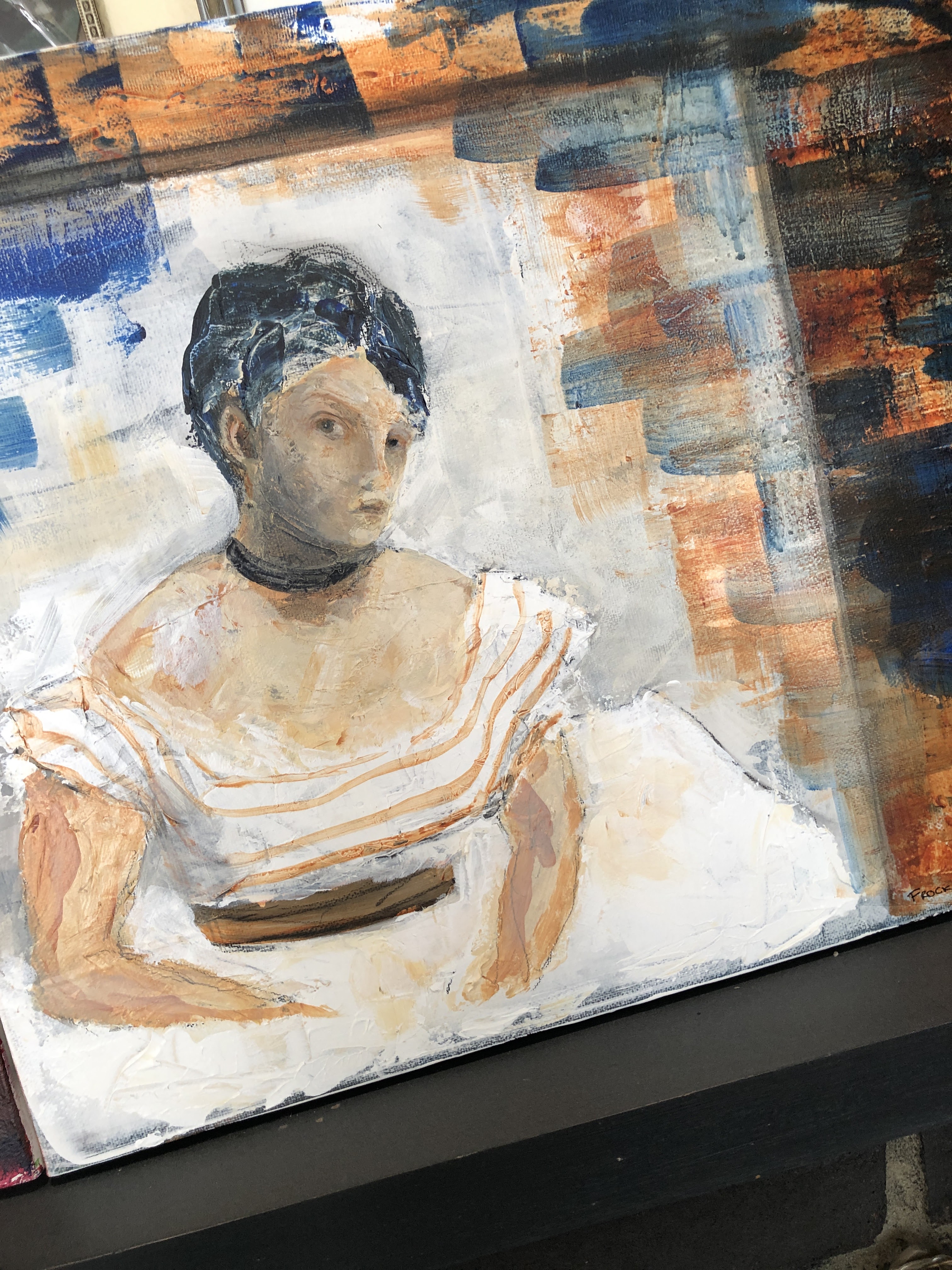 It’s the very divvil to photograph because it’s under glass so you get the whole kitchen in there as well and that really is NOT in the painting. Part paint, part collage, this is acrylics on paper mounted and framed. Definitely best seen in person! Red frame though …