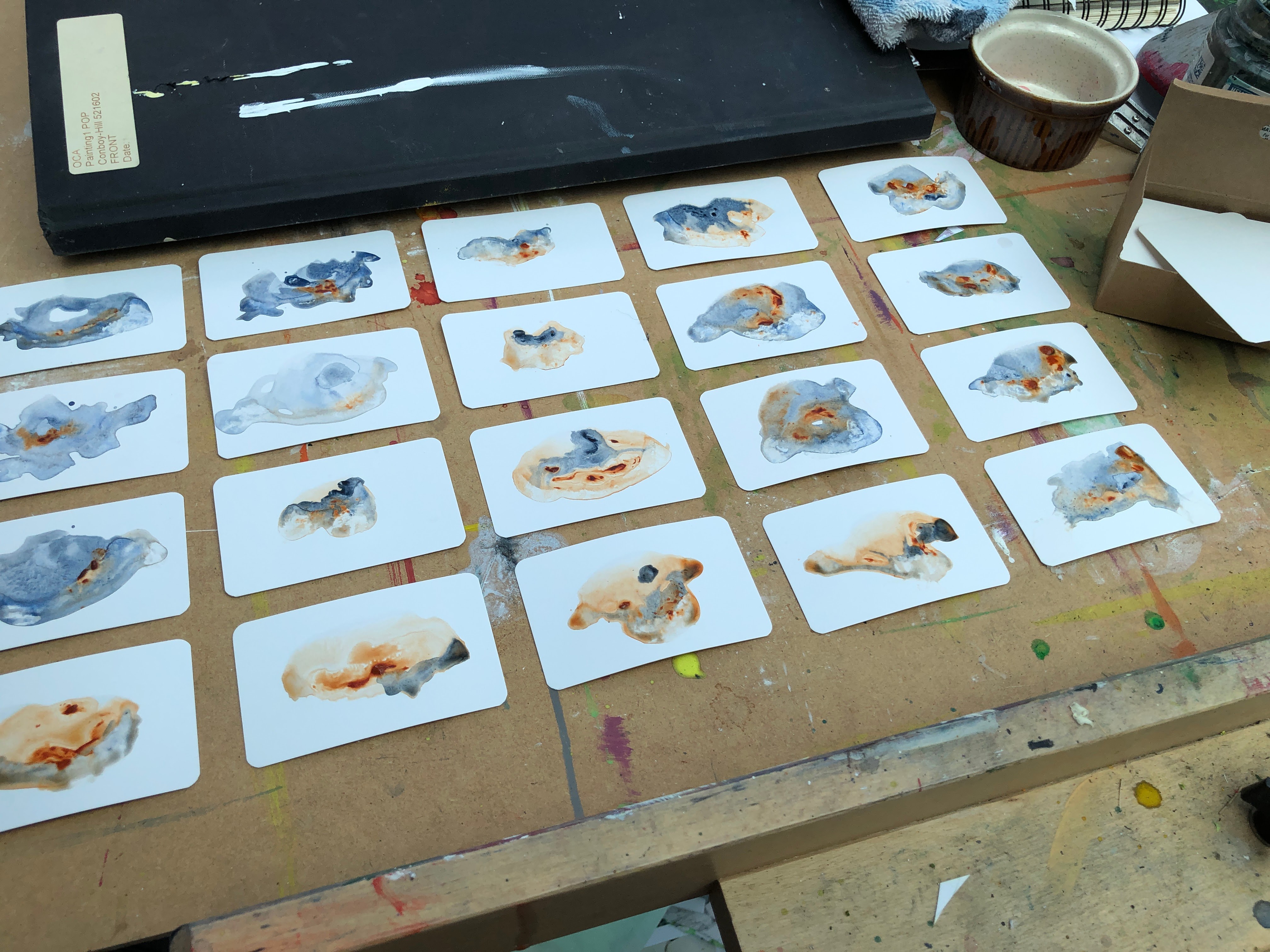 Sometimes you just have to give paint and water the day off to play together. Left to get on with it, these have made some fine little labels and business cards in earth and sky colours. All very abstract although I’m sure I saw a rabbit in one of them!