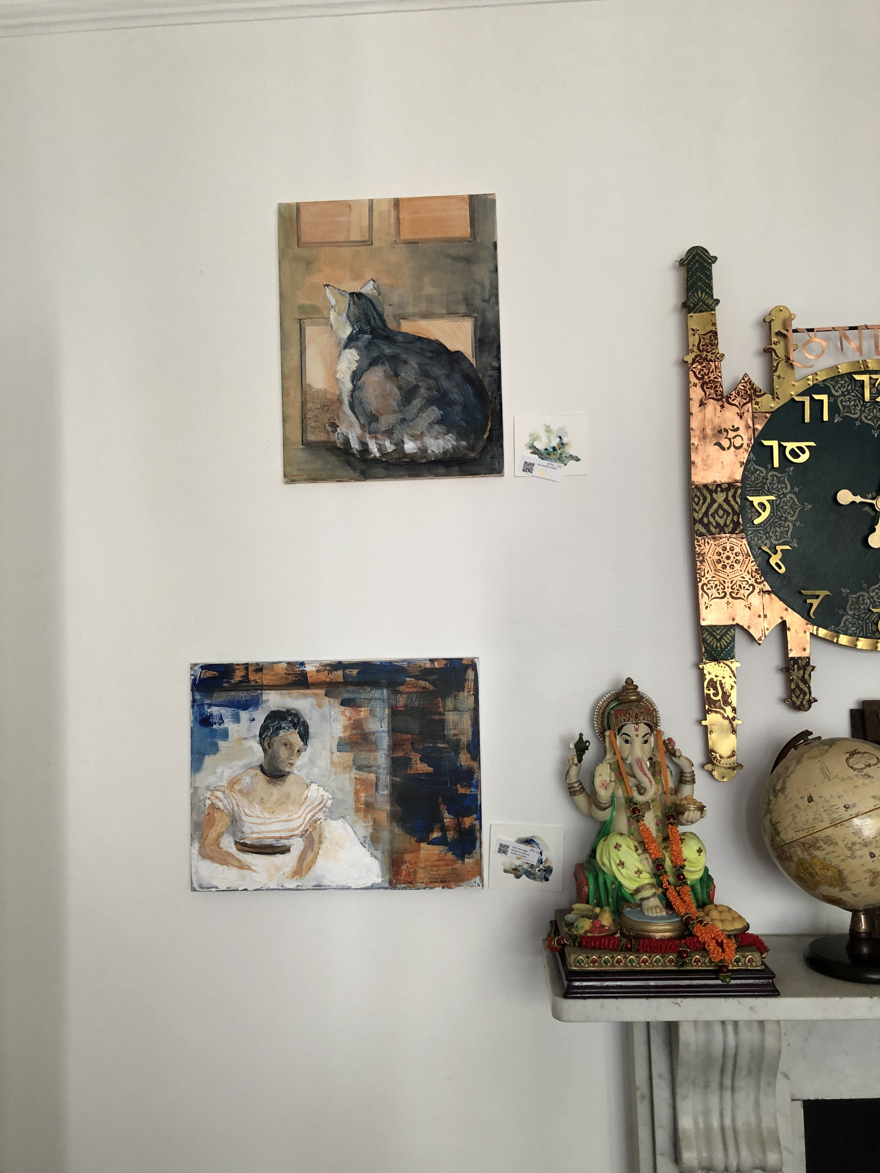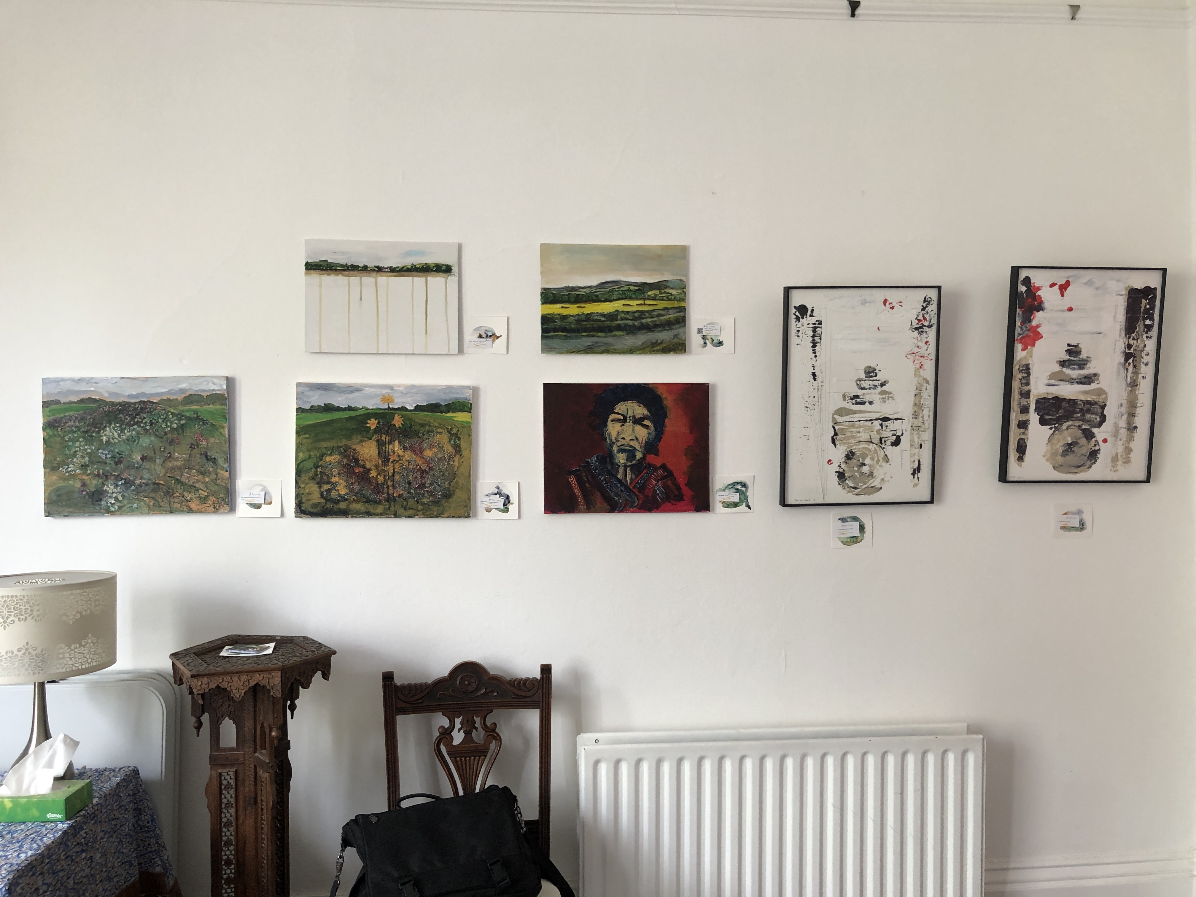 Over night, the picture fairies came in and magically hung my paintings on the vacant wall. Where I had nothing to attach them to, the means of attachment appeared; and where dizzying heights would have dizzied me off the ladder, a sure-footed goat of a helper hung two paintings by barely visible fishing line. Some others had to sit this round out but they’re in a drawer nearby and, like the burglar’s mate, I can spring them any time.