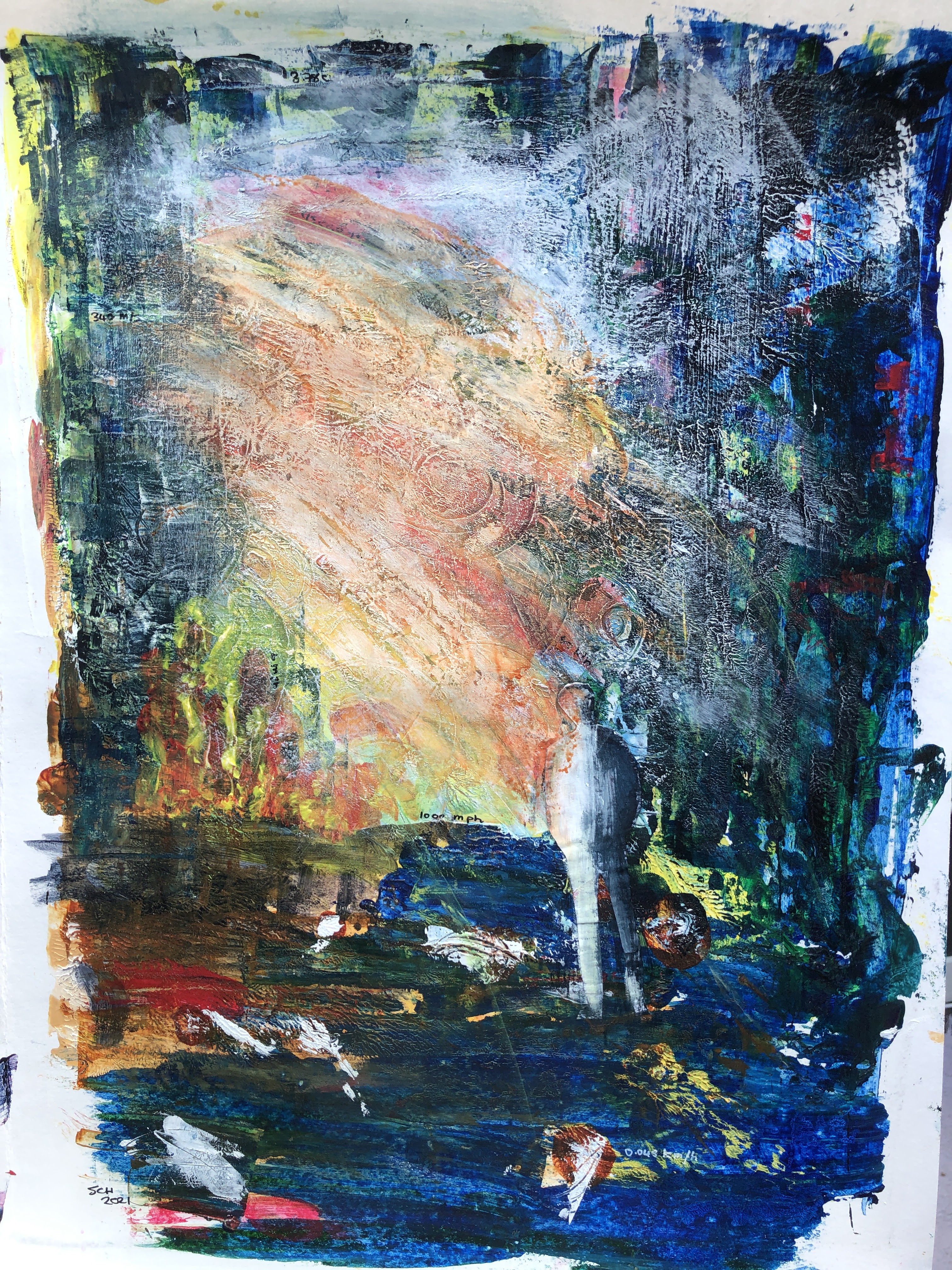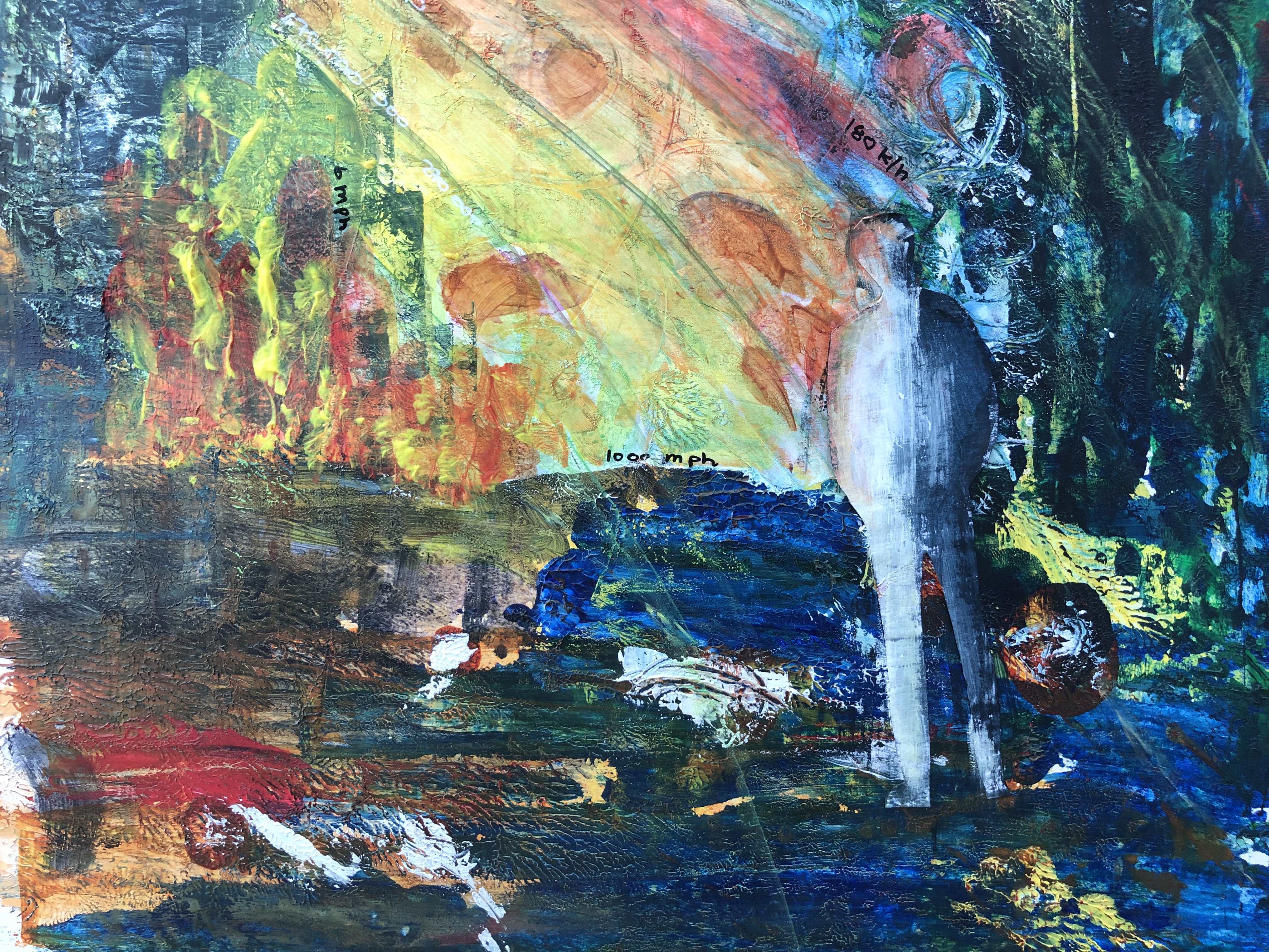 Again I forgot to take photos along the way so the various layers underlying the near-final application are only visible through reduction by scraping and the use of a damp, rough rag. The figure is a piece of paper drawn after a photograph and represents the key character in the poem.