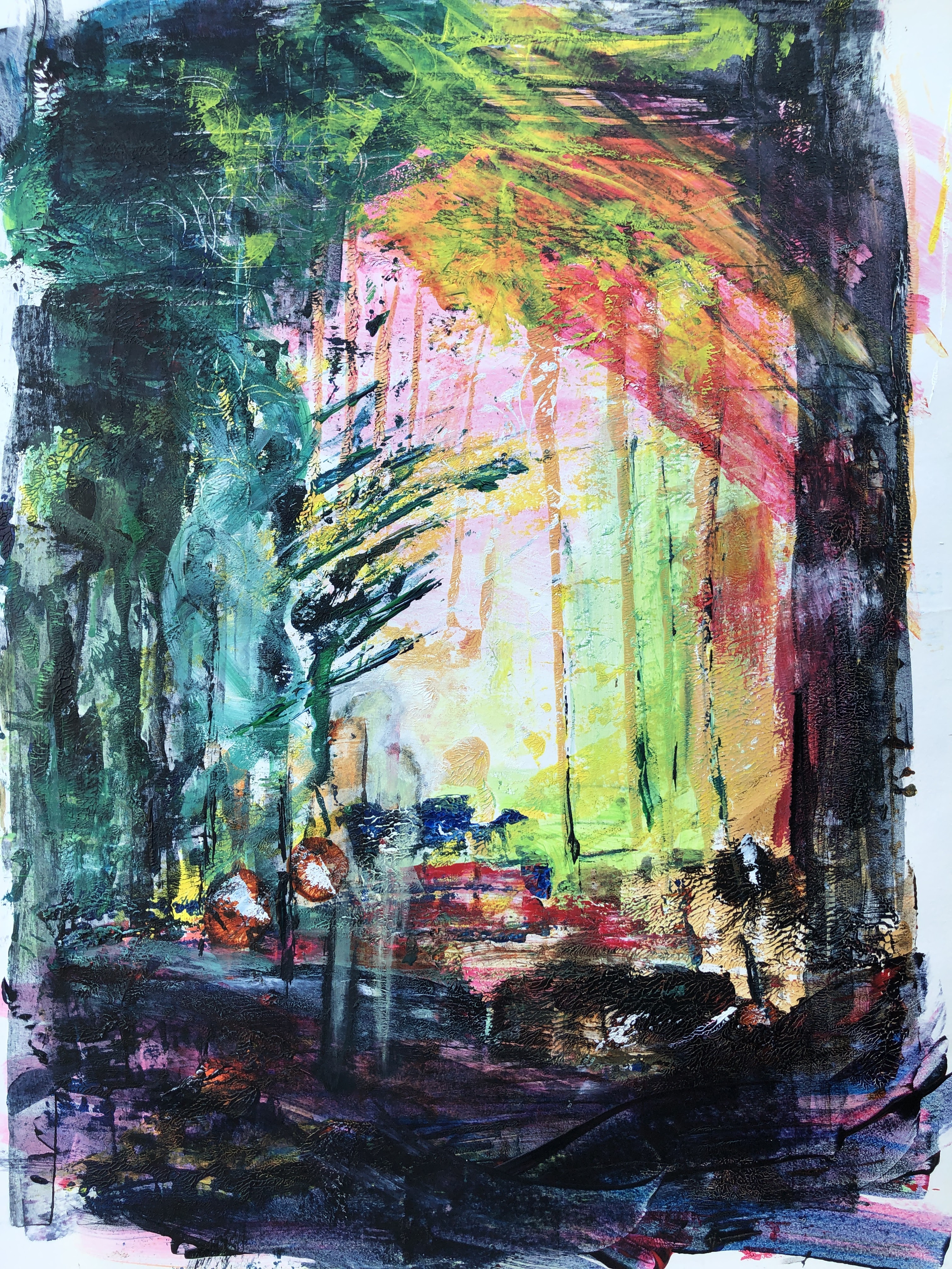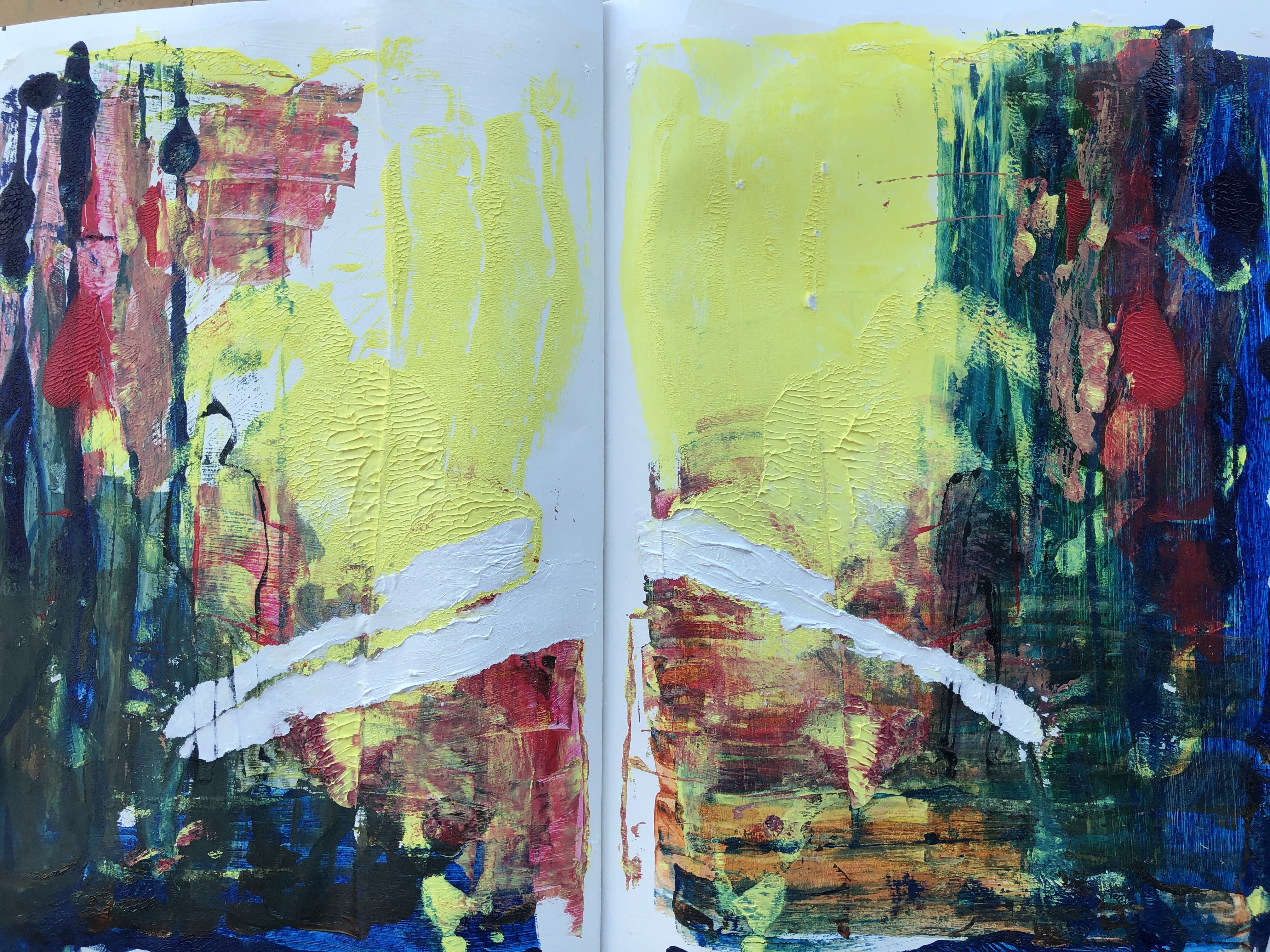 In fact only minutes after writing that sentence, I realised two things; first, that it looks too much like the book cover which seems now to have been accepted by the publisher; and second, that I don’t like the rip. I’m also feeling that the sketchbook idea is a bit cheap and this deserves better. So tomorrow I’ll take the idea onto an A1 sheet folded to make A2 sized spaces for a painting and its print because what I do like about the sketchbook work is the print. Then I’ll use the text to inform the shapes more than I have here, and change the palette to be more consistent with the context set by the poem. Re-reading is a valuable tool, and also very satisfying when the material is so beautifully written.