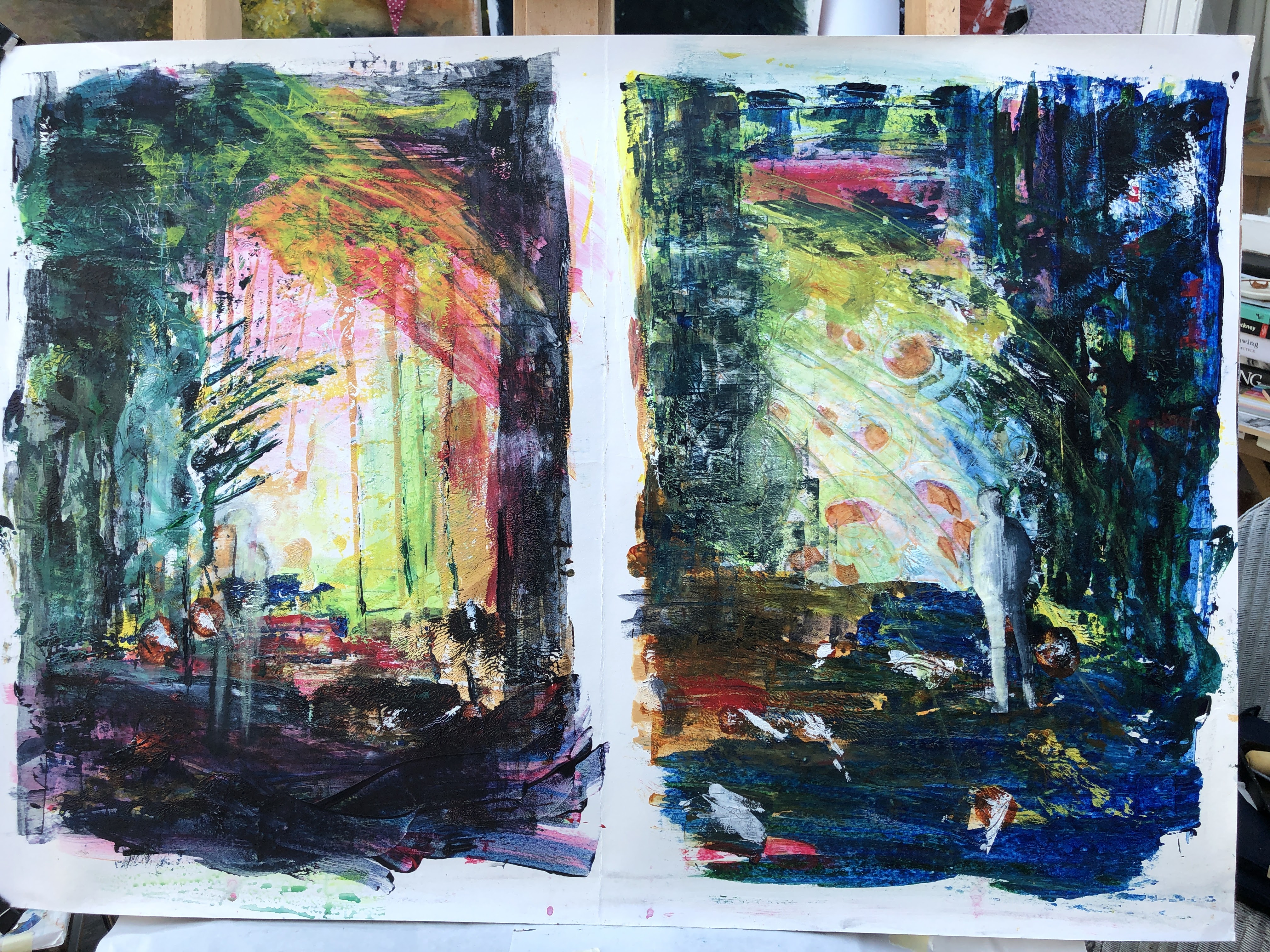 I forgot to take photos of the earliest stages so a description will have to suffice. This is an A3 sketchbook which I’d prepped with white primer before pulling and pushing pigment across it using a silicone pebble. The left side is a print of the one on the right but with additional brush marks, and the rip across the middle is, to my mind, a fortuitous reflection of the poem’s content (see line 2).