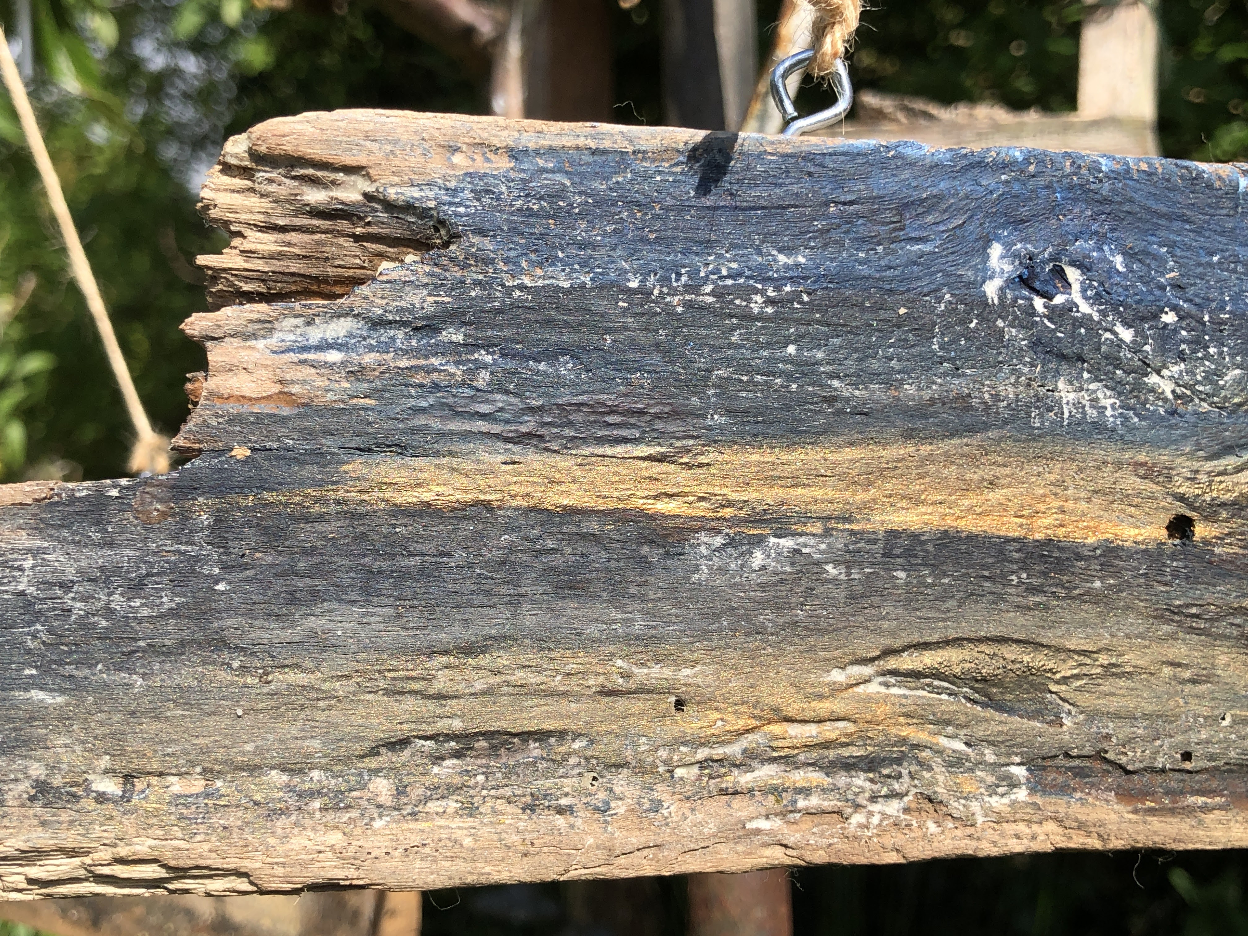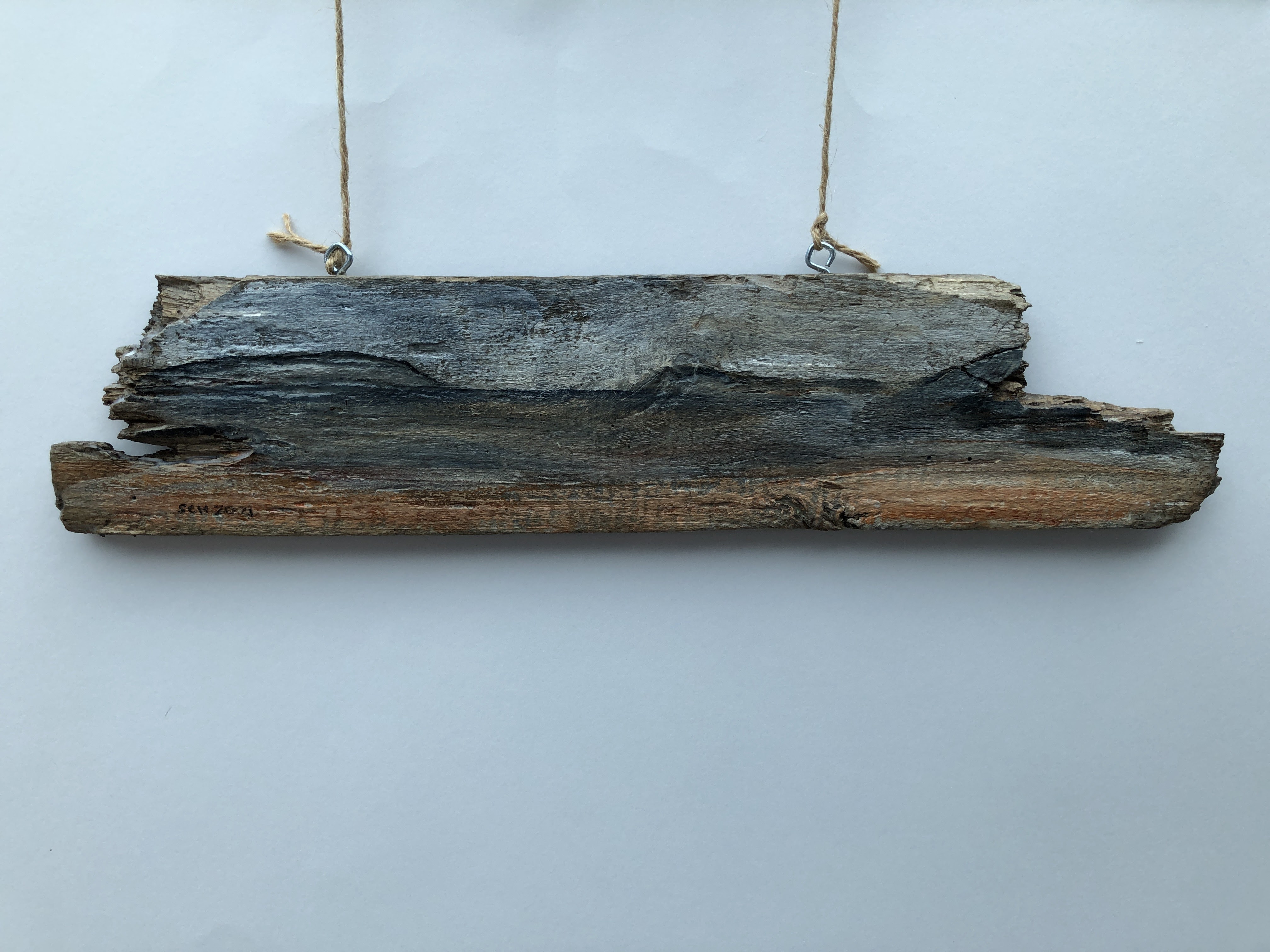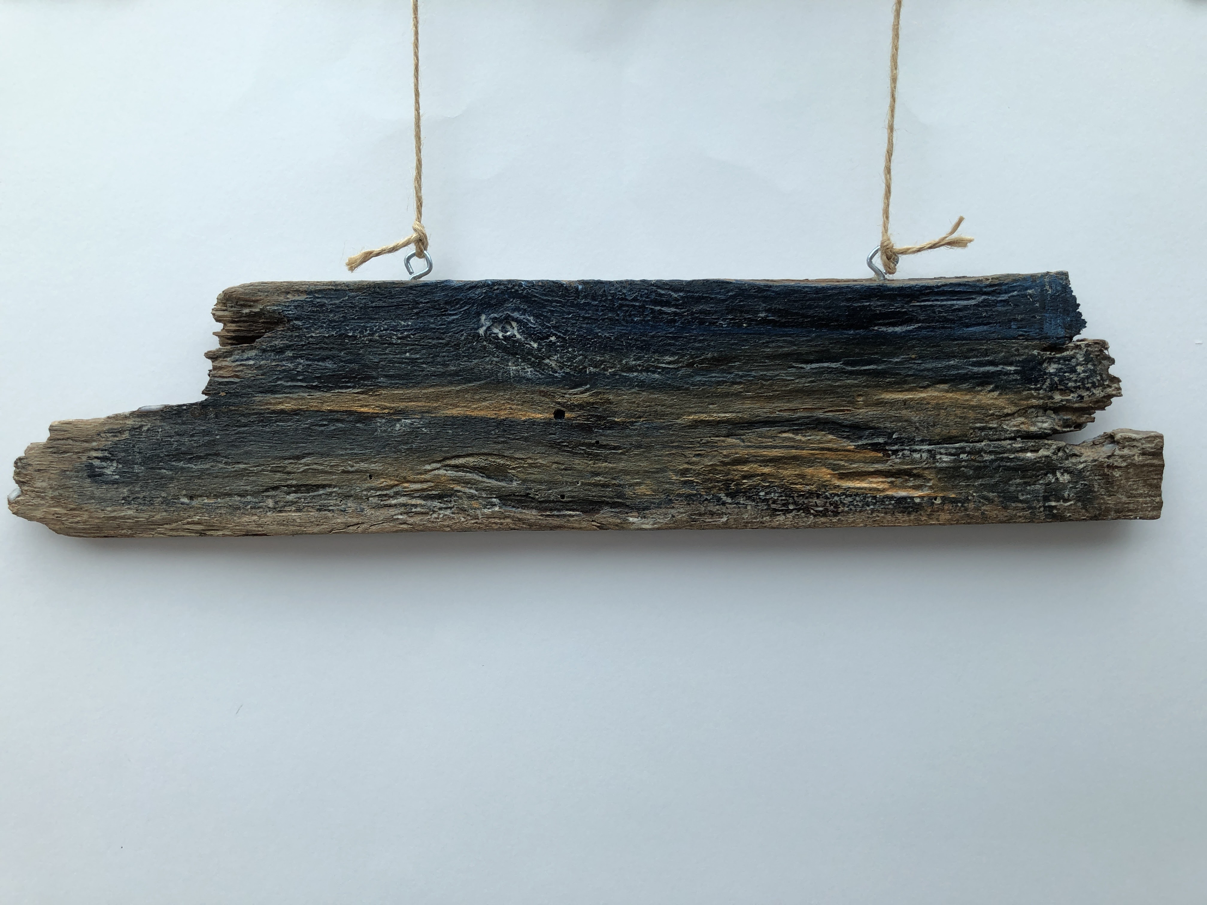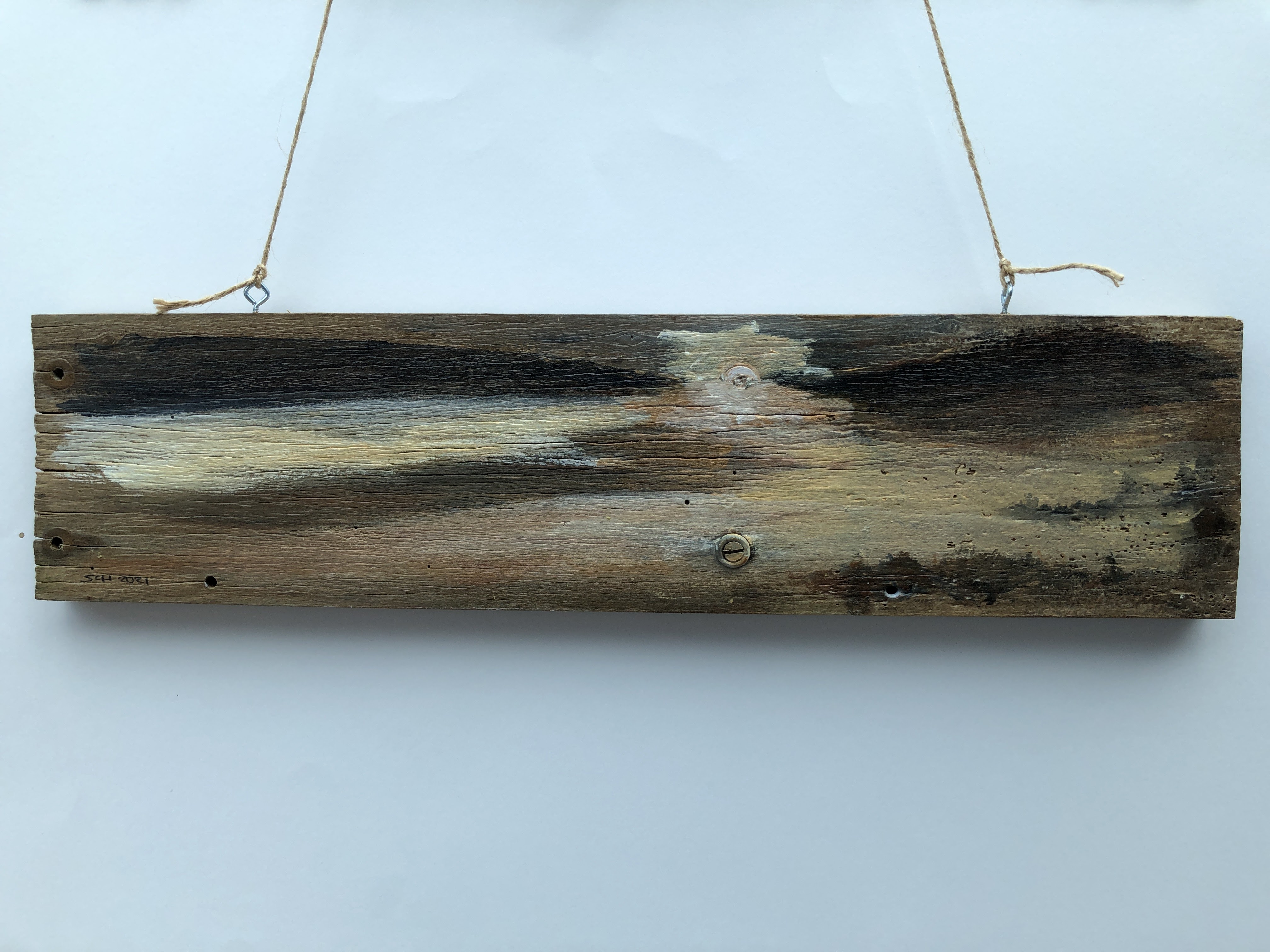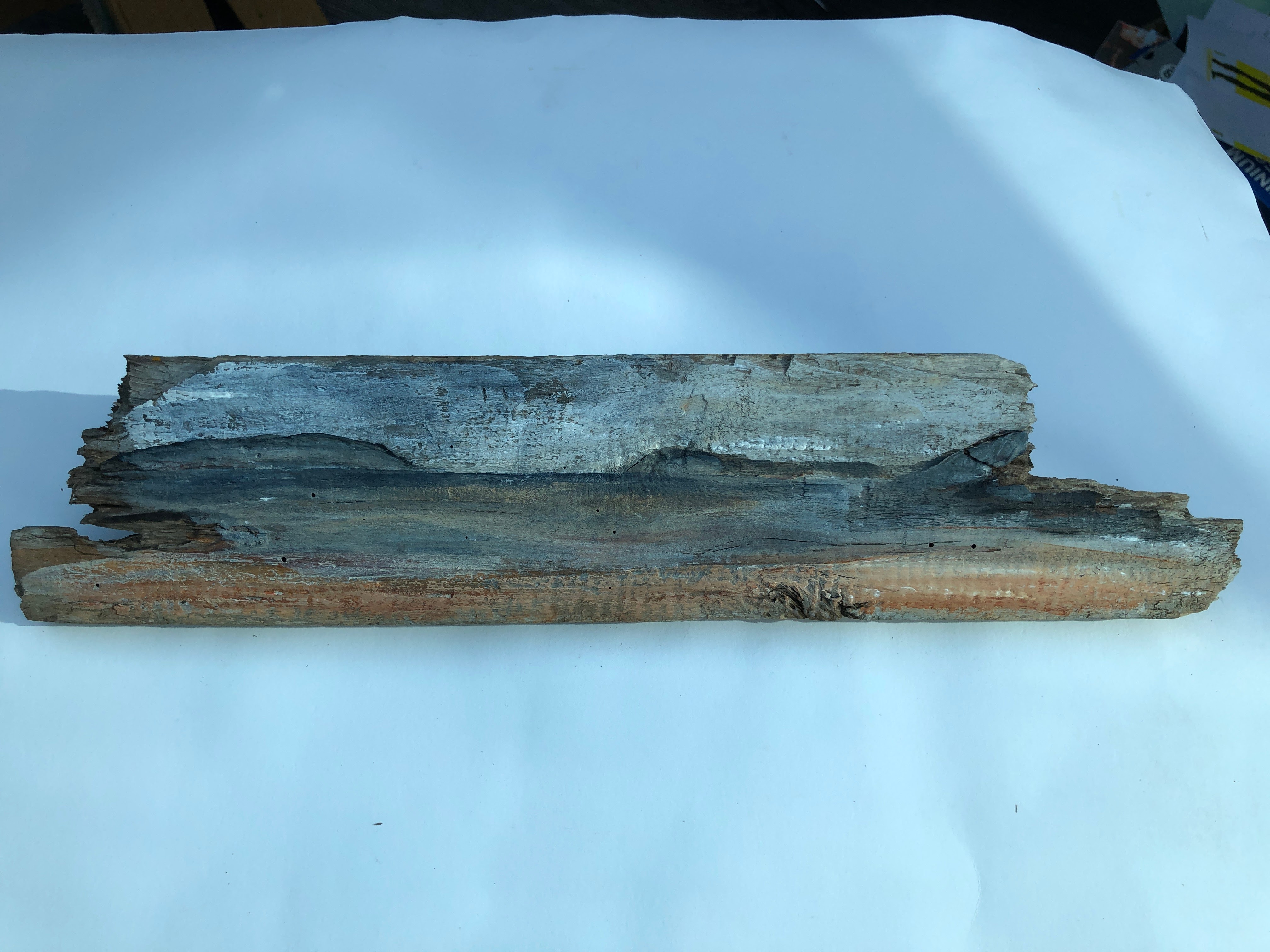 9th September. Was there ever such a mess? There are some halfway decent ideas here but ultimately it’s the dog’s breakfast even a labrador would turn down. My reaction has been to paint pieces of driftwood, making landscapes of the lines in the wood and sealing them with furniture polish. As an ultimate economy, I’ve used both sides.