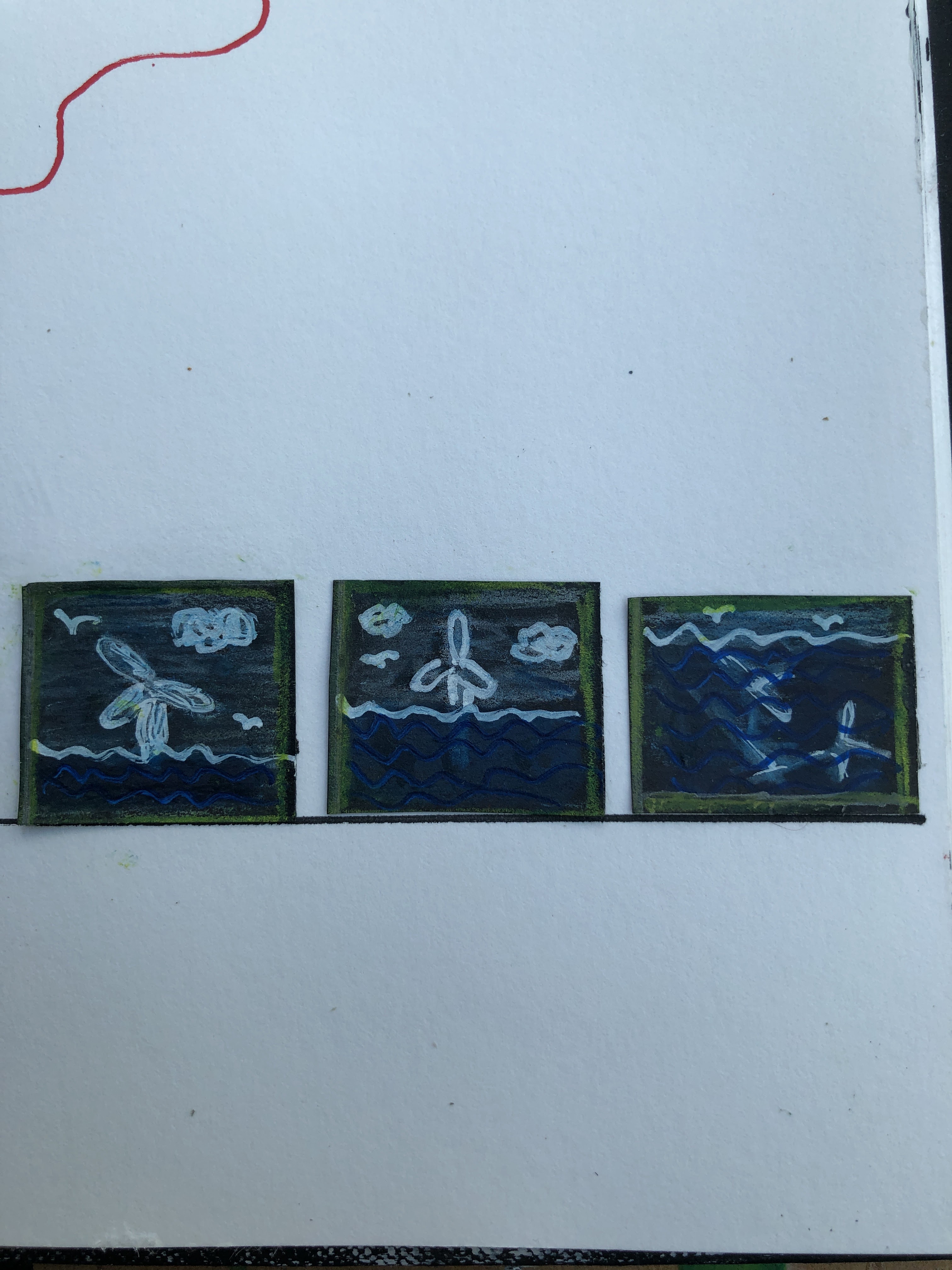 This is the somewhat erratic hockey stick curve that illustrates global warming, the last uptick causally coinciding with human activity, specifically post-industrial revolution. The three small pictures are watercolour pencil drawings of a gradually submerging wind turbine. I’m thinking this needs a very simple but unrelated ground – like bland wallpaper – and maybe steps instead of the flowing line. The tiny drawings are quite difficult to make so I’m tempted to draw them bigger so I can see what I’m doing then reduce them to thumbnails in my photo edit app. The counter argument is that the clumsy naivety rather reflects our position. I think this composition qualifies as mitigation because, although we seriously need to step on it, there is increasing effort being put into renewables.